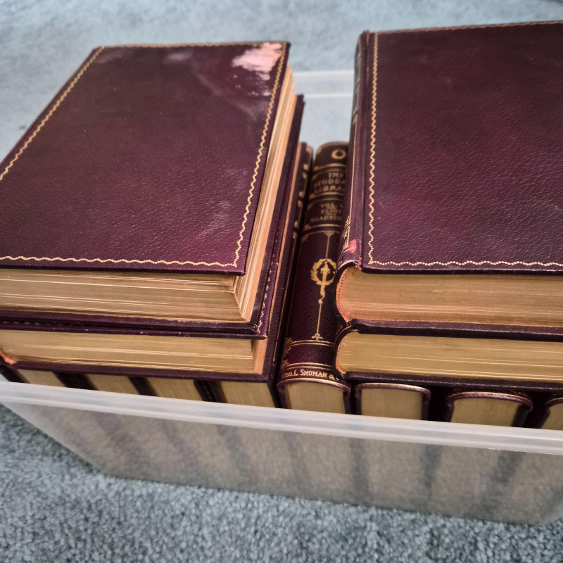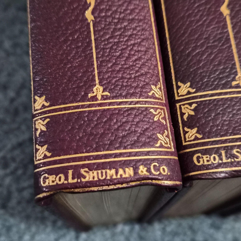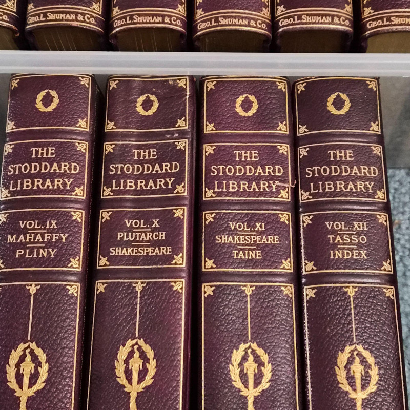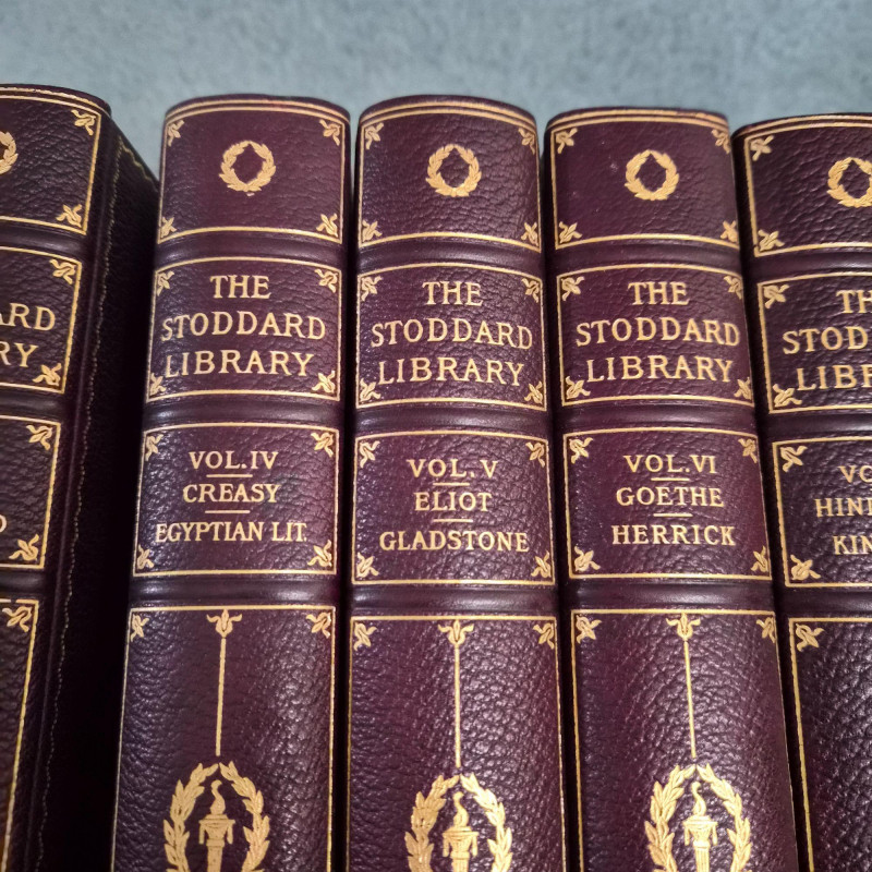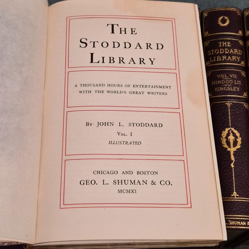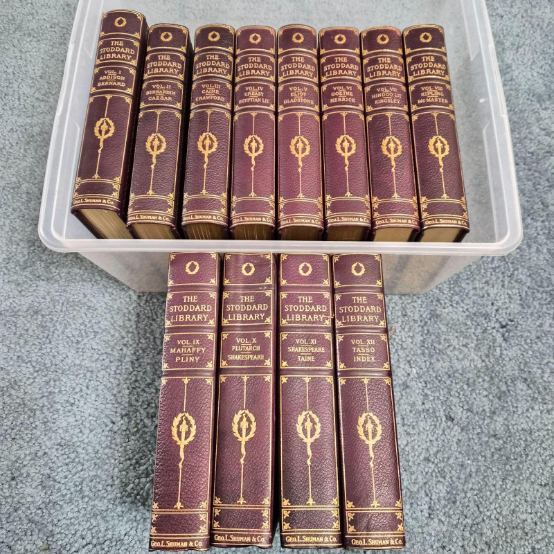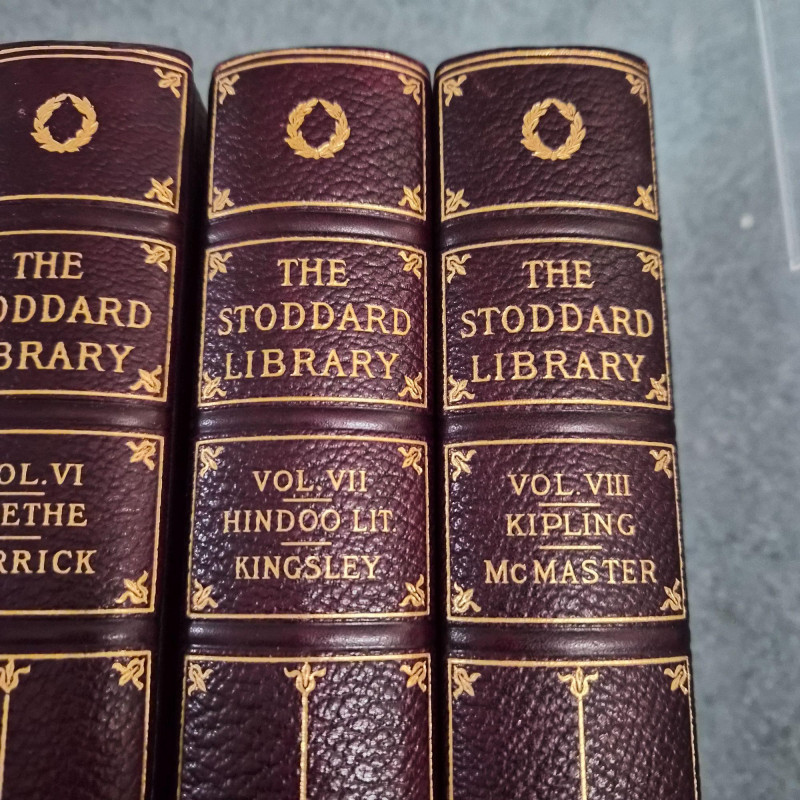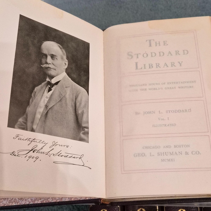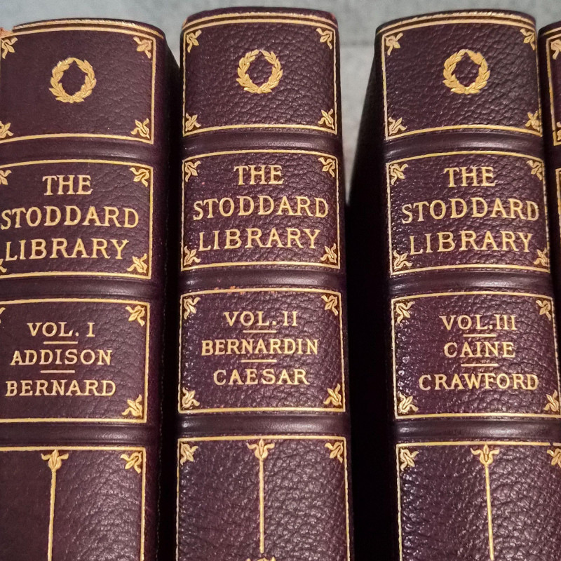 Stoddard Library leatherbound hardcover, complete set if 12 volumes. The date on the inside of the books is 1910. The books are starting to show slight signs of wear to the leather/pages but still in good condition for their age.