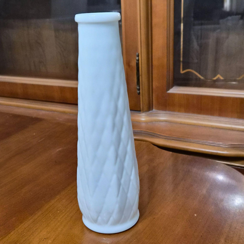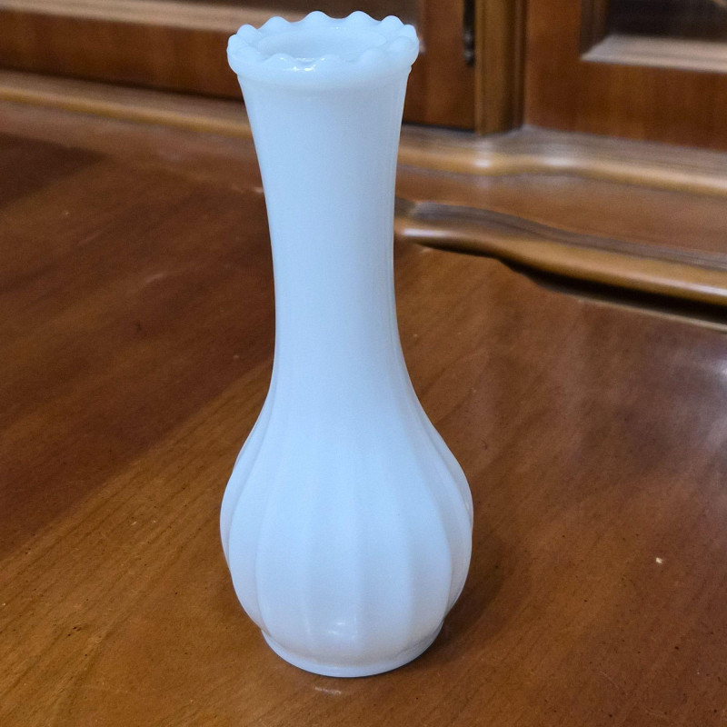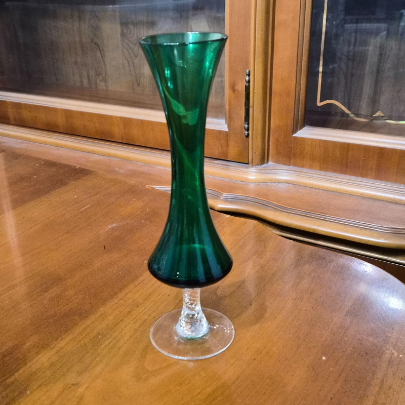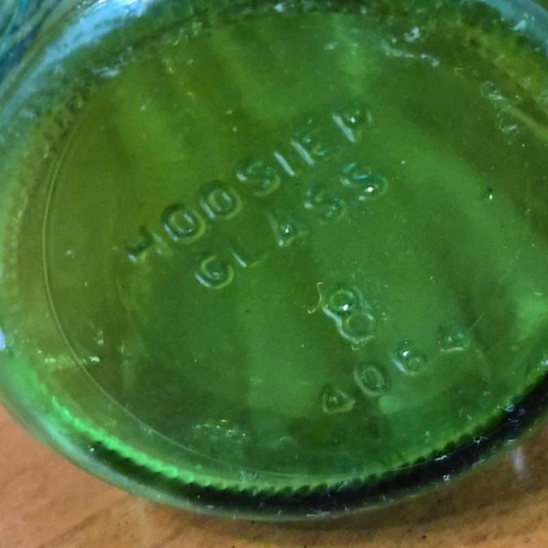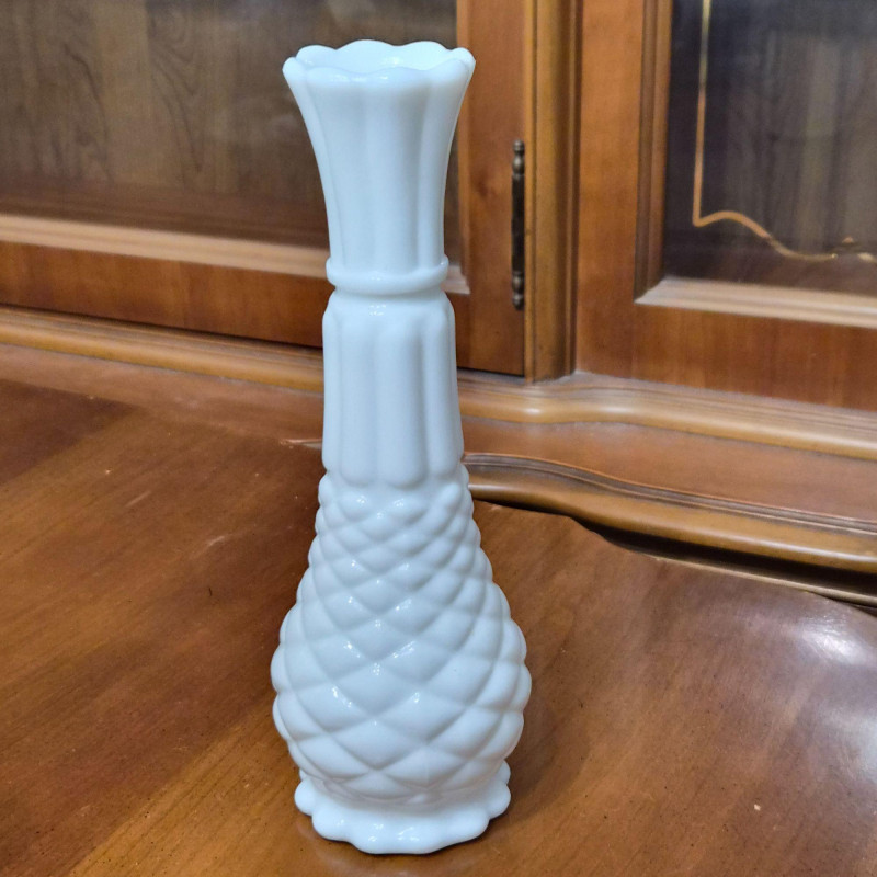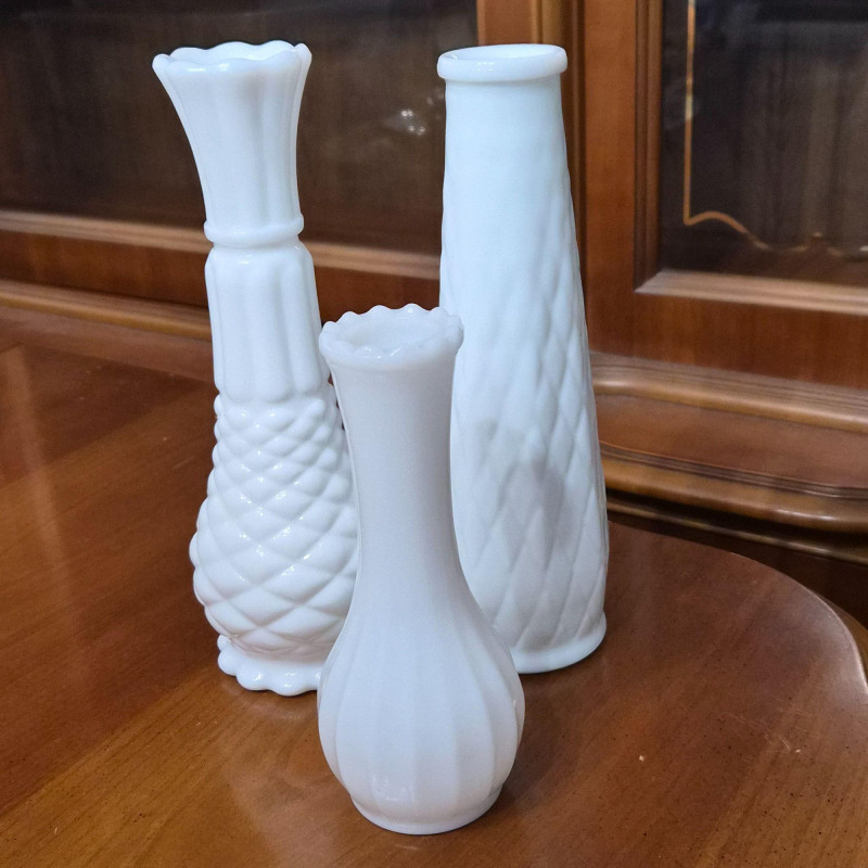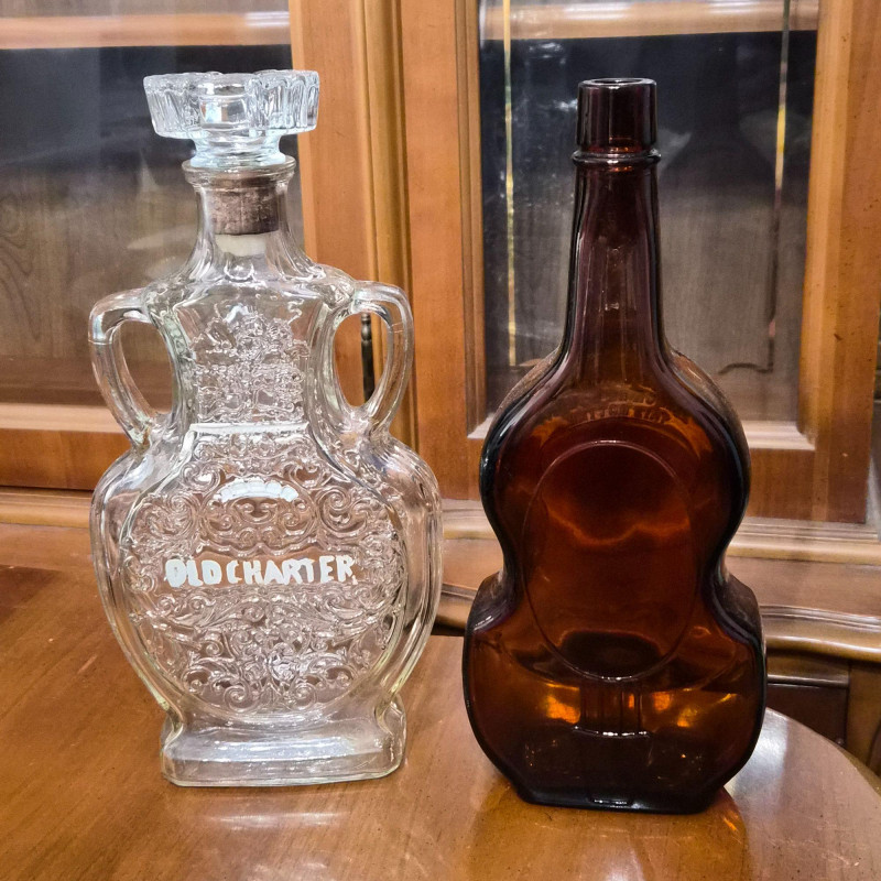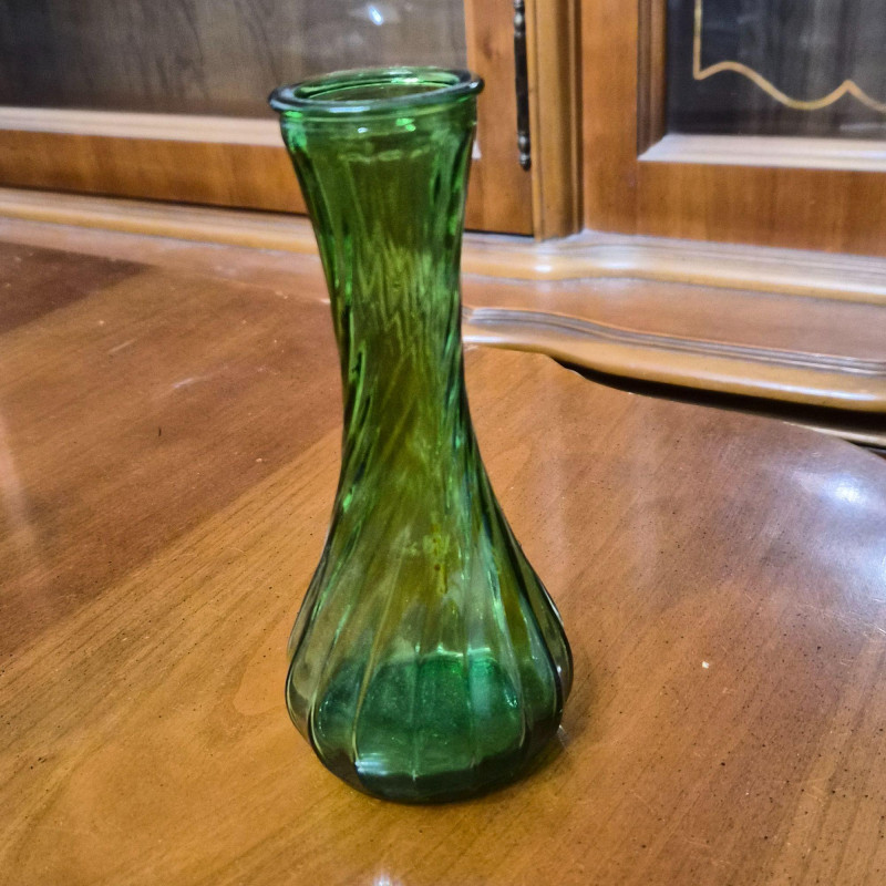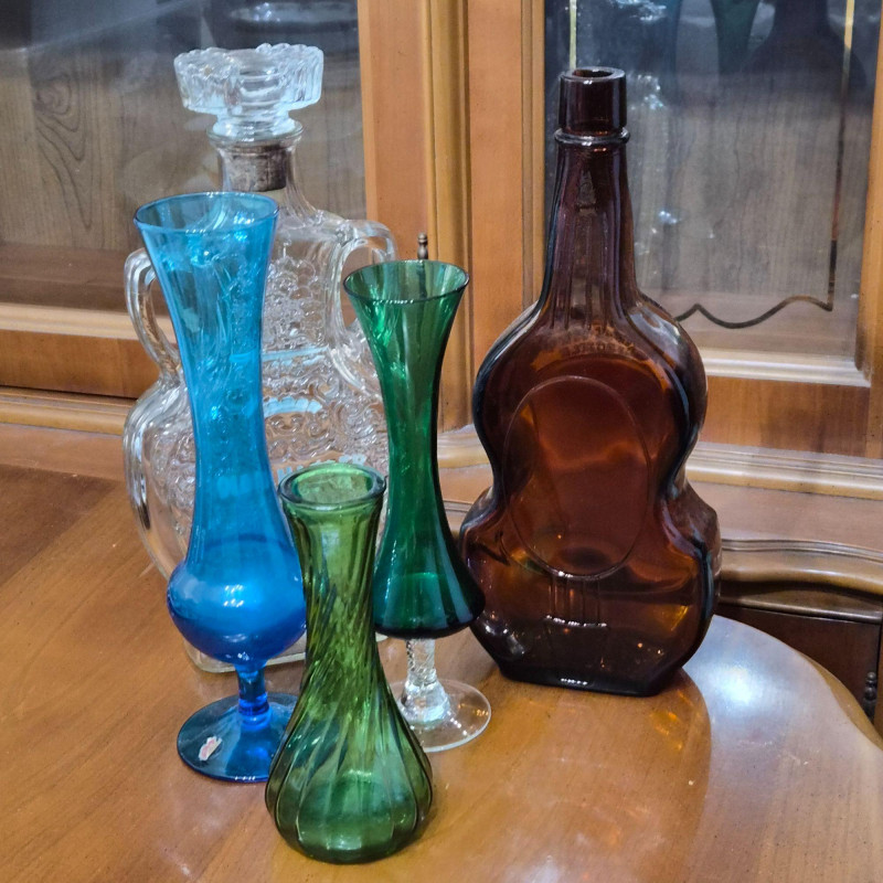 Collection of colored glass vases: Teal blue vase, Italy. Green swirl pattern vase Hoosier glass. Green mid-century bud vase. Brown glass violin bottle. Clear glass Old Charter double handled bottle/decanter with stopper. Trio of milk glass vases.