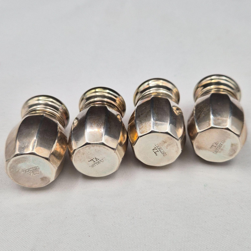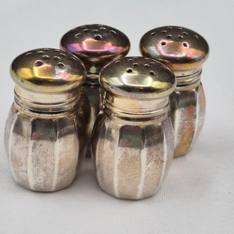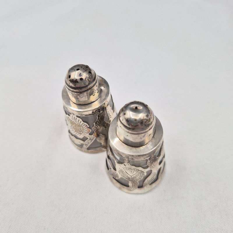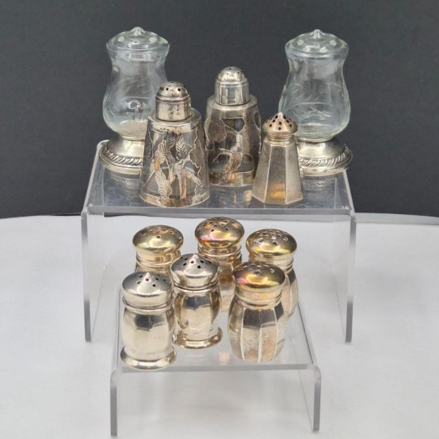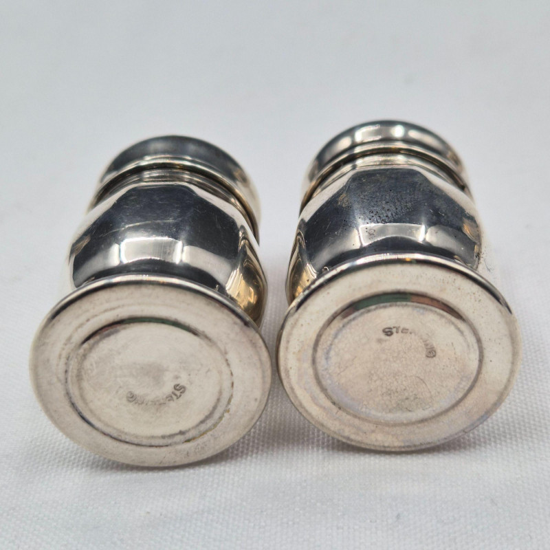 A charming assortment of sterling silver salt and pepper shakers, each stamped Sterling or 925 to confirm authenticity. This curated mix includes varied sizes and designs, offering visual interest whether displayed together or incorporated into a silver collection. Perfect for collectors, tabletop stylists, or creative repurposing projects, these petite shakers bring a touch of classic elegance to any setting. The group is pre‑owned and shows light patina consistent with age, enhancing their vintage character. Weight reflects silver only—glass liners were removed prior to weighing—bringing the total to over 60 grams of sterling silver.