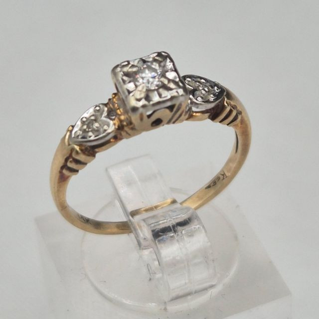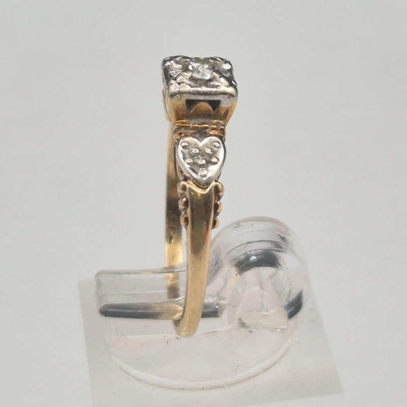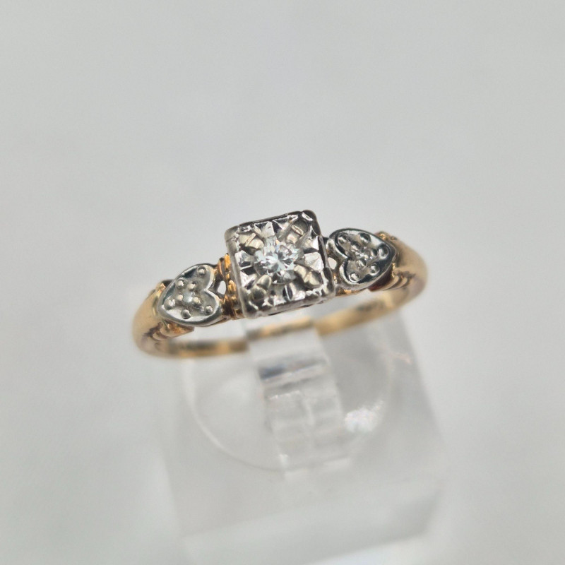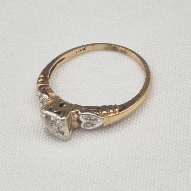 A Heartfelt Keepsake in Gold & Sparkle: A tender little treasure from a bygone era, this antique 14k gold engagement ring blends romance, craftsmanship, and timeless sparkle. At its center rests a bright round diamond, framed on each side by a charming heart motif accented with additional diamonds — a symbolic nod to love past and present. The center and side settings are crafted in white gold to enhance the brilliance of the stones, while the band glows in warm yellow gold for a classic two‑tone look. Petite and graceful, this ring makes a beautiful keepsake, promise ring, or heirloom engagement piece.