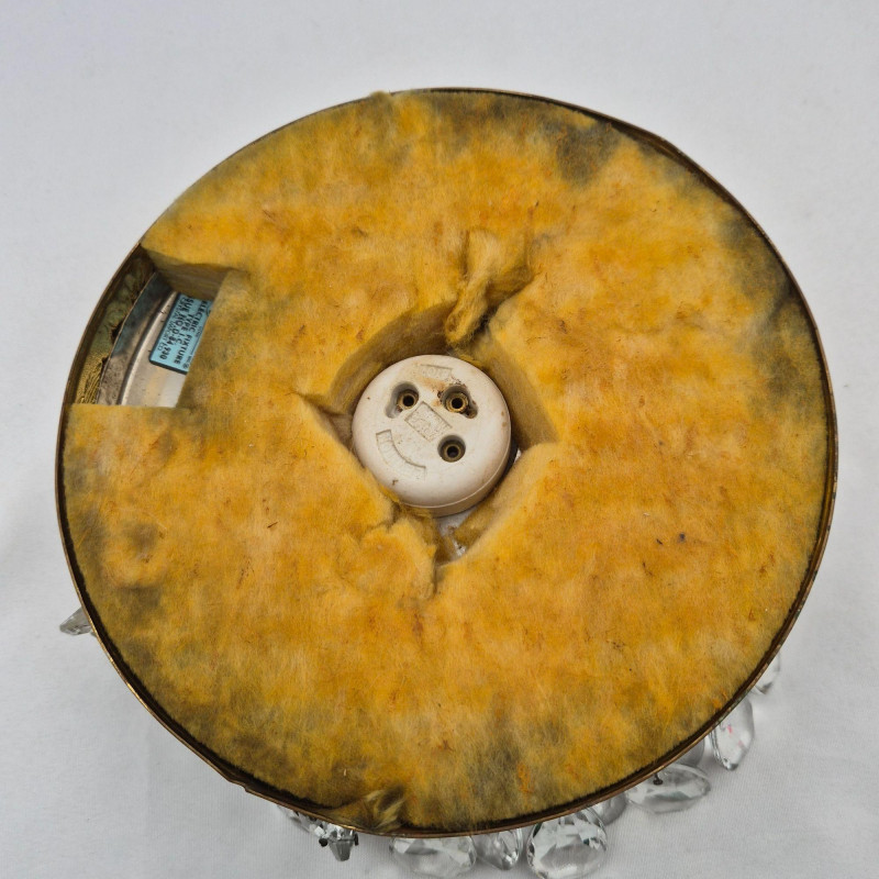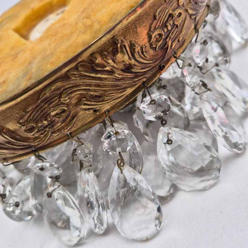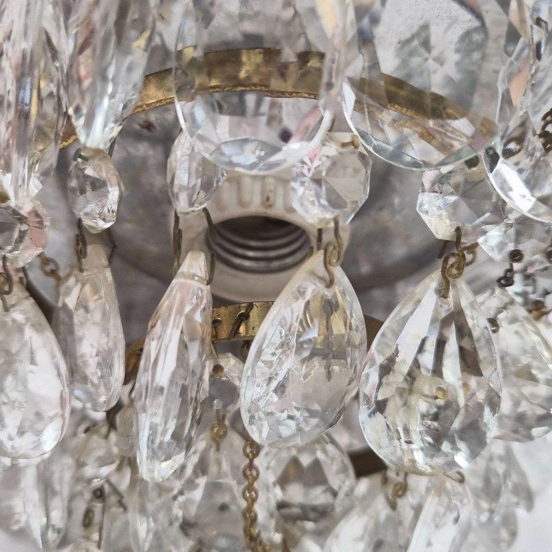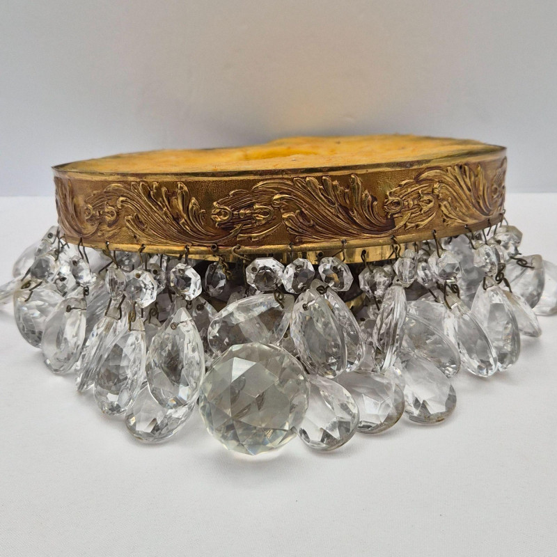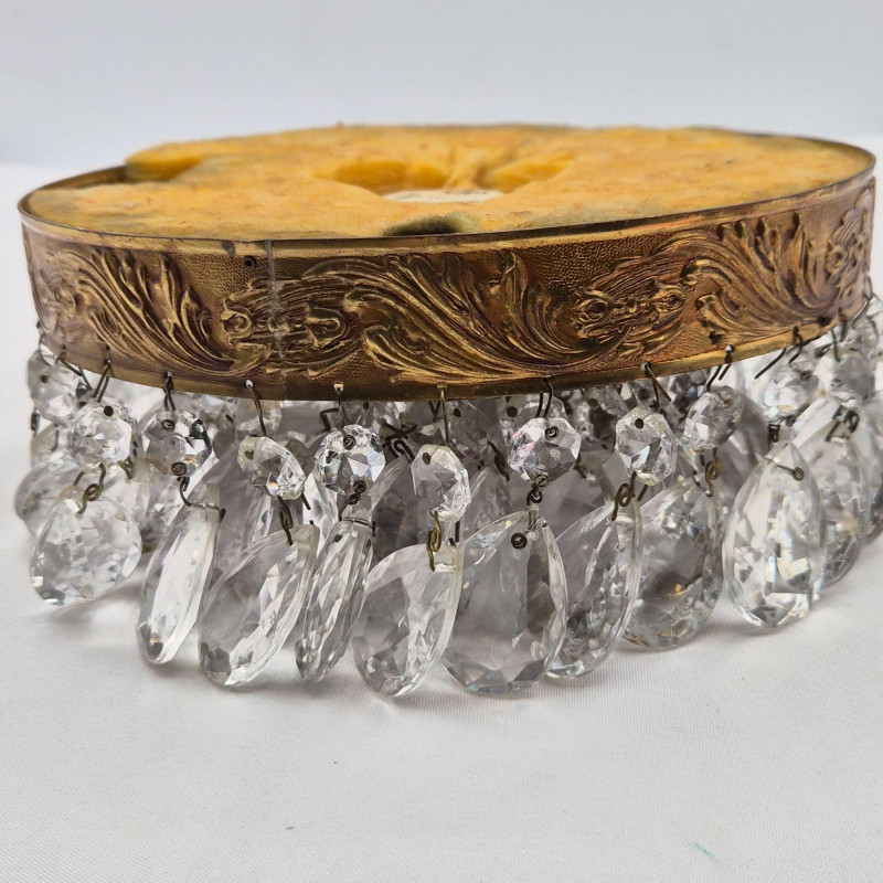 A delicate vintage crystal chandelier, measuring 8" x 8", with a brass or gold‑tone frame and elegant glass detailing. Features include: Perfect for restoration, repurposing, or use as a decorative accent in a boutique space or vintage‑inspired interior.