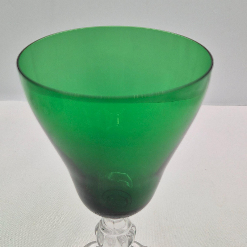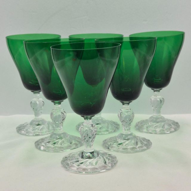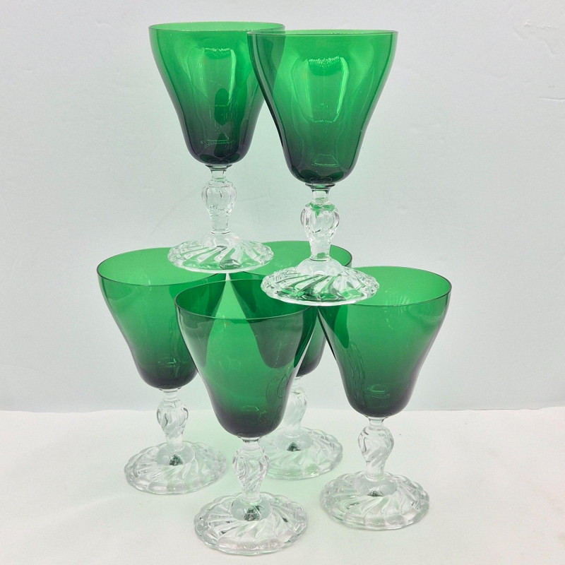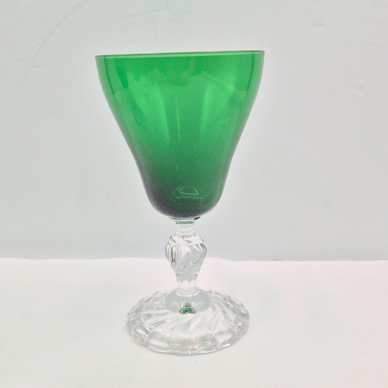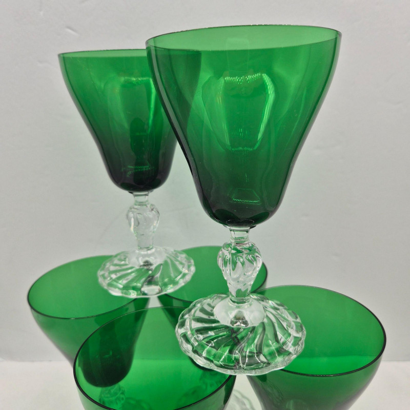 A graceful set of six blown Fostoria “Colonial Dame” goblets, featuring the beloved emerald green Empire top with a clear, bulb/twist stem and base. These vintage glasses offer that unmistakable Fostoria clarity and weight, with a silhouette that feels both colonial‑inspired and timeless on a modern table. Production years for this pattern was from 1948-1964. Each goblet measures approximately 6.5" tall x 3.5" wide, ideal for water, wine, or display in a curated glass collection. They hold approximately 11oz. A beautiful way to bring color and classic American glass craftsmanship into your home.