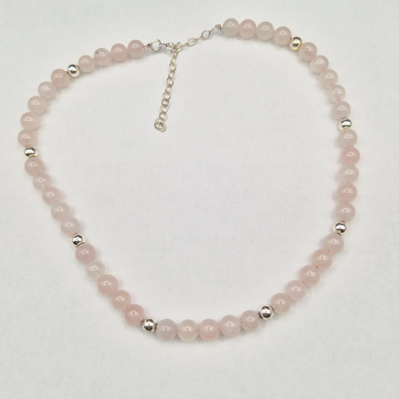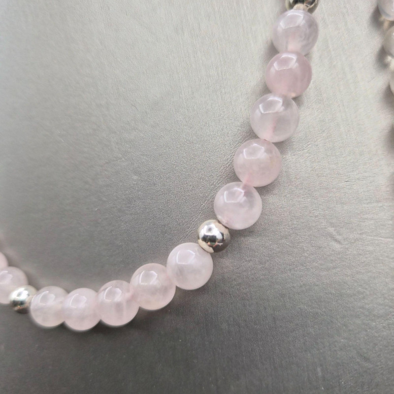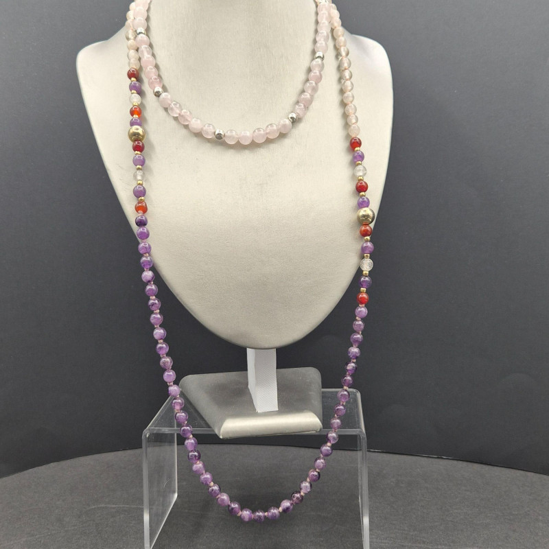 A refined pairing of polished gemstone necklaces, each offering its own quiet elegance. The first is a natural Pink Quartz bead necklace, hand‑polished to a soft glow and accented with silver beads and a sterling 925 clasp. This shorter 16" strand sits beautifully at the collarbone, adding a gentle blush of color. The second necklace is a continuous 32" strand of light Pink Quartz, Amethyst, and Carnelian beads, finished with warm gold‑tone spacers. Its longer length invites layering, looping, or wearing as a single fluid line of color. Together, these pieces create a versatile gemstone ensemble that moves effortlessly from daytime subtlety to evening sophistication.