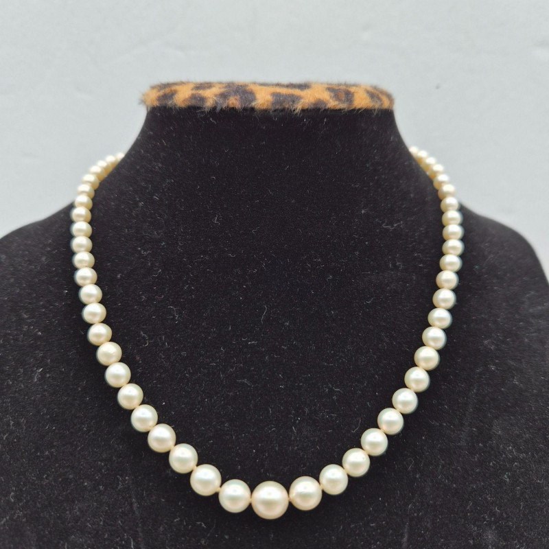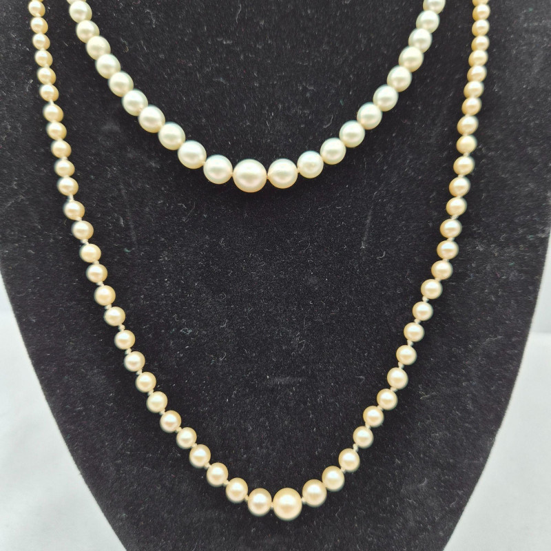 A refined pair of 1950s Japanese cultured pearl strands, beautifully restrung for many more years of graceful wear. The luminous, gently graduated pearls showcase that classic mid‑century Japanese quality—smooth surfaces, soft glow, and timeless elegance. Lengths measure approximately 14" and 18", perfect for layering or wearing individually. One strand features a white gold clasp stamped 14k; the second has a yellow gold clasp that is unstamped and unconfirmed in purity. Both strands present beautifully and offer that coveted vintage charm collectors and pearl lovers seek.