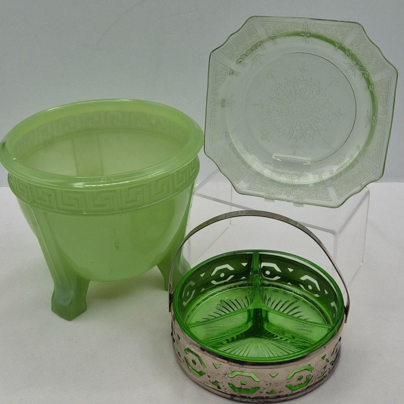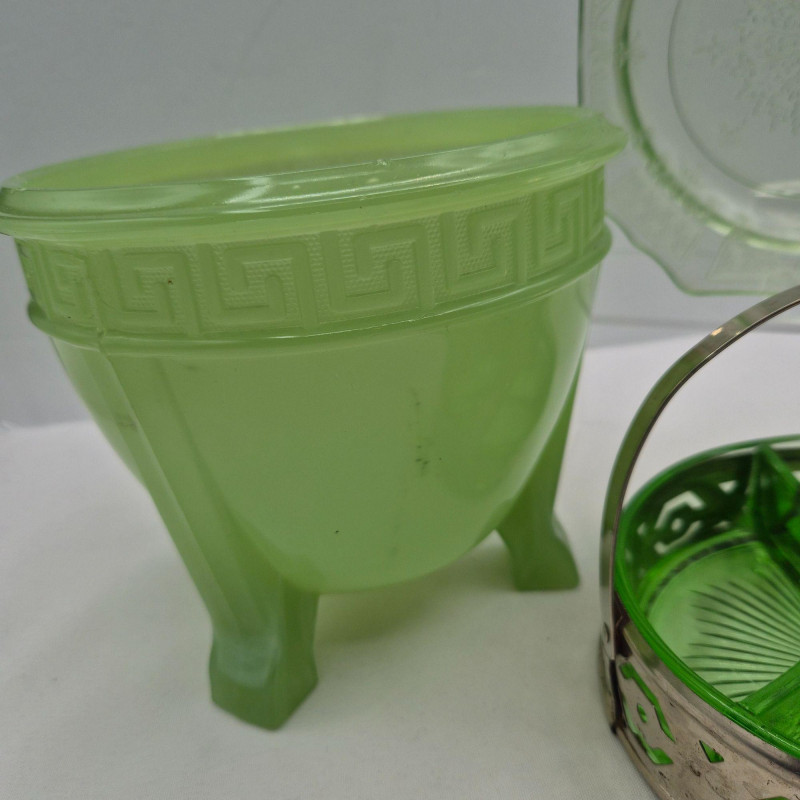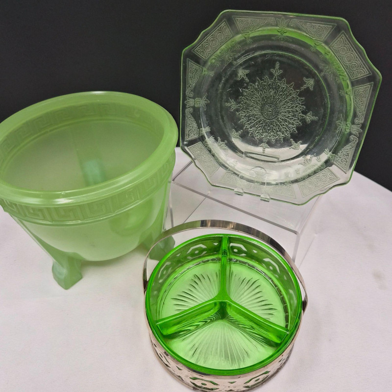 A beautiful, varied grouping of green art glass, blending Murano craftsmanship, silver overlay detailing, uranium glow pieces, and jadeite‑style charm. This collection offers a rich mix of textures, tones, and techniques—perfect for collectors or anyone curating a striking green‑glass display. Includes: A lovely, display‑ready mix of collectible glass forms, united by their green palette and vintage appeal.