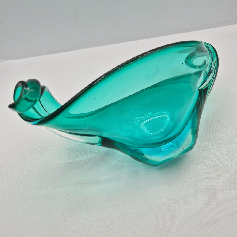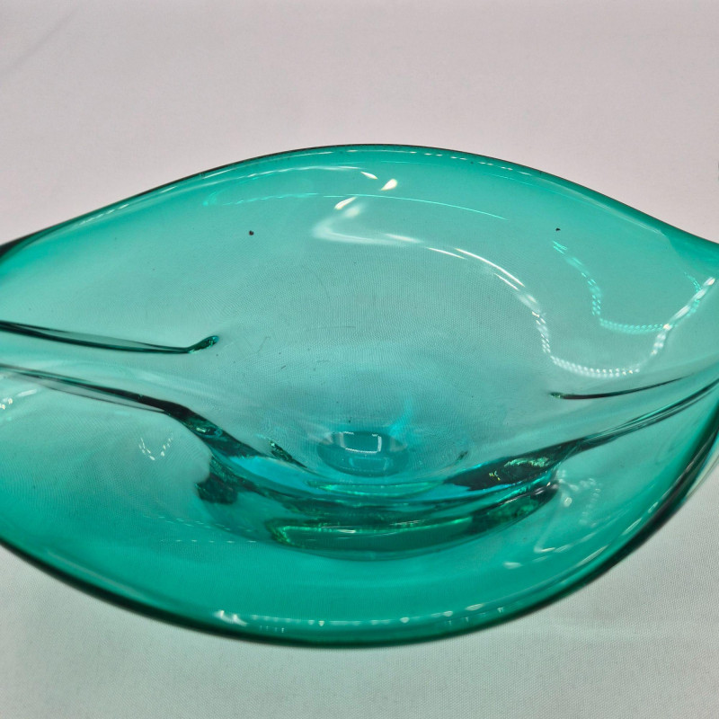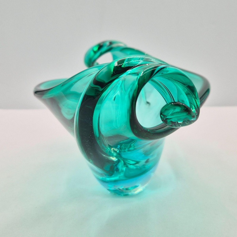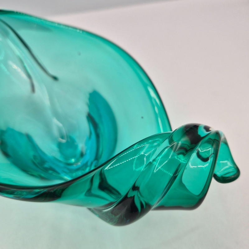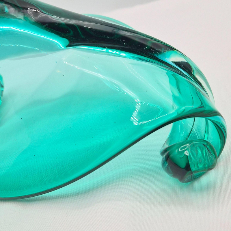 A striking mid‑century teal glass decorative bowl, distinguished by its graceful curled ends and fluid, sculptural form. The piece shows subtle imperfections in the glass—beautiful markers of its handmade nature and consistent with age. Though unsigned, the craftsmanship is evident in the thoughtful shaping, rich teal color, and balanced silhouette. Likely Murano, Italian glass. A lovely accent for collectors of mid‑century art glass or anyone seeking a unique, artisan‑made display piece.