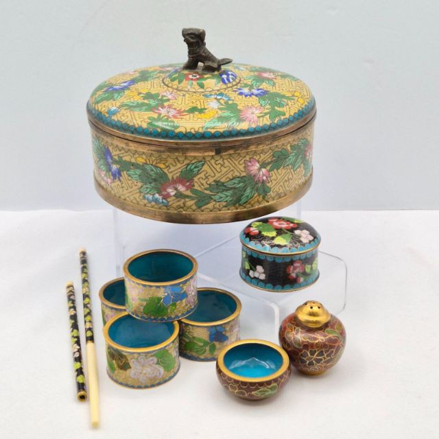 Lot # 32 - 1940s Cloisonné Lidded Dish Foo Dog Handle, Napkin Rings & More