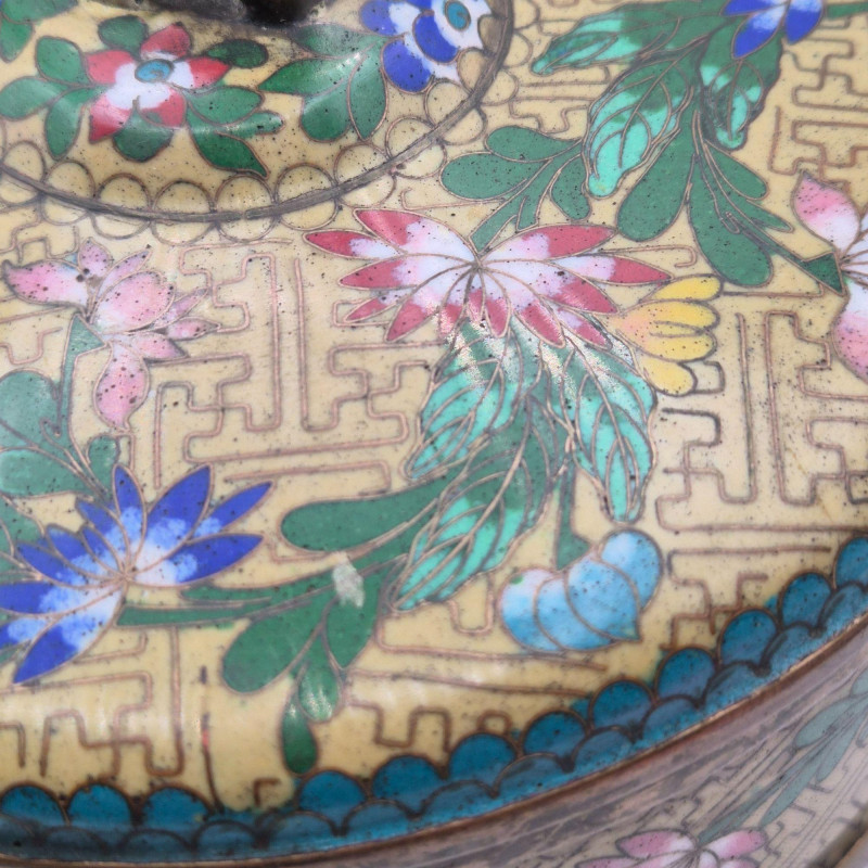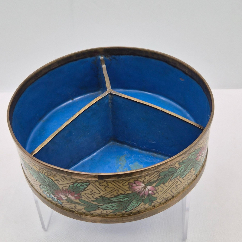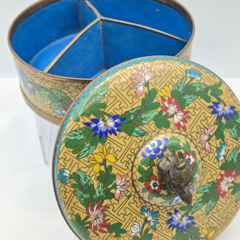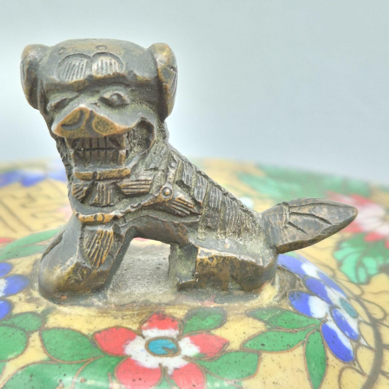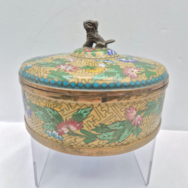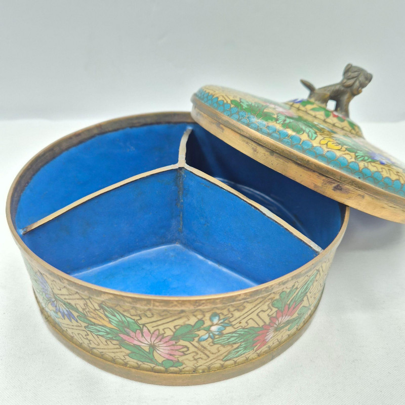 A beautifully curated grouping of vintage Chinese cloisonné and enamelware, anchored by a striking divided lidded dish dating to the 1940s. Measuring approximately 6.5" x 2.5", the feature box showcases classic cloisonné artistry with vibrant enamel work and a sculpted guardian‑dog (foo dog) handle crowning the lid.