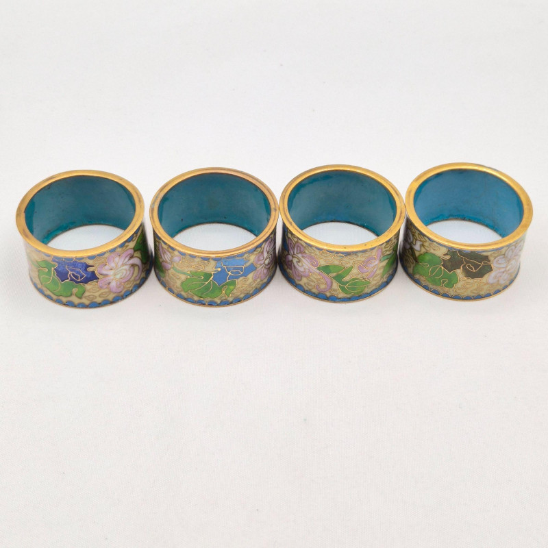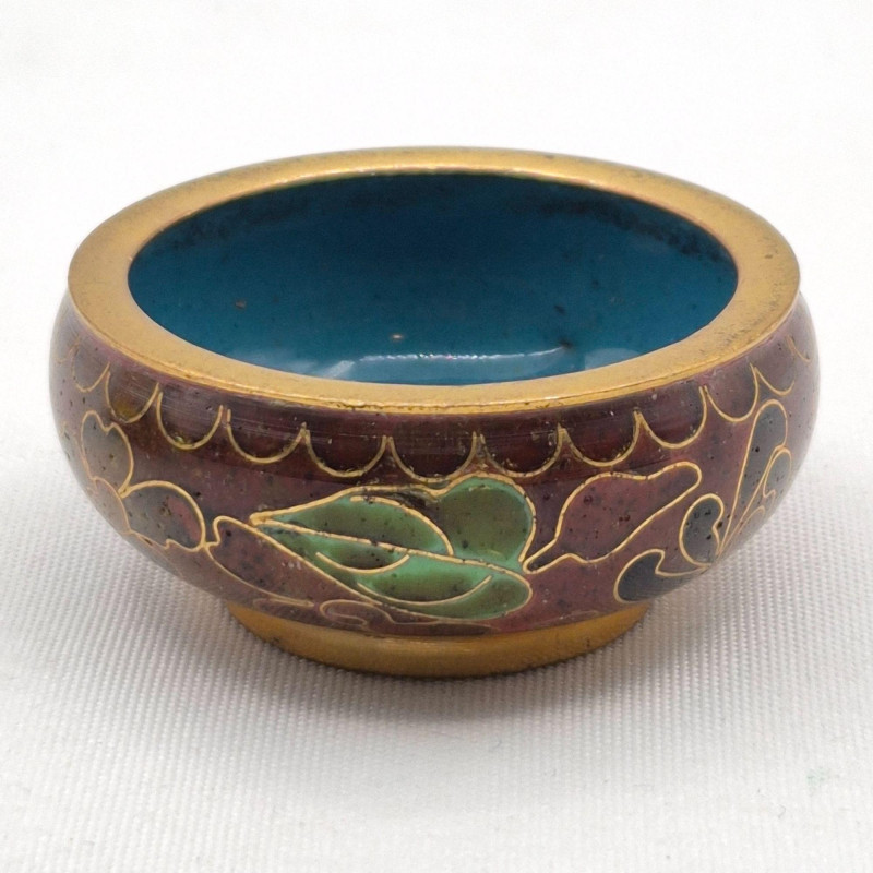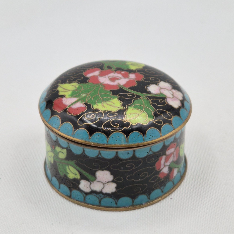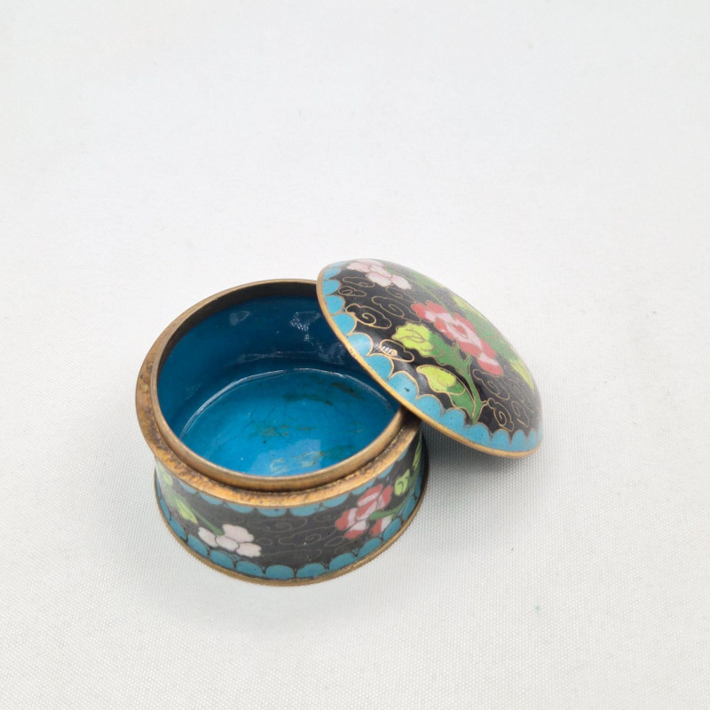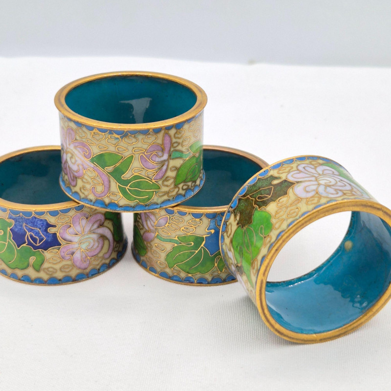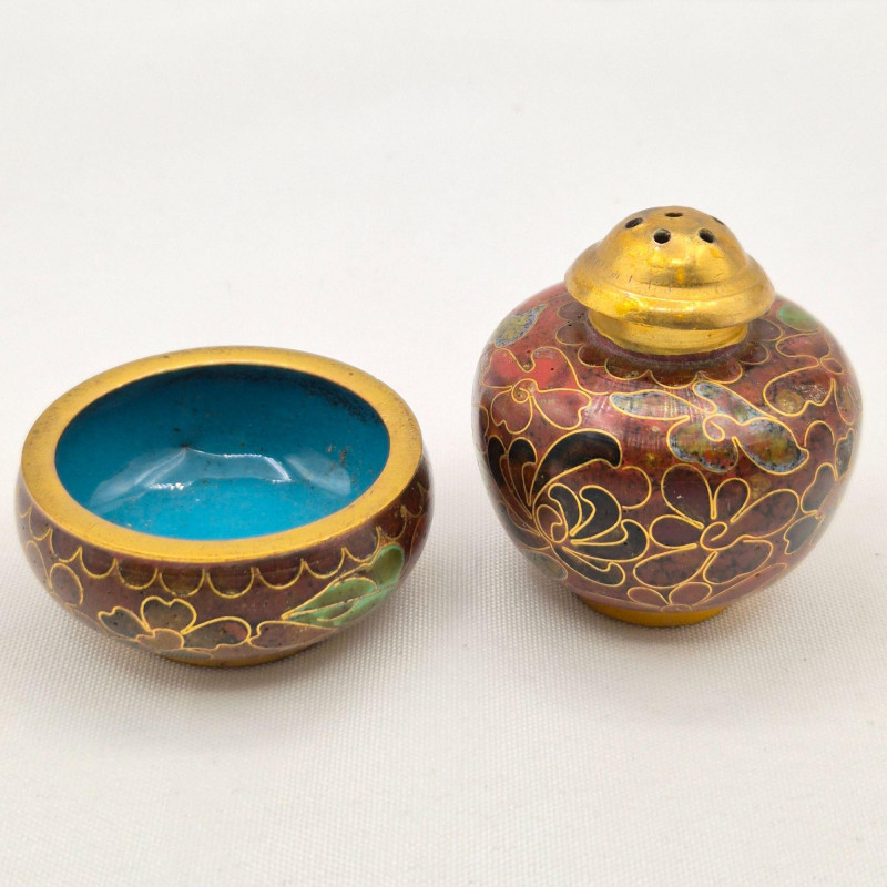 Complementing the main piece are four cloisonné napkin rings, a petite 2" round trinket box, and salt cellar with a matching shaker. Together, these pieces offer a colorful, decorative ensemble perfect for collectors of mid‑century Asian‑inspired enamelware or anyone looking to add a touch of vintage charm to their table or display.