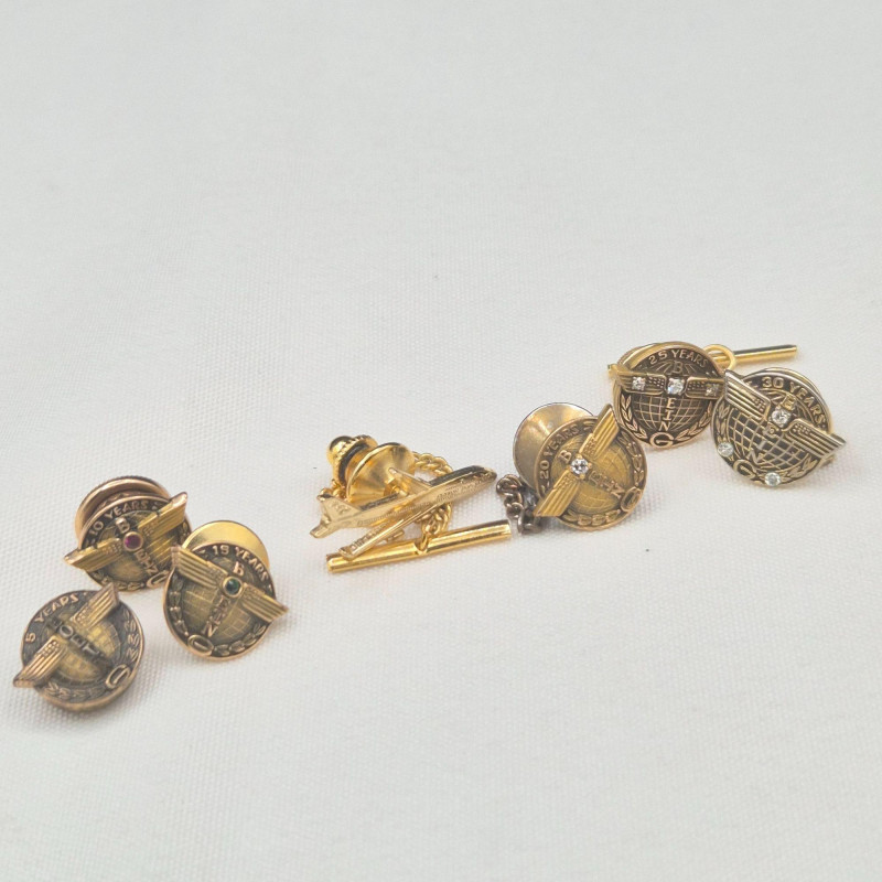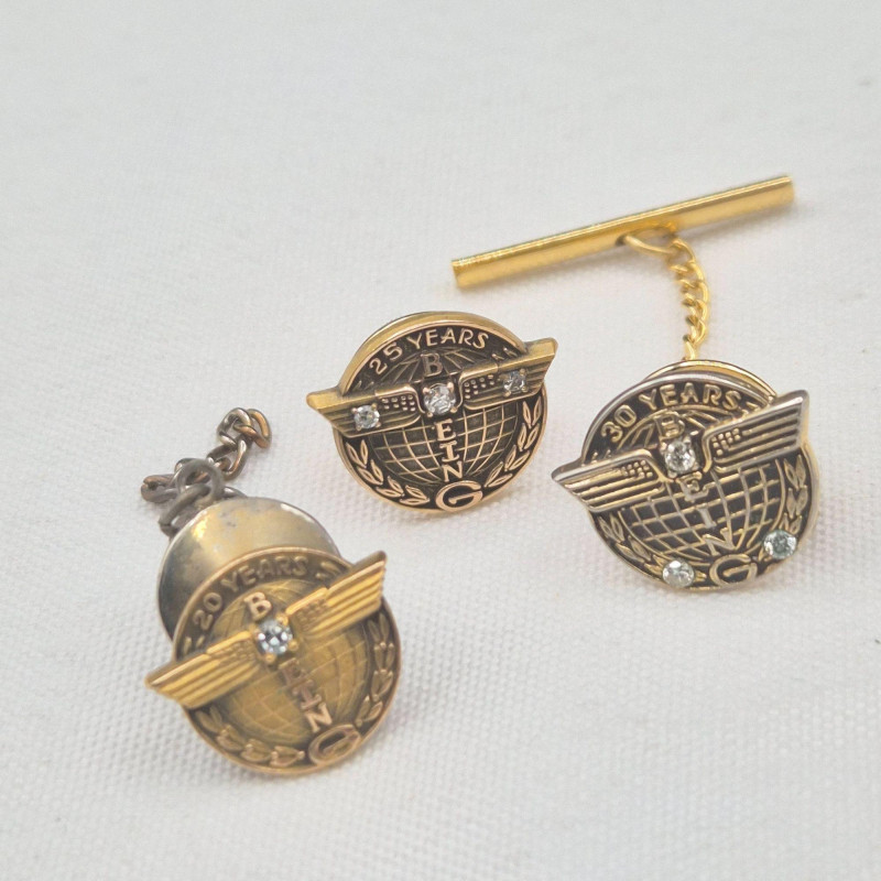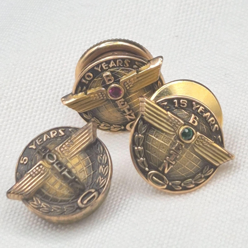 A distinguished collection of service milestones: Celebrate decades of craftsmanship and aviation history with this curated set of Boeing Years of Service pins. These appreciation tac pins mark milestone anniversaries, featuring 10k gold, gemstones, and classic Boeing iconography — a meaningful collection for aviation enthusiasts, Boeing retirees, or collectors of corporate service awards. Highlights A meaningful, well‑preserved set that captures the pride and progression of a Boeing career — from first years to decades of dedication.