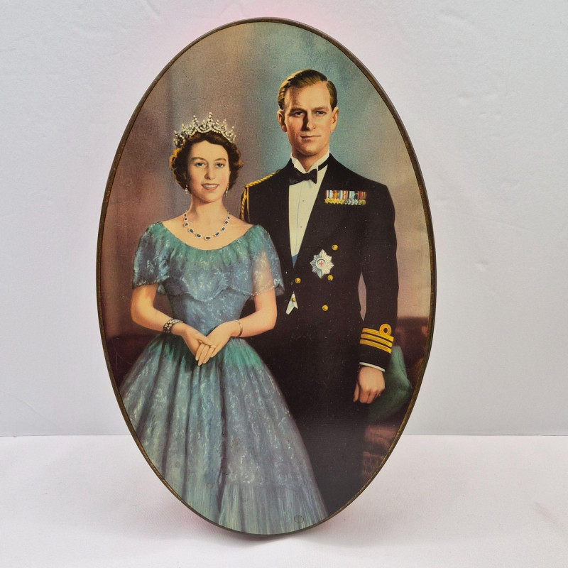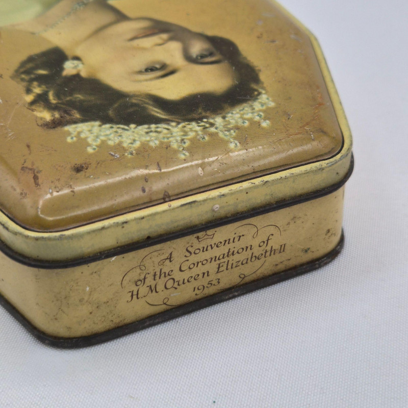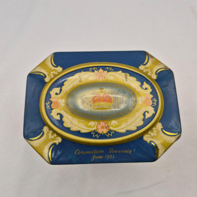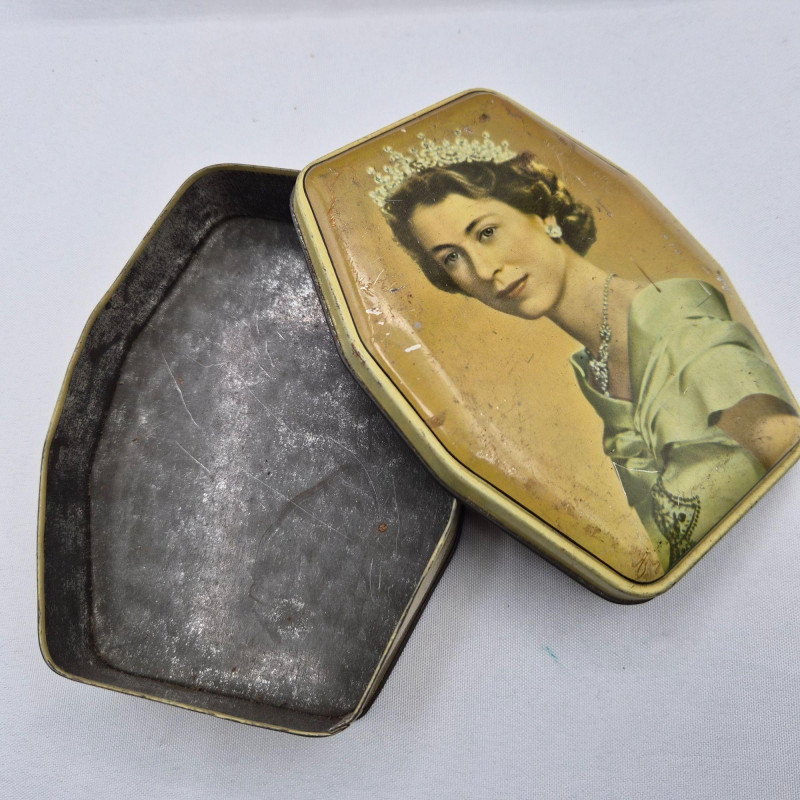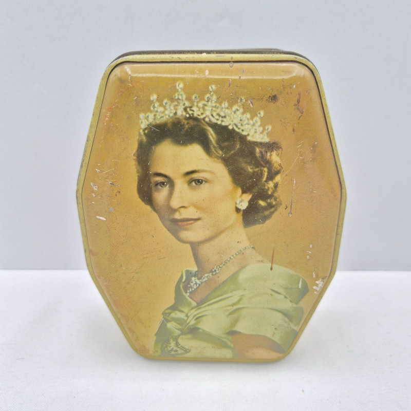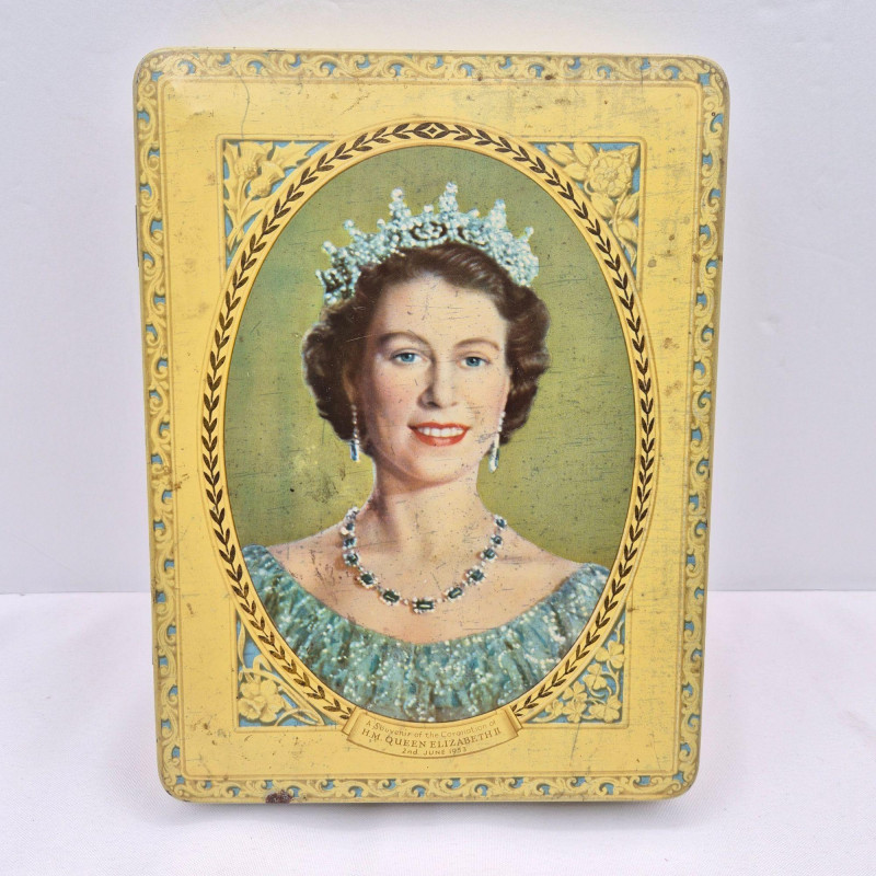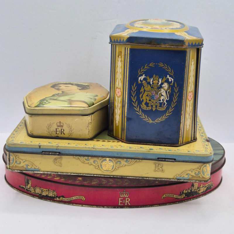 A charming set of four vintage commemorative tins celebrating the 1953 coronation of Queen Elizabeth II. Each tin features a formal portrait of the young Queen, with some designs incorporating Prince Philip and ornate mid‑century detailing in regal tones of gold, blue, and cream. These tins vary in shape and size, offering a visually rich grouping ideal for collectors of royal memorabilia, British history, or vintage packaging. A standout mid‑century display set with timeless royal appeal.