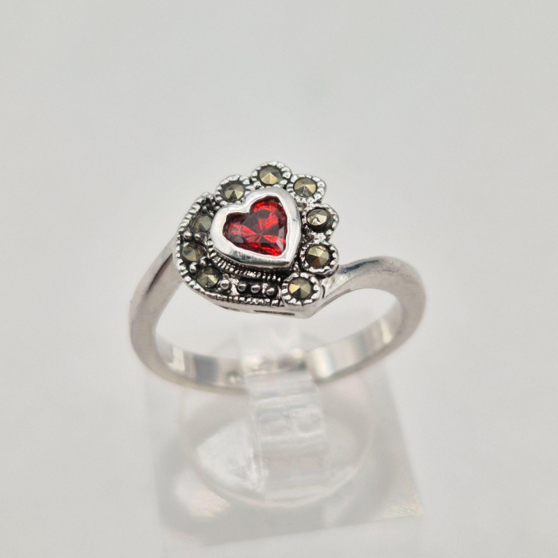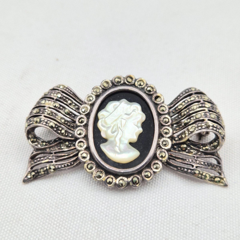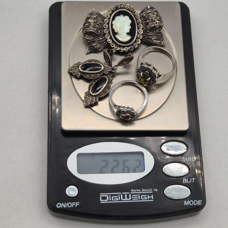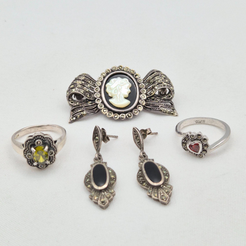 A graceful, and distinguished, vintage‑inspired collection of sterling silver and marcasite jewelry, unified by intricate detailing and timeless charm. Each piece offers its own character, from romantic silhouettes to bold gemstone contrast. Includes: Total weight: 22.6 grams.