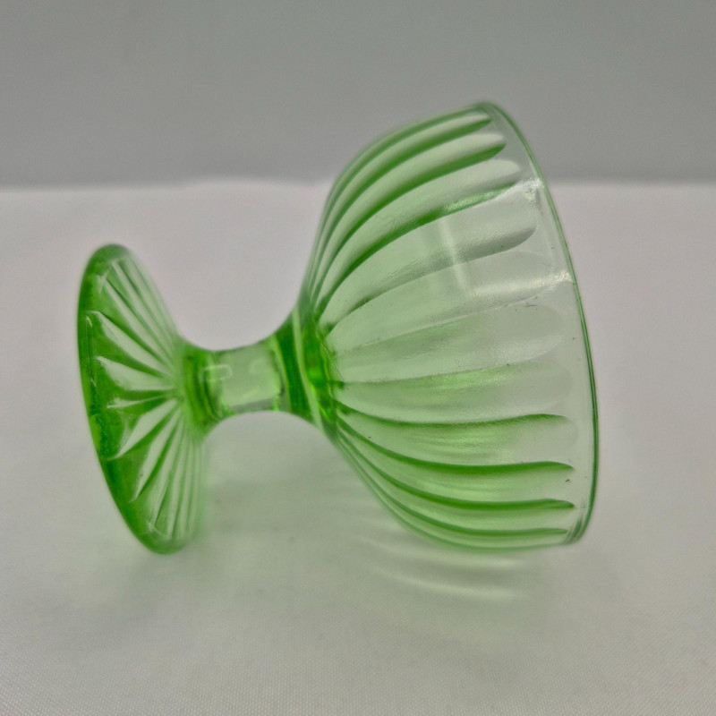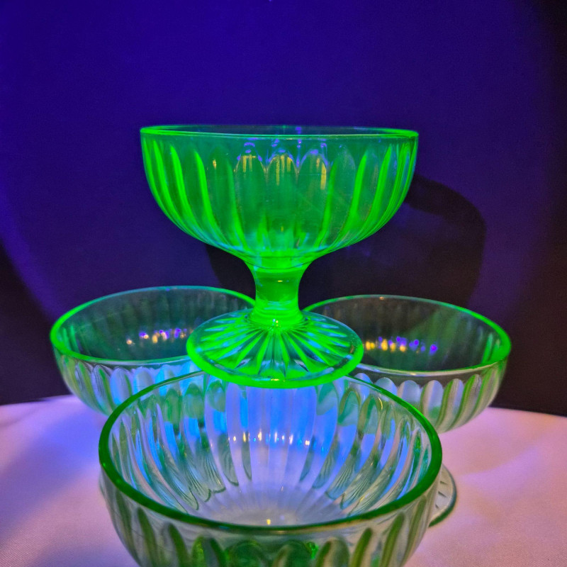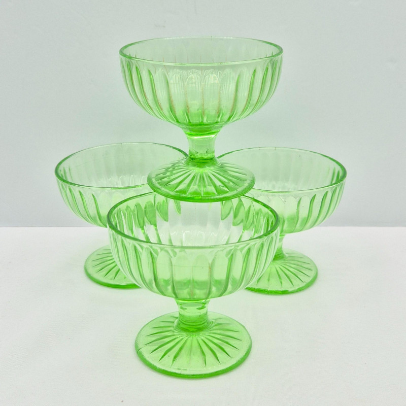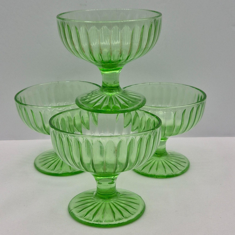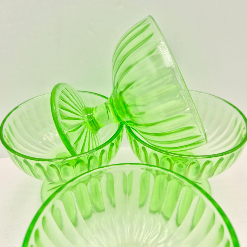 A luminous set of four vintage uranium glass sherbet dishes, glowing a vivid greenish‑yellow under UV light thanks to their uranium oxide content. Each dish features a ribbed design on both bowl and base, adding texture and elegance to their classic silhouette. These mid‑century dessert cups are prized for their unique fluorescence and collectible appeal. A standout set for lovers of depression glass, atomic‑era design, or glow‑in‑the‑dark vintage-ware.