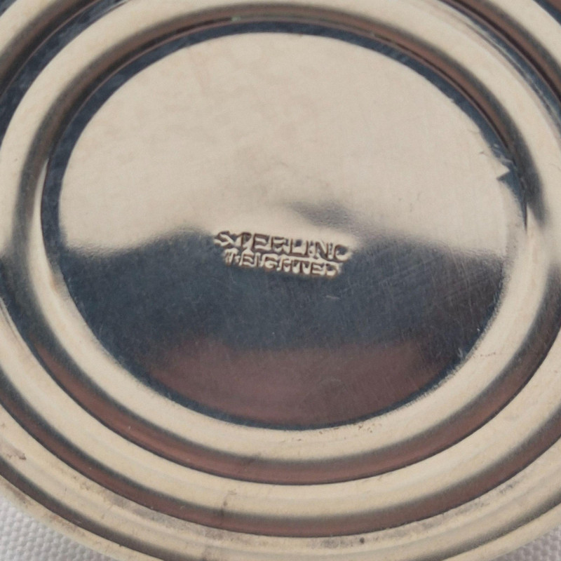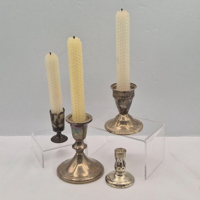 A classic grouping of sterling silver candlestick holders paired with vintage honeycomb candles, offering timeless charm and warm display appeal. All pieces show natural patina and would brighten beautifully with a polish. Each holder is marked sterling, with one small holder unweighted. Includes: A lovely, versatile set for table styling, holiday décor, or silver collectors who appreciate classic forms and authentic patina.