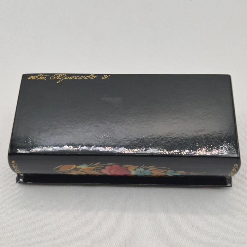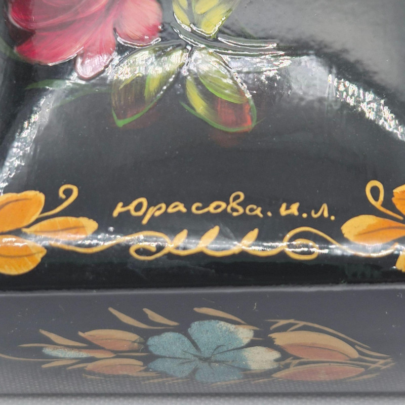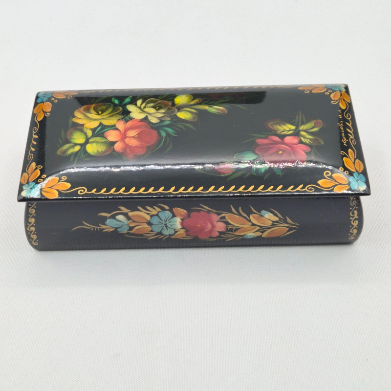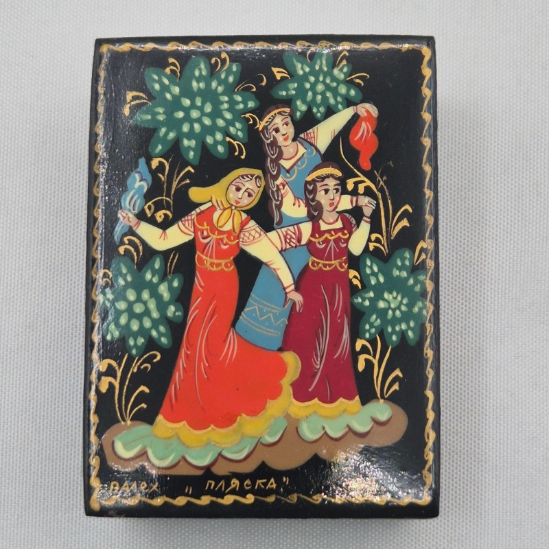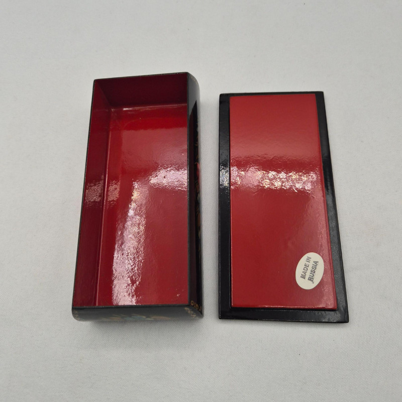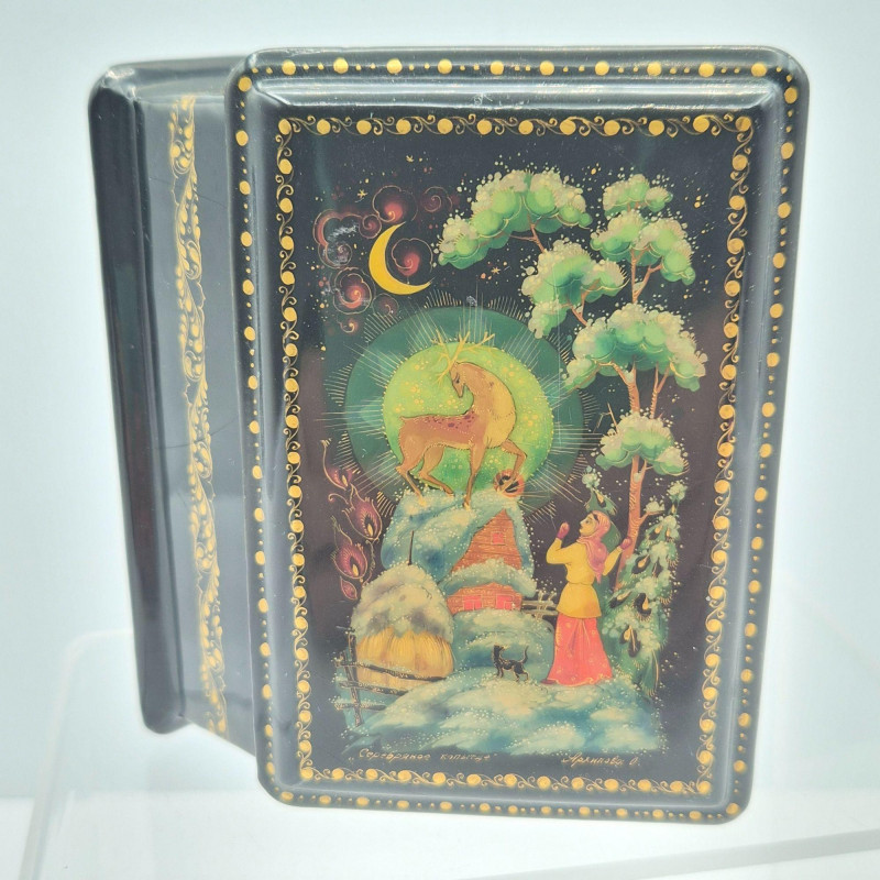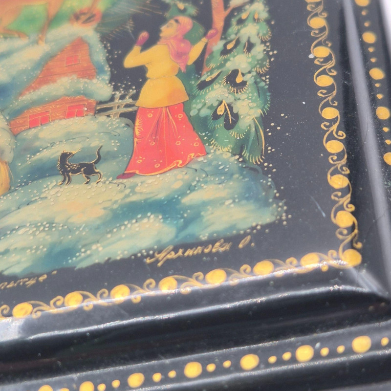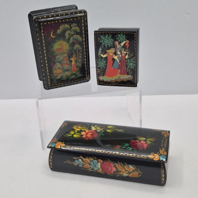 A refined trio of Russian lacquer decorative boxes, each hand‑painted with intricate detail and signed by the artist. These traditional papier‑mâché boxes feature rich lacquer finishes and miniature artwork, reflecting the craftsmanship of Russian folk and fine art traditions. The set includes three sizes:
