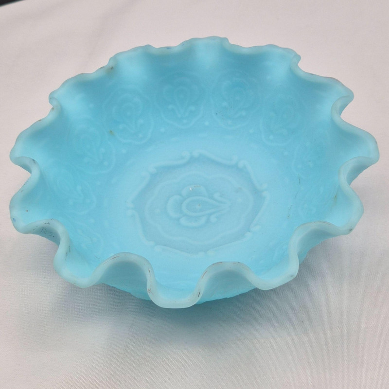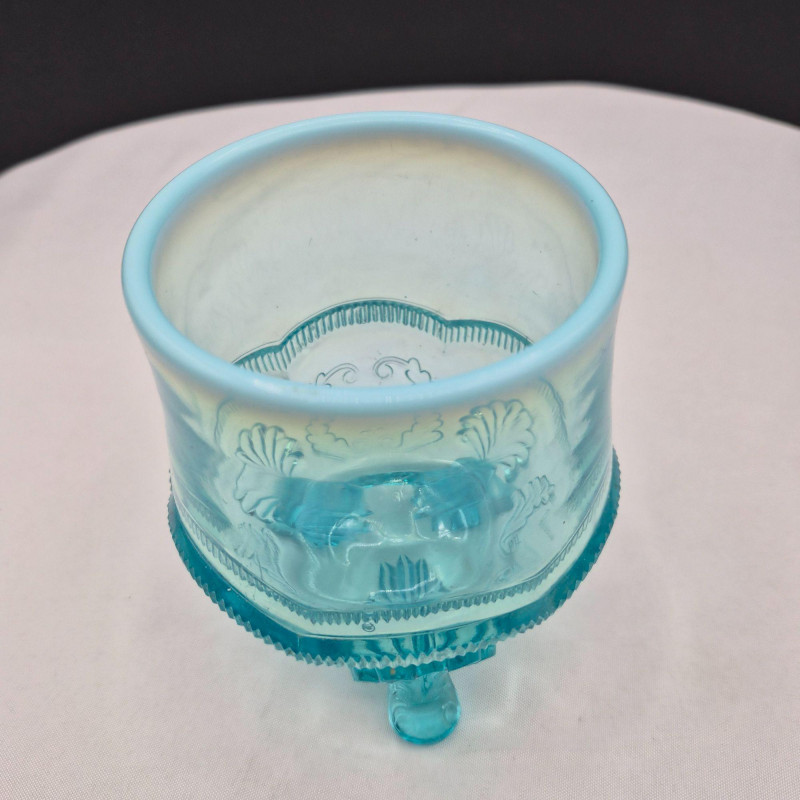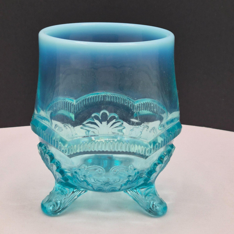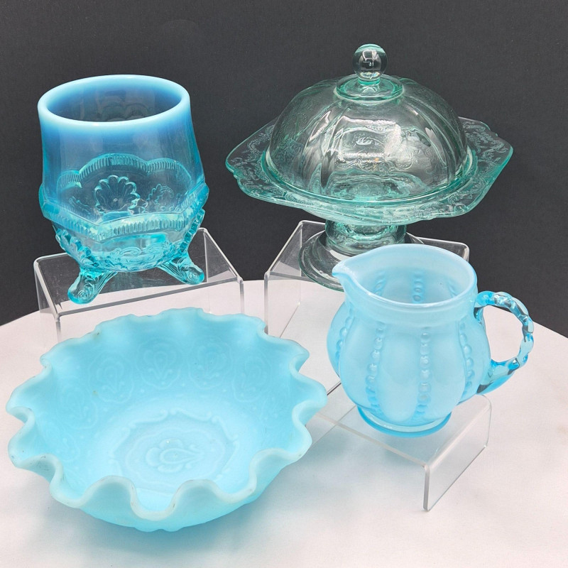 A beautifully coordinated selection of blue and green‑hued vintage glass, showcasing standout pieces from Fenton, Indiana Glass, and Model Flint Glass. This lot brings together opalescent finishes, satin textures, and classic pressed‑glass patterns for a serene, collectible display. A striking mix of opalescent glow, satin texture, and pressed‑glass detail, perfect for collectors of early‑ to mid‑century American glass or anyone building a cool‑tone display with personality.