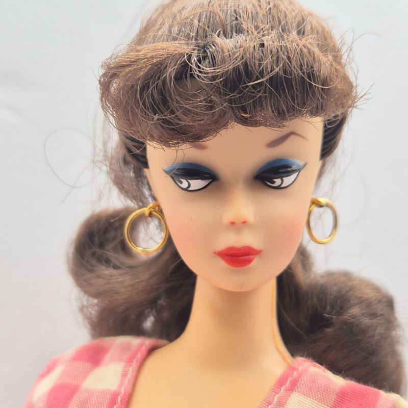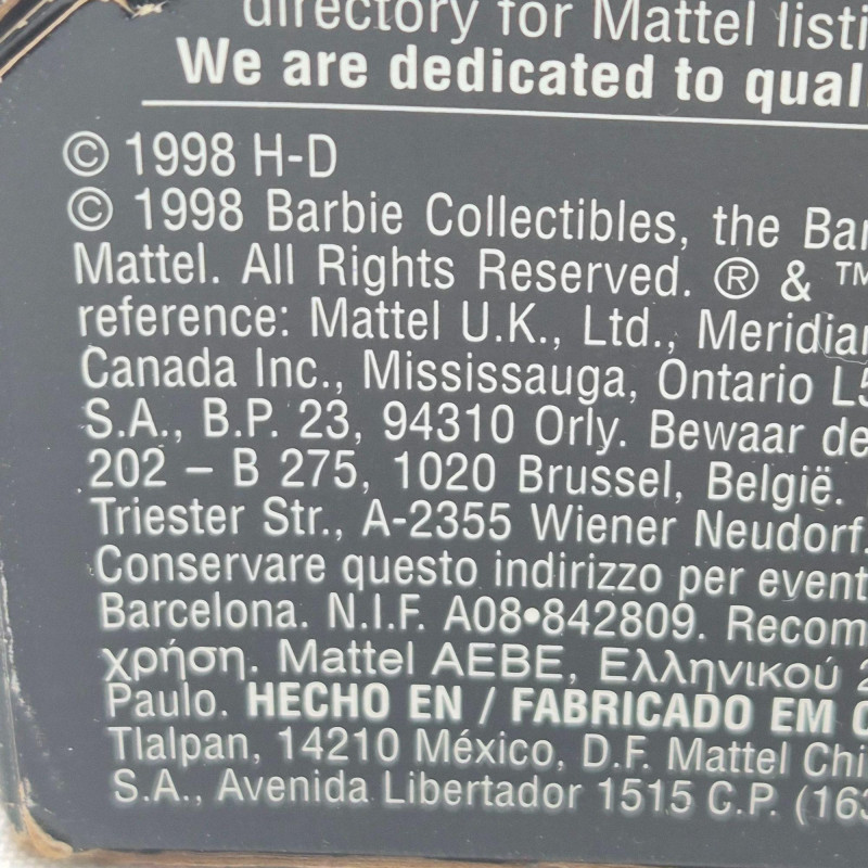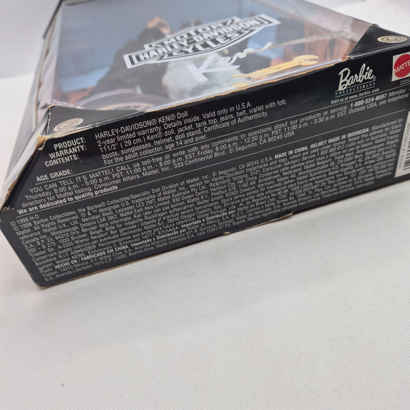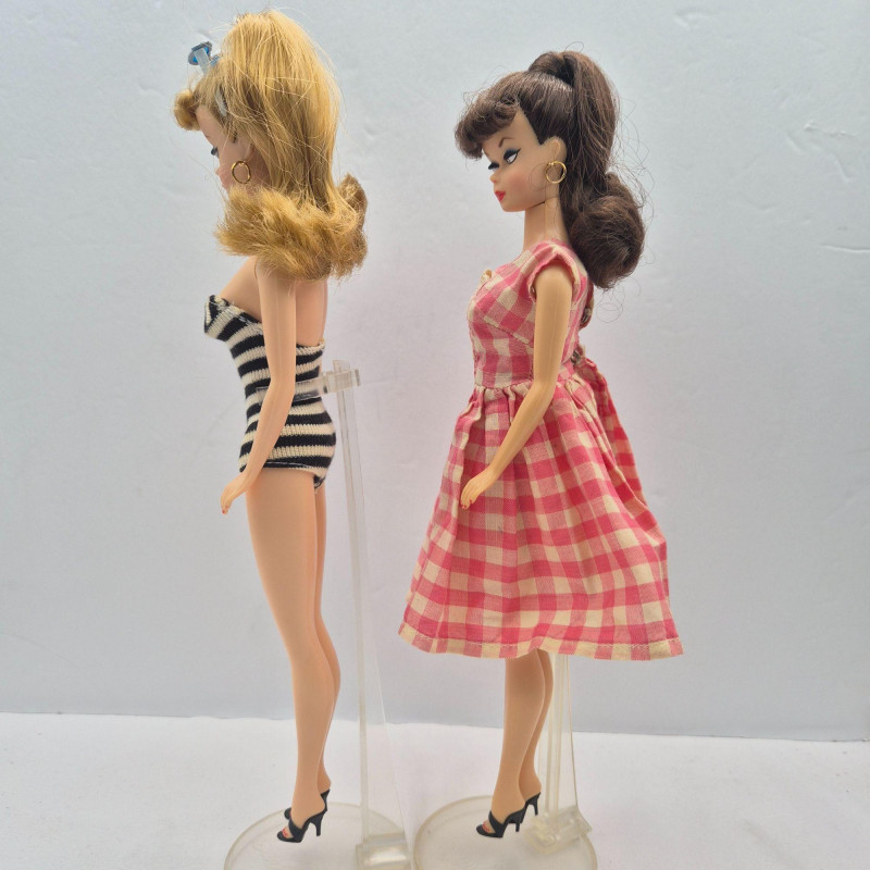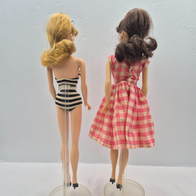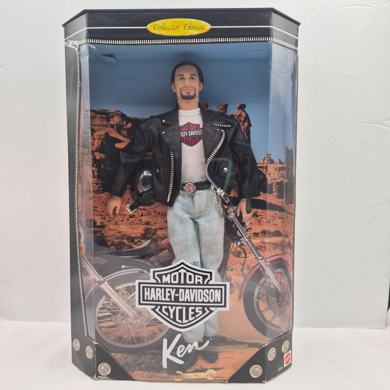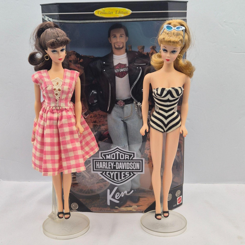 A fun trio of collectible Mattel dolls spanning iconic Barbie nostalgia and Harley‑Davidson edge. This lot includes two 1993 Anniversary Barbies, created as reproductions of classic 1960s dolls, each displayed on a plastic stand. One wears the signature striped vintage bathing suit, while the other is dressed in a checkered dress. Both feature pierced ears with gold‑tone hoop earrings and open‑toe heels. These two are offered without boxes. Also included is a 1998 Harley‑Davidson Ken Doll, a boxed Collector Edition figure with bold biker styling. Box shows light wear/damage, but the doll remains a standout for Harley and Barbie crossover collectors. A great grouping for Barbie enthusiasts, display collectors, or anyone who loves Mattel’s nostalgic reissues and themed editions.