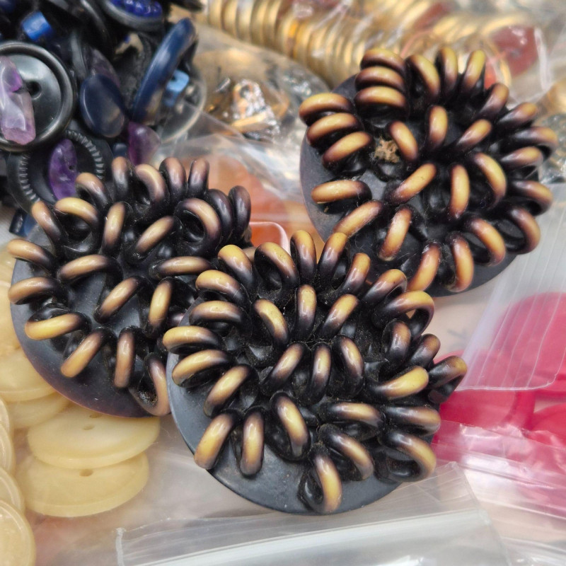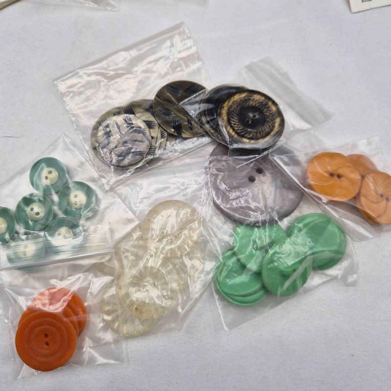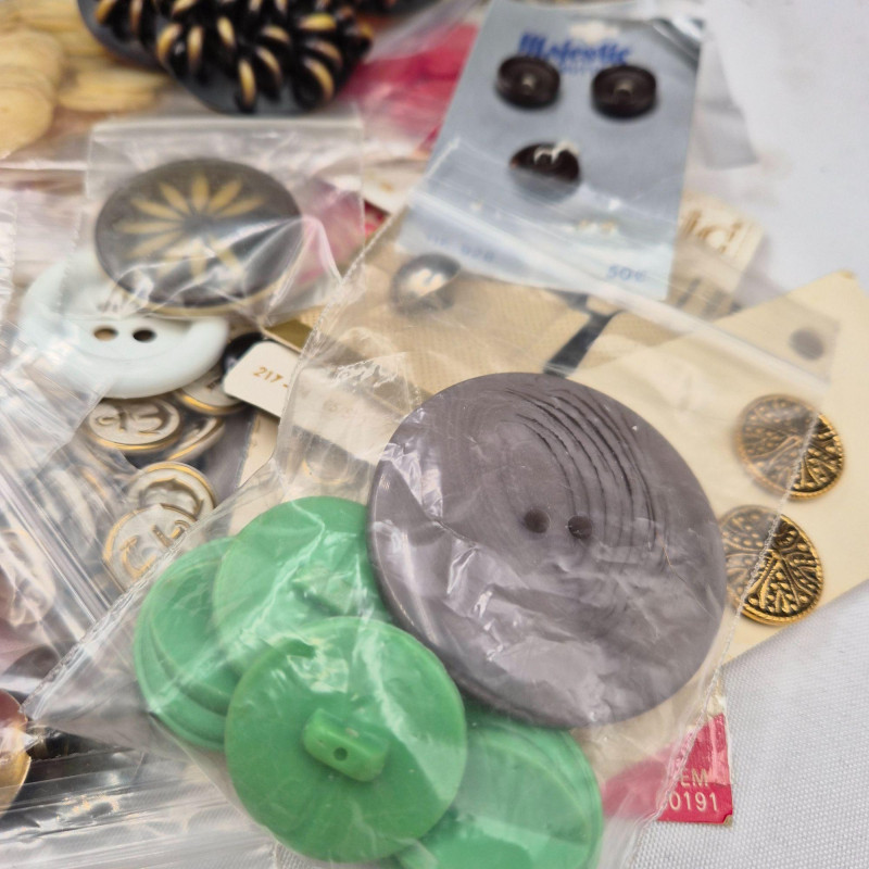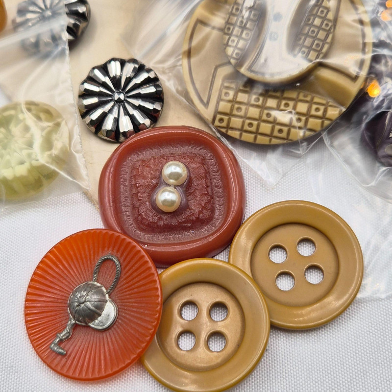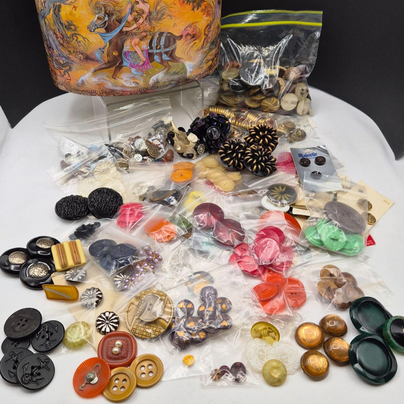 Discover a treasure trove of vintage charm with this impressive button collection spanning the 1940s through the 1970s. Housed in a classic Godiva tin, this assortment features an exceptional variety of Bakelite, glass, metal, and other collectible materials. Inside, you’ll find a vibrant mix of colors, shapes, and sizes—perfect for collectors, crafters, designers, or anyone who appreciates mid‑century craftsmanship. The lot includes singles, matched sets, and carded buttons, offering both unique one‑offs and coordinated groups. Whether you're restoring garments, creating art, or expanding a vintage collection, this lot delivers decades of style and history in one delightful package.