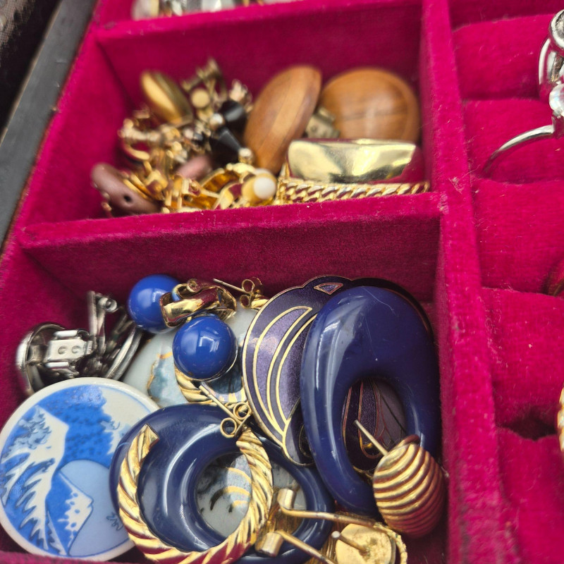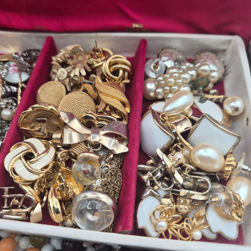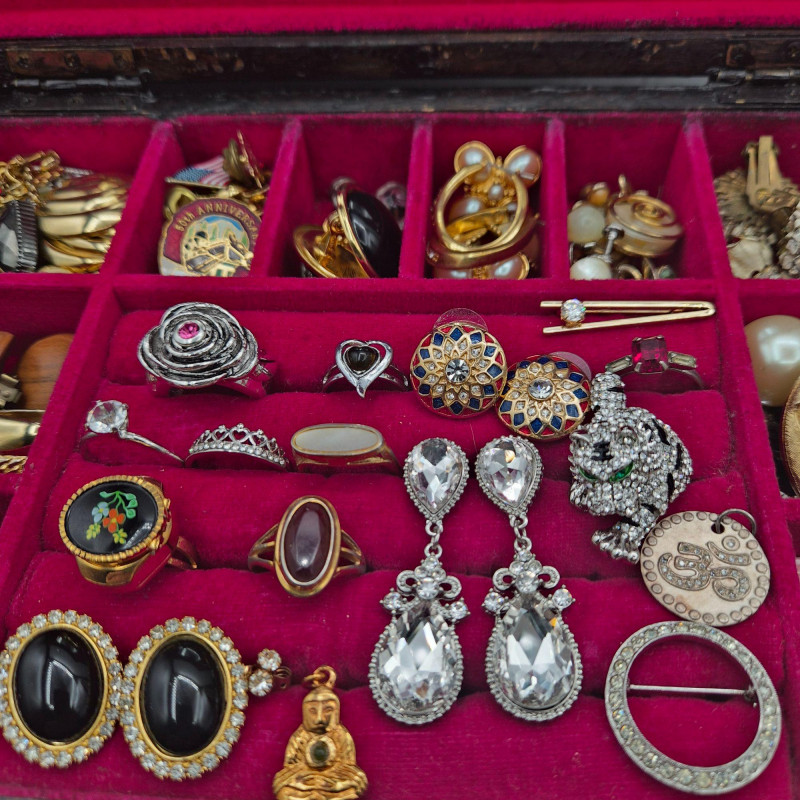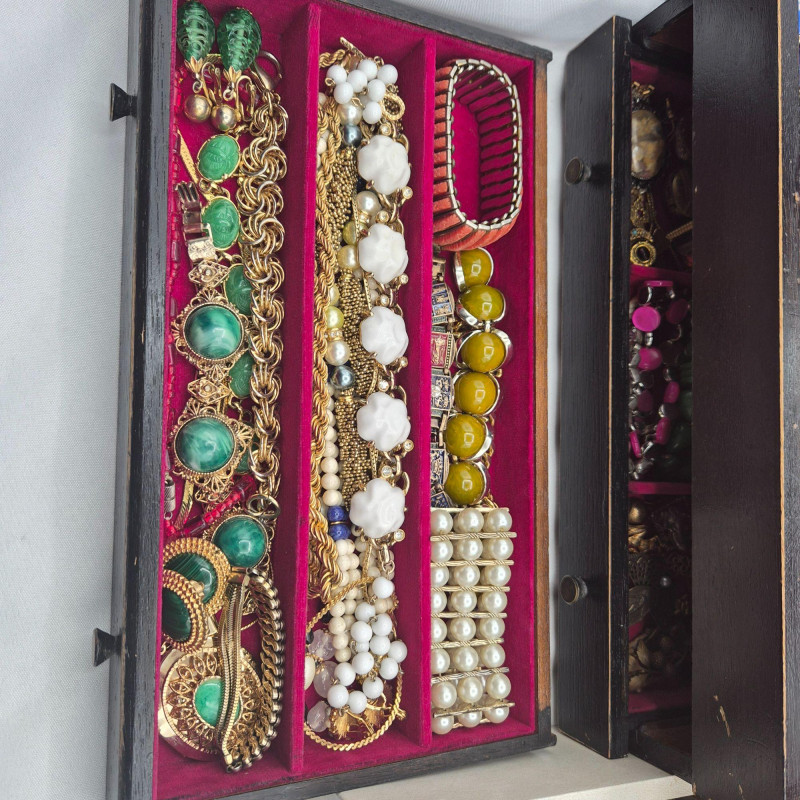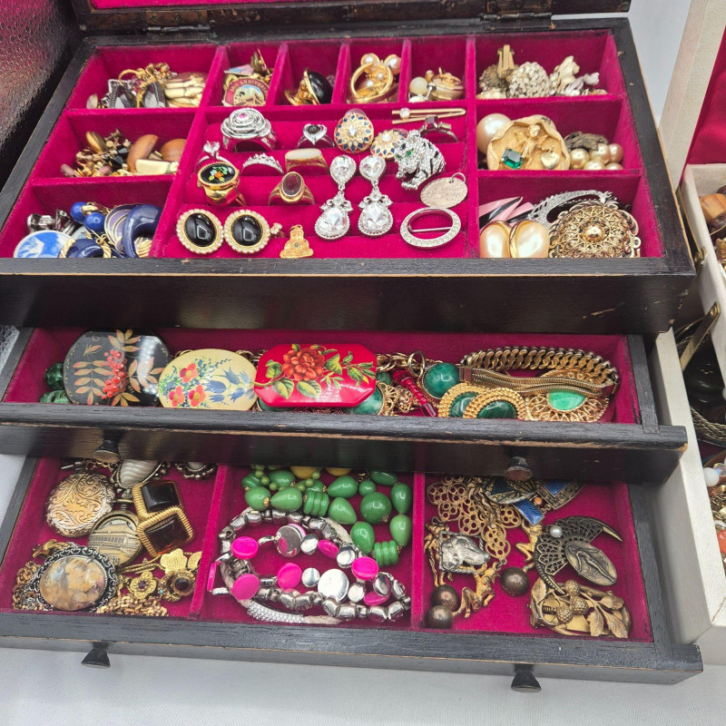 A bountiful blend of vintage and modern fashion jewelry, packed into two jewelry boxes overflowing with sparkle, charm, and creative potential. This eclectic assortment includes: Whether you're a collector, reseller, or DIY jewelry artist, this mega mix offers endless inspiration and value.