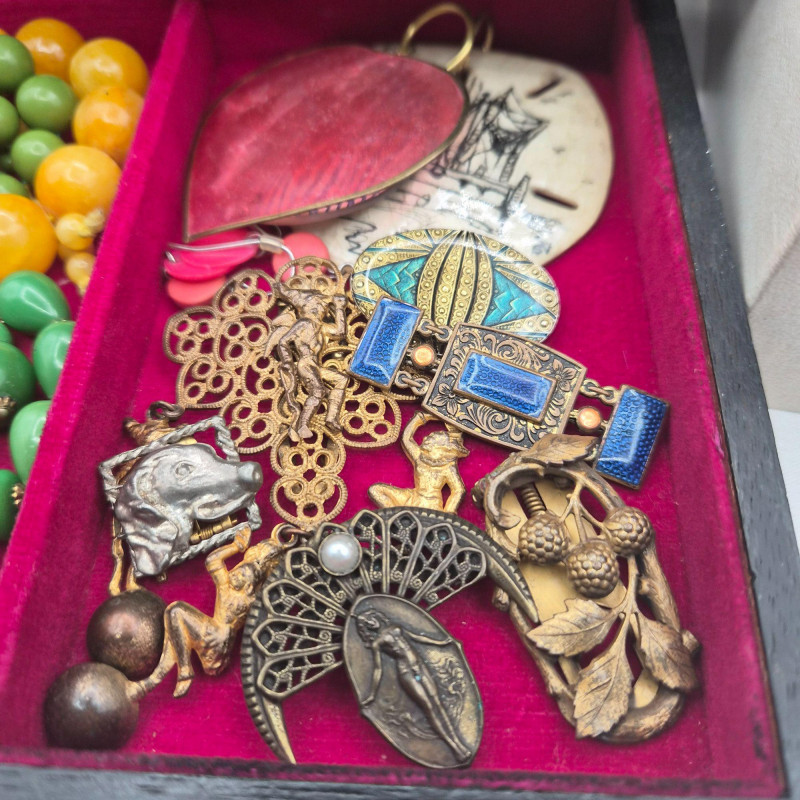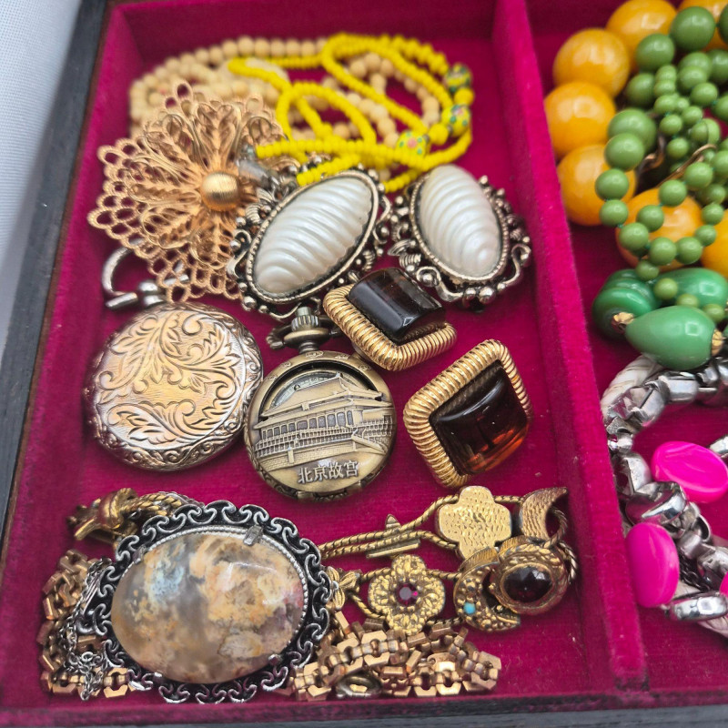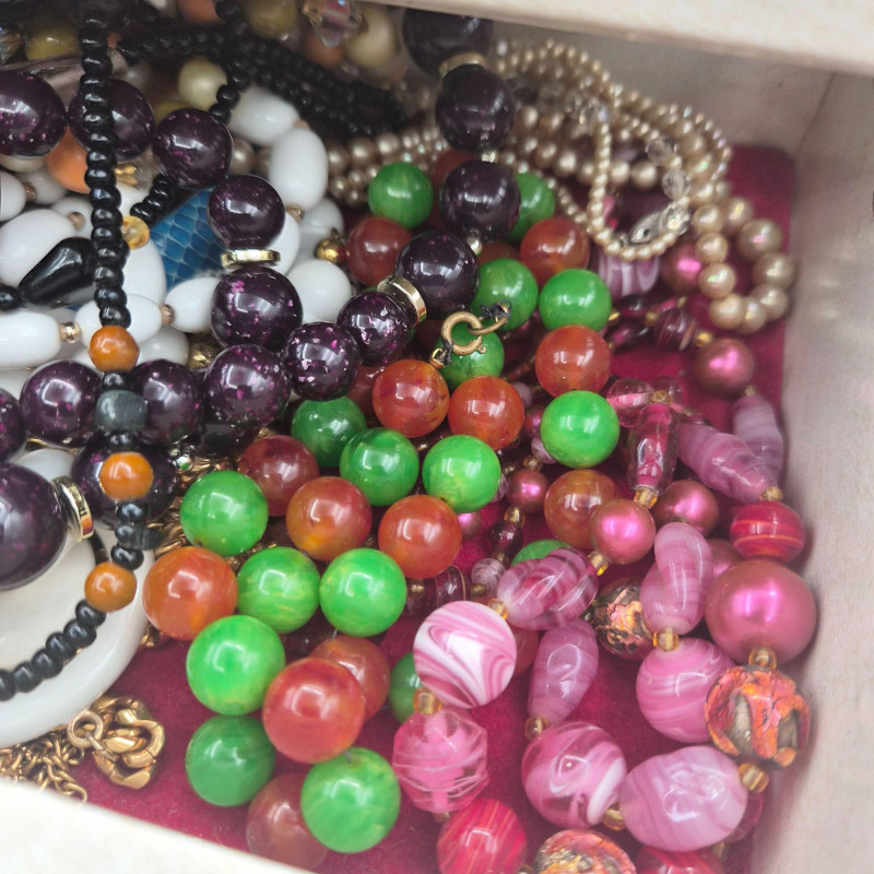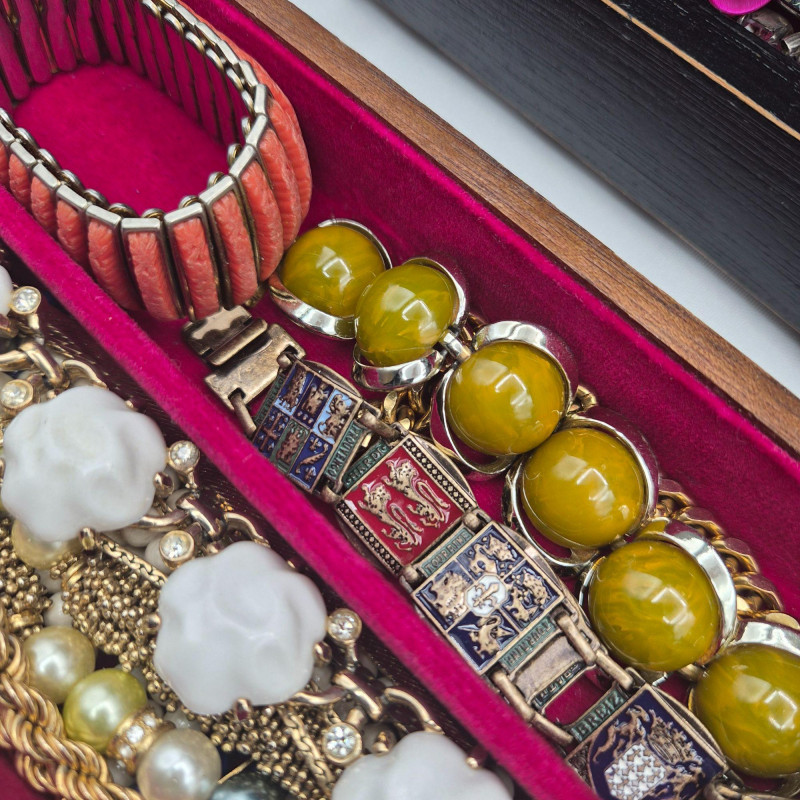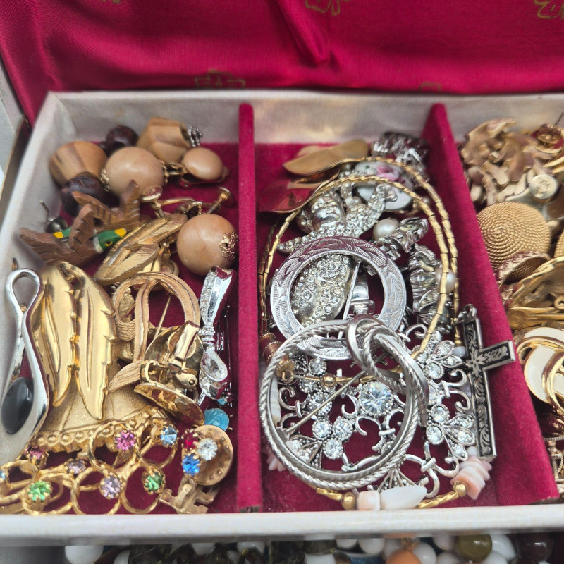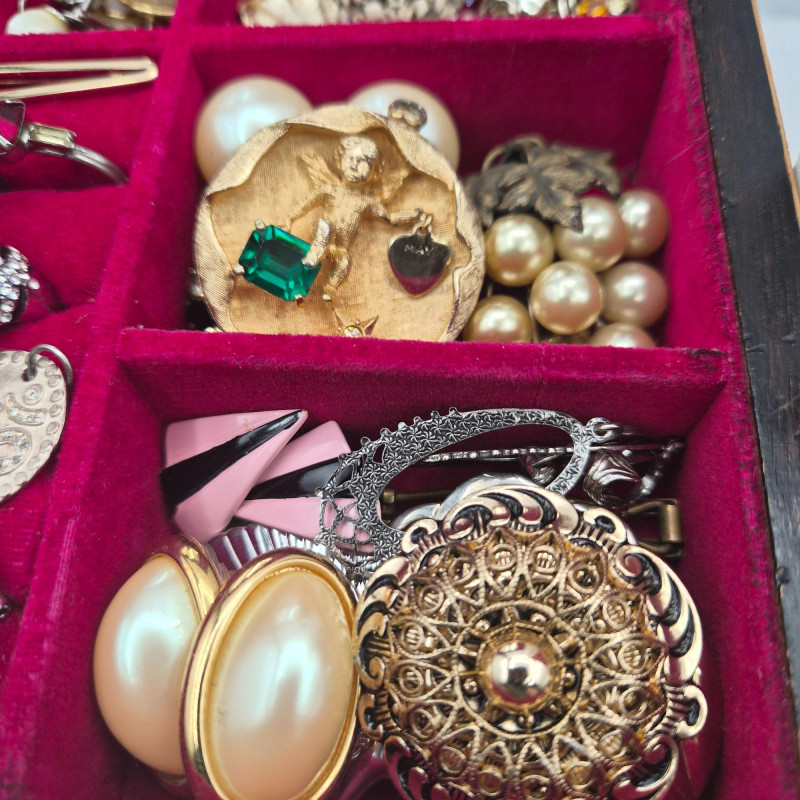 A bountiful blend of vintage and modern fashion jewelry, packed into two jewelry boxes overflowing with sparkle, charm, and creative potential. This eclectic assortment includes: Whether you're a collector, reseller, or DIY jewelry artist, this mega mix offers endless inspiration and value.