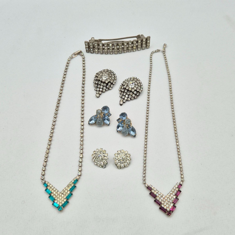A vibrant assortment of vintage rhinestone jewelry and accessories, spanning classic 1940s pieces to mid‑century sparkle. This curated lot includes: A lively mix of color, craftsmanship, and vintage charm—perfect for collectors, stylists, or anyone who loves rhinestones in all their forms.