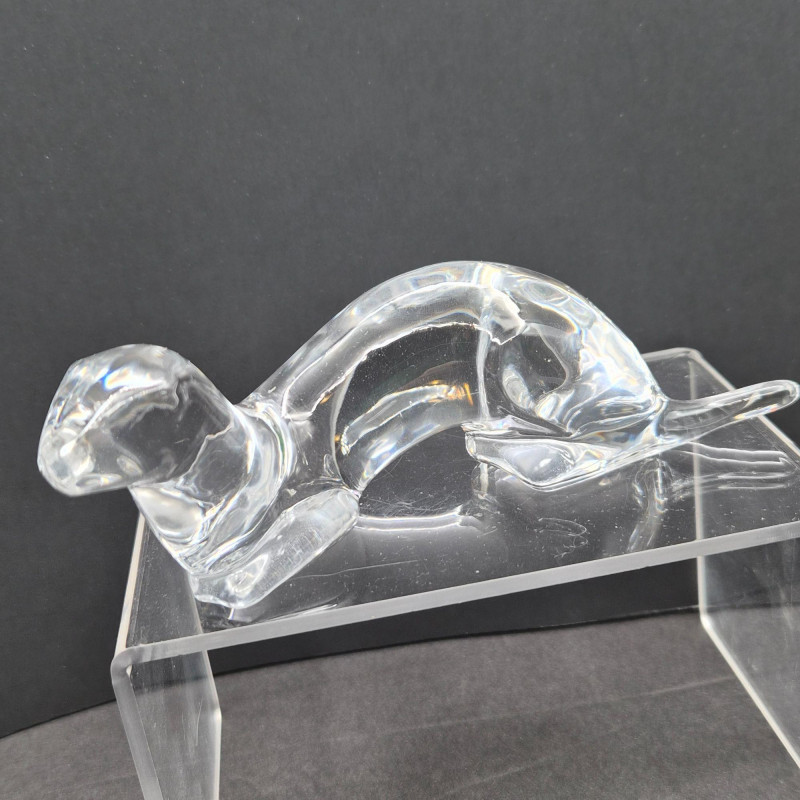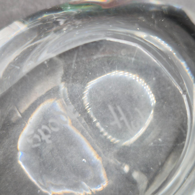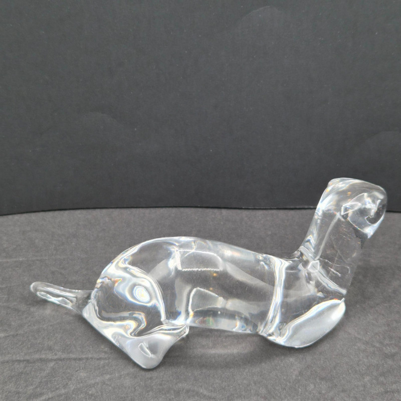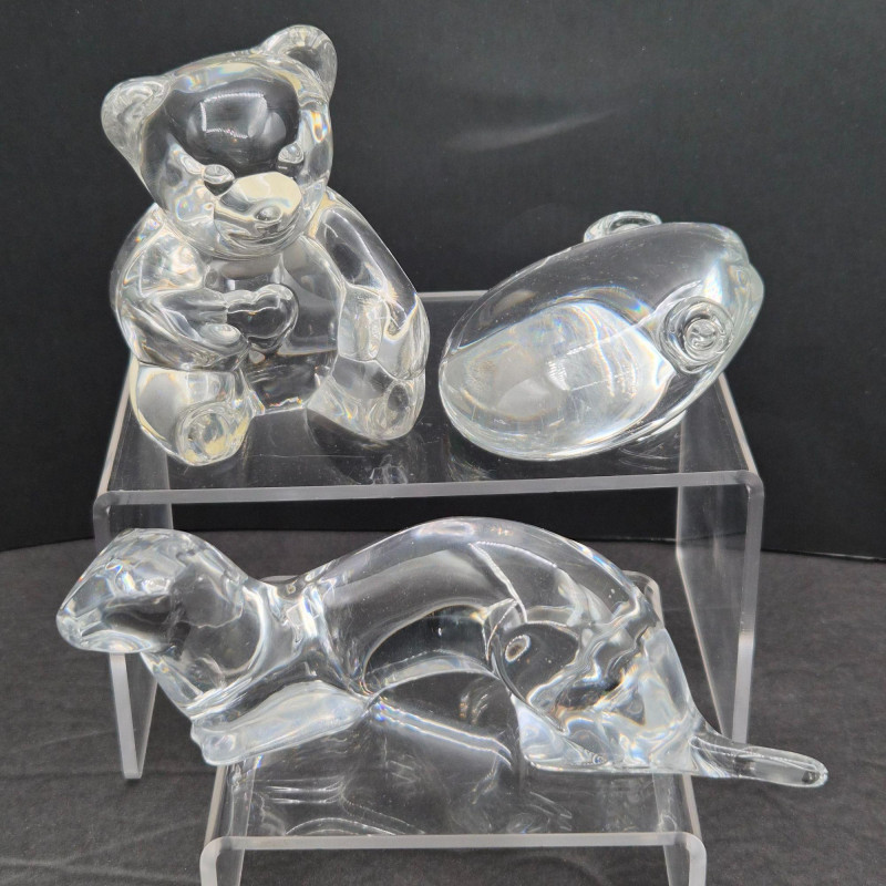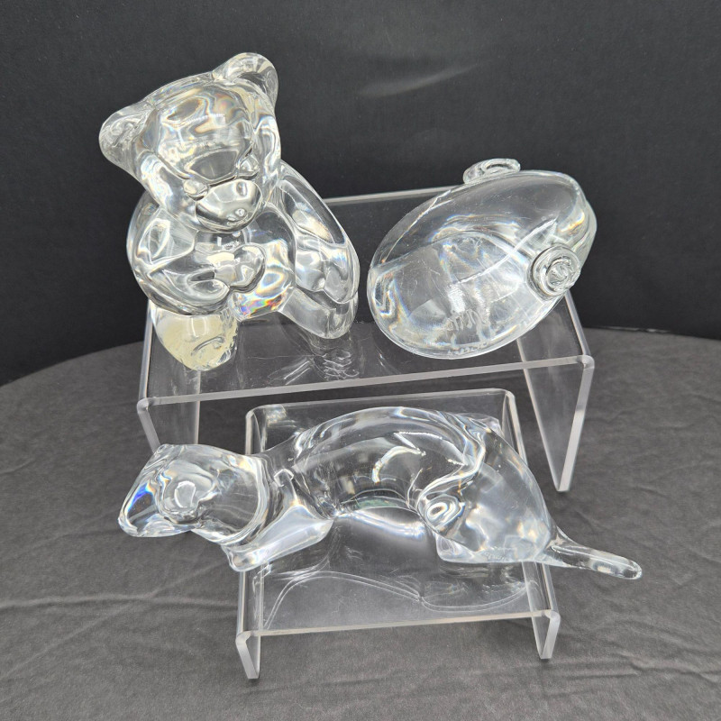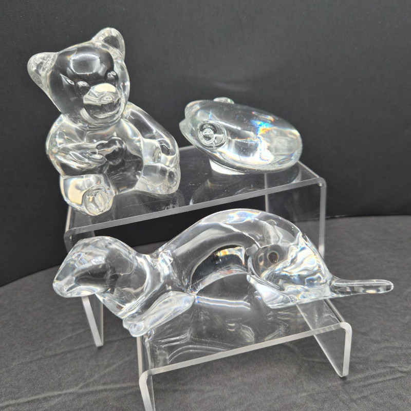 A delightful trio of crystal animal figures from three respected makers. The Jonal crystal love bear, made in Germany, measures approximately 3" x 2.5" x 2.5" and features a warm, rounded silhouette. The Spode crystal frog, 2.25" x 2.75" x 1.5", adds a touch of whimsy and shows a few light scratches/imperfections consistent with age. Completing the group is a sleek Hadeland crystal otter, 5.5" x 1.5" x 2", known for its smooth Scandinavian form and clarity.