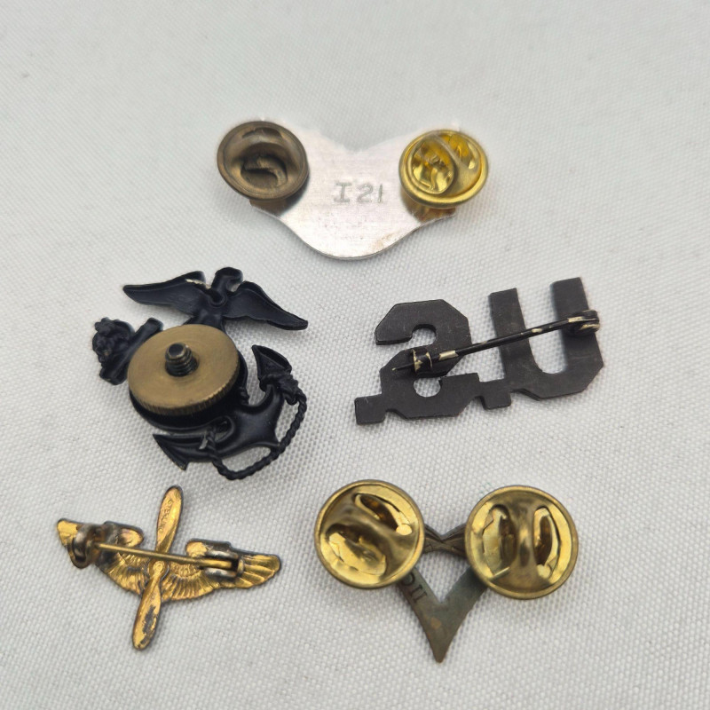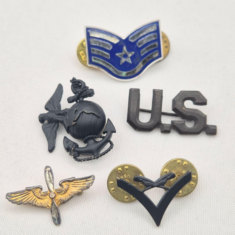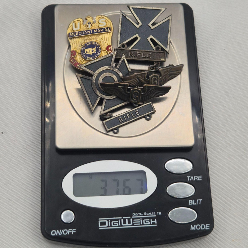 A varied assortment of military‑related badges, pins, and patches, featuring a mix of sterling silver, copper, and other metals/materials. This grouping blends service‑style insignia with school and organizational pieces, offering both historical interest and display value. The sterling items together weigh approximately 37 grams. Included in the lot is a small PSAL (Public Schools Athletic League) copper screw‑back uniform pin, a classic early‑ to mid‑century piece with warm patina. A versatile collection ideal for military memorabilia collectors, mixed‑metal pin enthusiasts, or anyone curating a vintage insignia display.