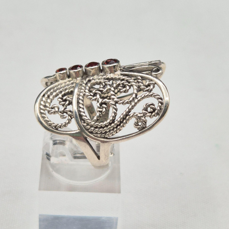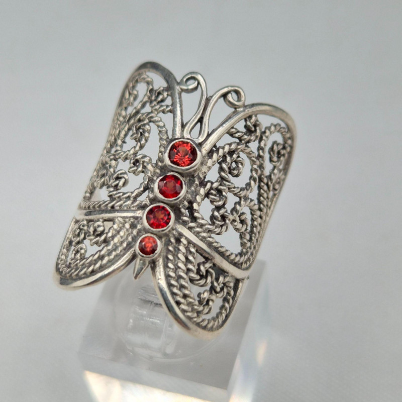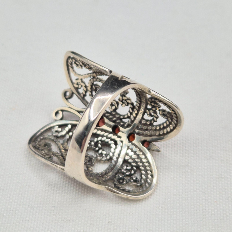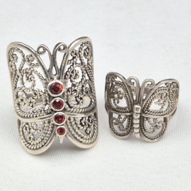 A beautifully coordinated pair of sterling silver butterfly rings, each showcasing delicate filigree craftsmanship. The larger statement ring features an ornate butterfly design set with four deep red garnet stones, stamped 925 and sized at 9.5. Its companion is a smaller, airy filigree butterfly ring, also stamped 925, in a size 5.75. Together, they create a charming duo for collectors, nature‑inspired jewelry lovers, or anyone drawn to the elegance of vintage silverwork.