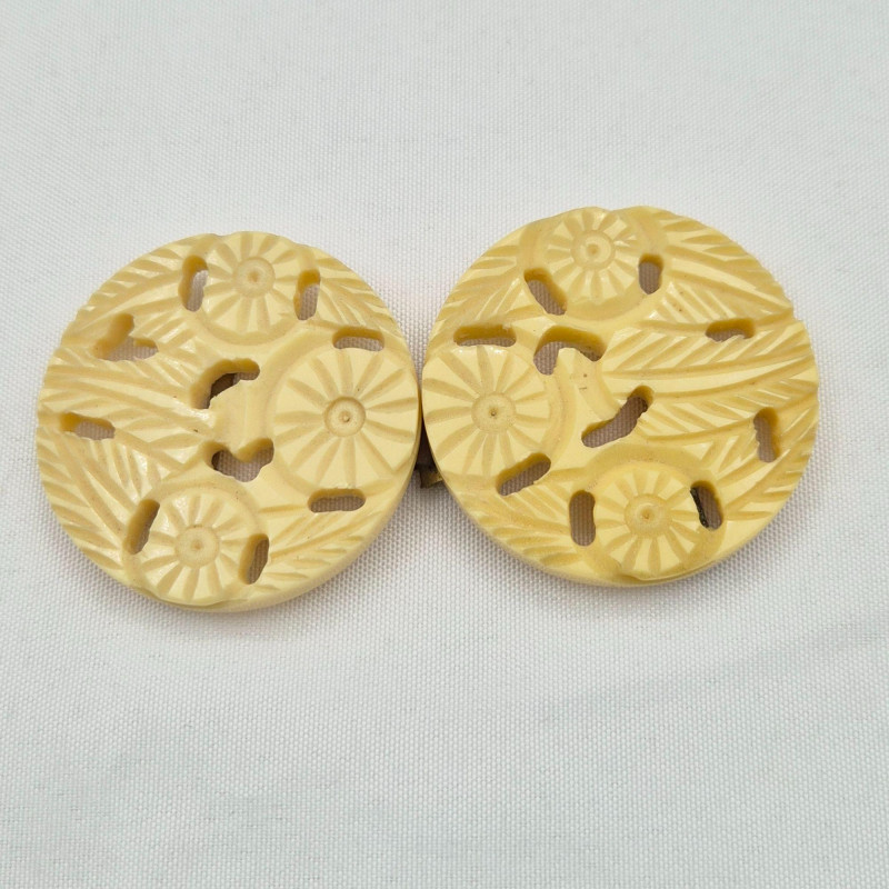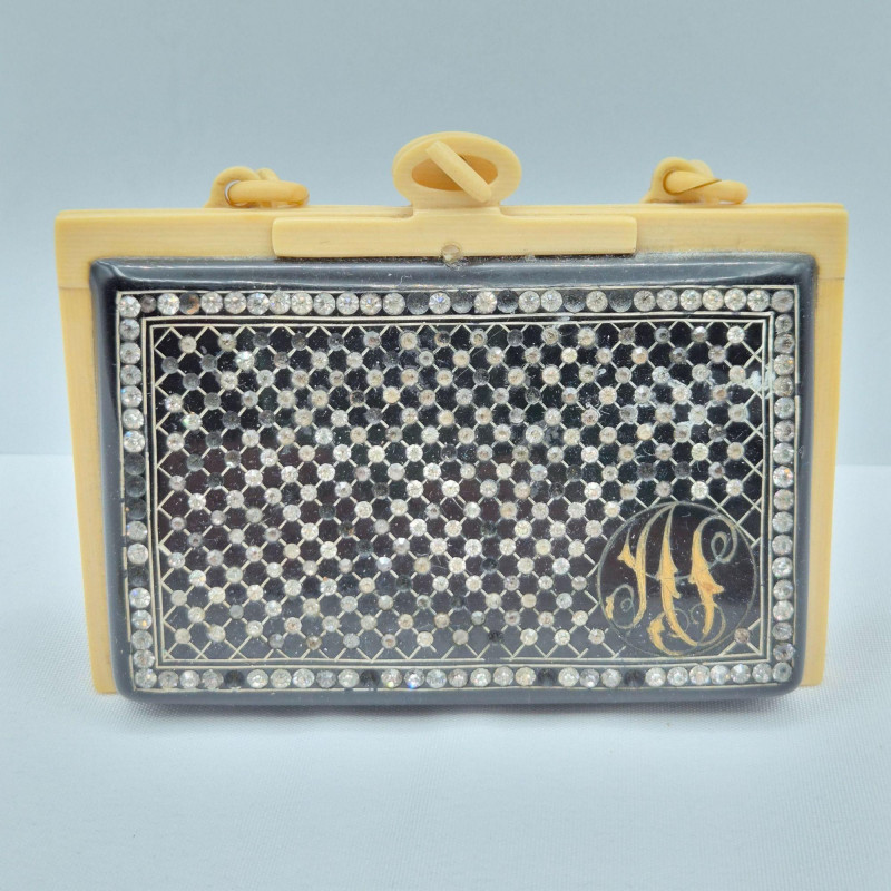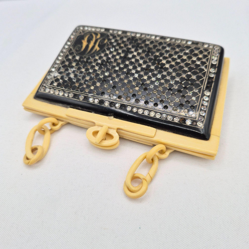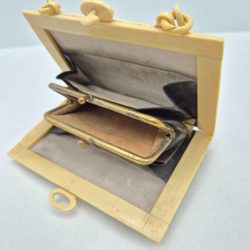 A delicate mix of antique carved celluloid accessories, including: The coin purse features a decorative exterior but requires strap replacement and has several rhinestones missing — ideal for restoration or repurpose. A lovely lot for collectors of early plastics, vintage fashion components, or anyone drawn to the elegance of pre‑WWII celluloid craftsmanship.