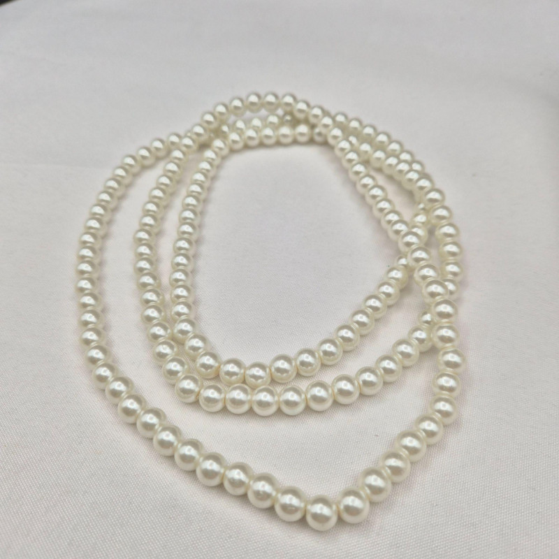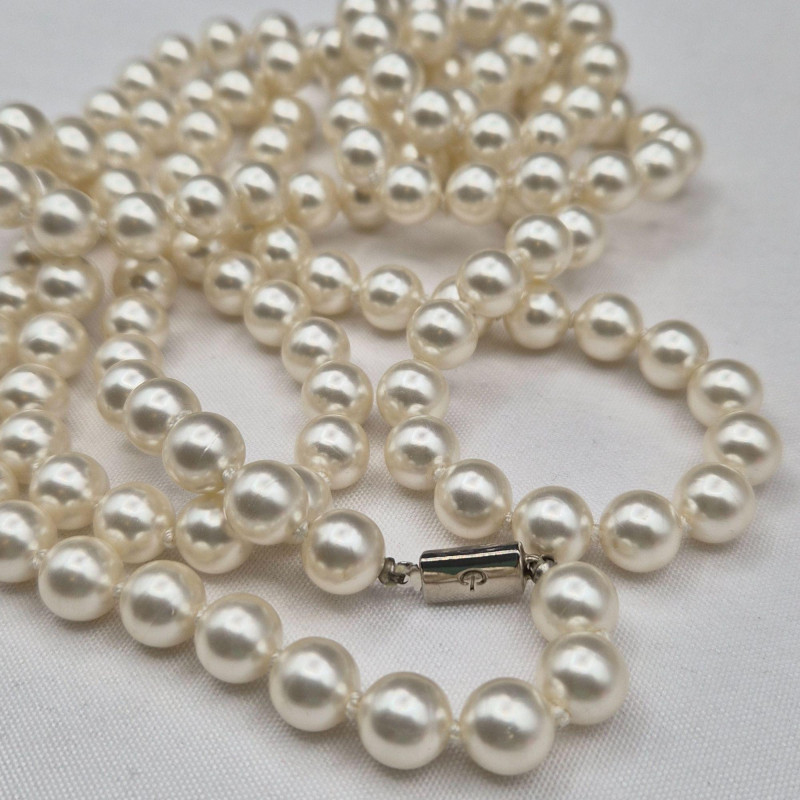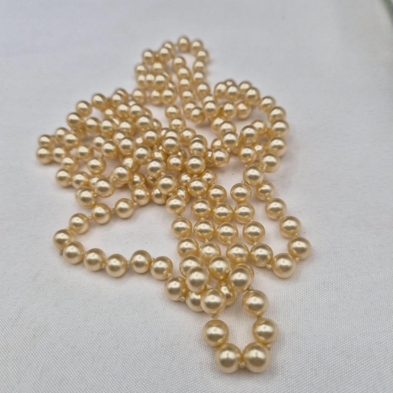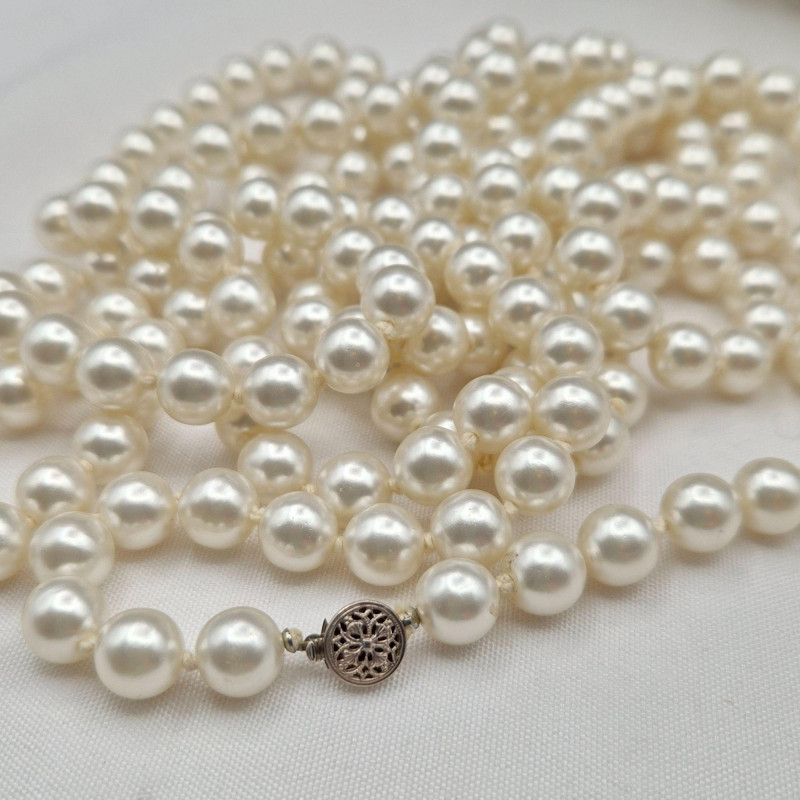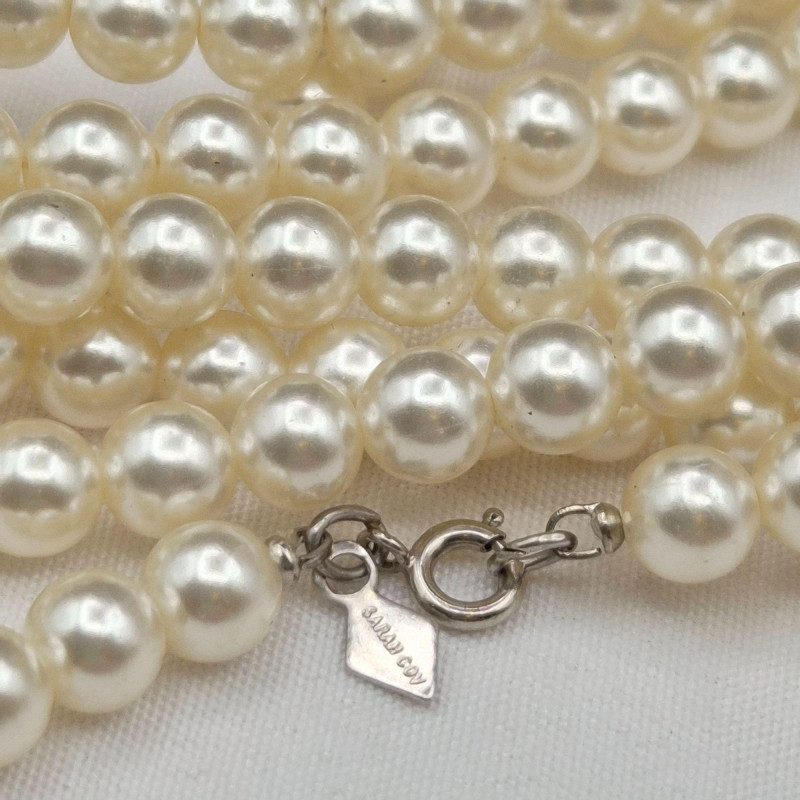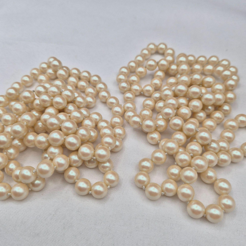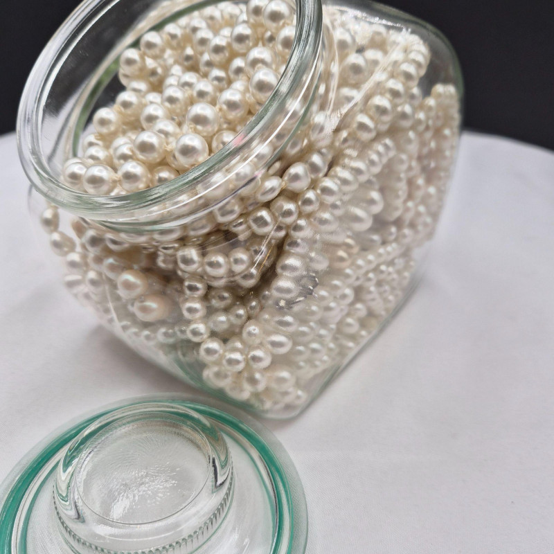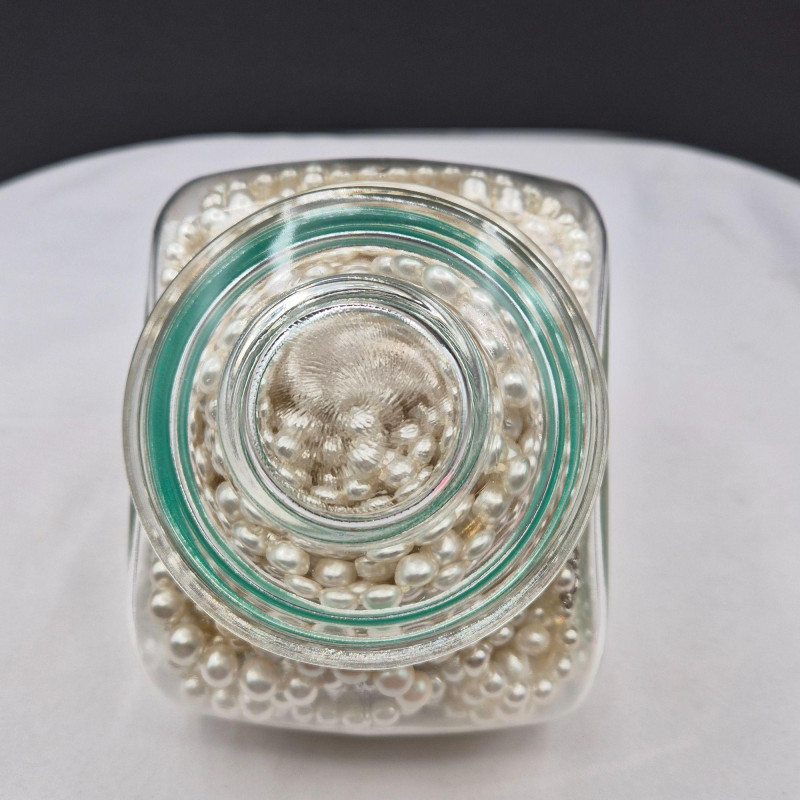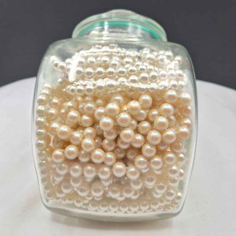 A charming display of eleven long faux pearl necklaces, beautifully presented in a clear glass canister jar measuring 6" x 6" x 4.5". This curated mix includes strands ranging from approximately 50" to an impressive 102", offering endless styling and layering possibilities. Among the collection is one Sarah Coventry necklace and one strand with an ornate clasp, possibly silver. All pieces are wearable, making this a versatile lot for costume jewelry lovers, crafters, or anyone who enjoys dramatic, vintage‑inspired pearl looks. A lovely decorative presentation and a fun treasure‑style assortment in one.