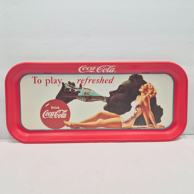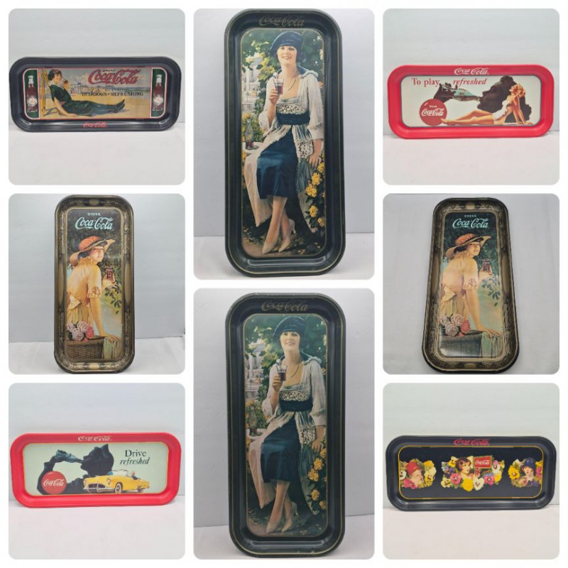 Eight Coca-Cola reproduction advertisement trays, each measuring 19" x 8.25", showcasing classic branding from the 1970s through the 1990s. These metal trays feature iconic imagery and vintage flair, ideal for wall display, shelf styling, or serving with a splash of Americana. Whether you're a Coke memorabilia collector or just love retro graphics, this set delivers timeless refreshment. Two are duplicate patterns.