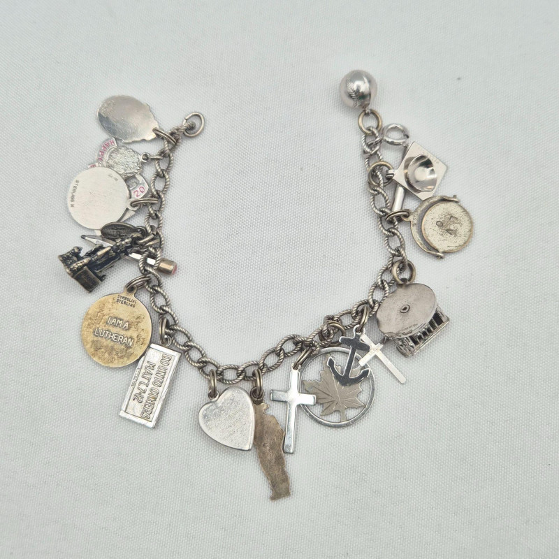 A delightful vintage sterling silver charm bracelet loaded with personality, history, and collectible appeal. This piece features 16 sterling charms, most of them signed, spanning souvenir themes, milestone moments, and classic mid‑century charm motifs. Each charm adds its own story, creating a bracelet that feels both nostalgic and beautifully curated. The bracelet and charms together weigh 41.7 grams of sterling silver, offering both substance and style. A wonderful find for charm‑bracelet enthusiasts, sterling collectors, or anyone who loves jewelry with character and meaning.