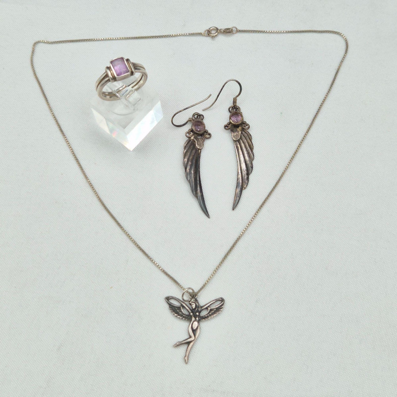 Lot # 114 - Fairy Wings & Amethyst – Sterling Silver Ring, Earrings & Necklace
