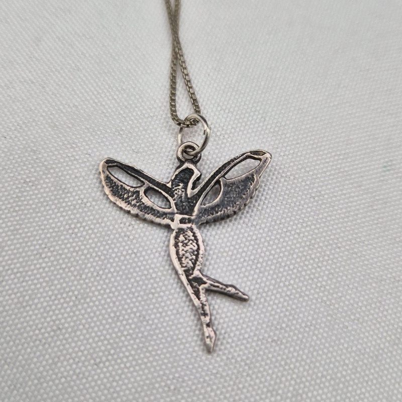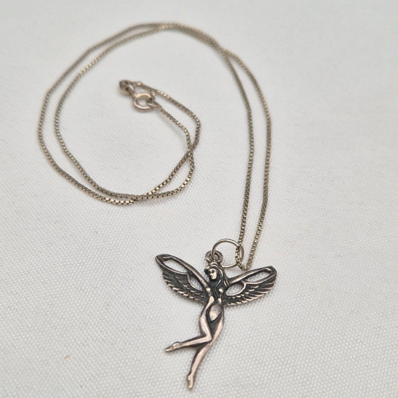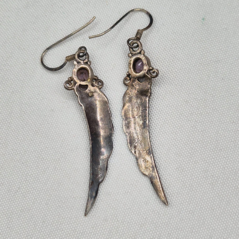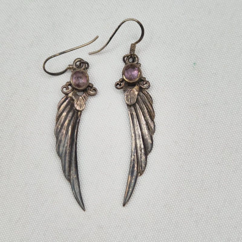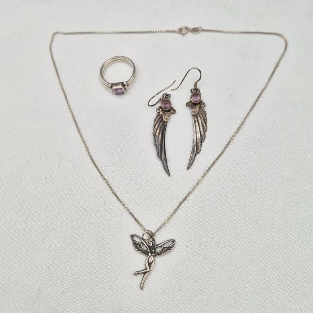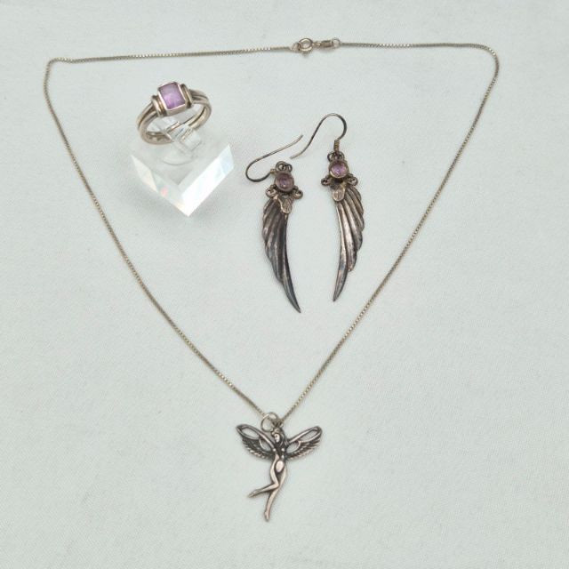 A magical trio of vintage sterling silver jewelry featuring amethyst and winged motifs. The set includes a 925 amethyst ring, size 6, with a bezel set stone; a pair of 925 dangle wing earrings accented with amethyst; and a 925 fairy pendant suspended from a 15" sterling silver chain. Each piece shows a lovely natural patina that enhances its vintage character. Total combined weight: 13 grams. A charming, cohesive set for lovers of fantasy‑inspired silverwork and gemstone jewelry.
