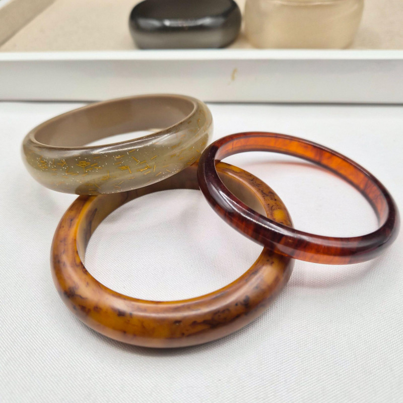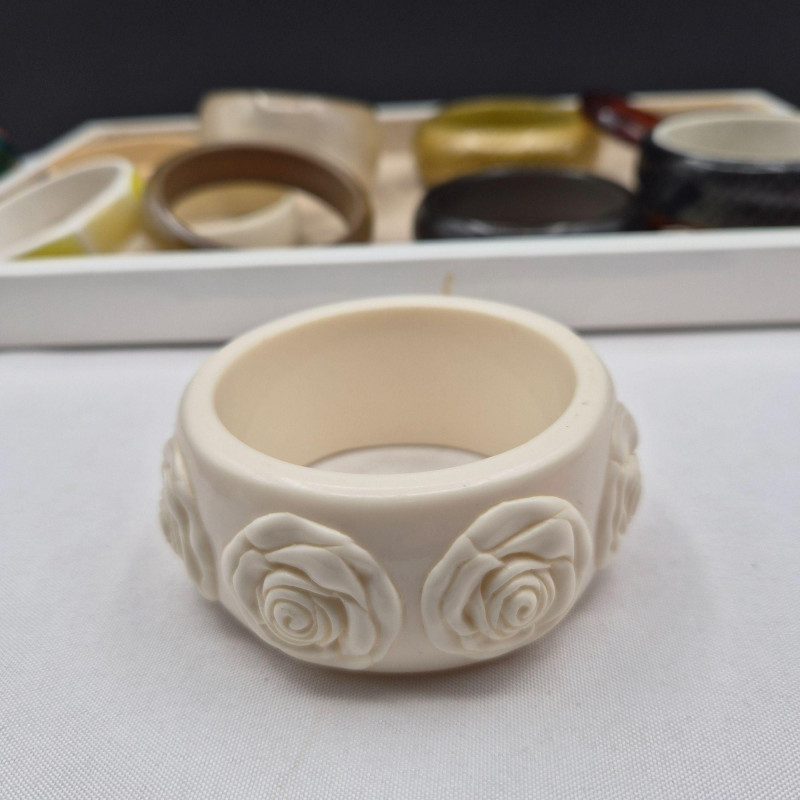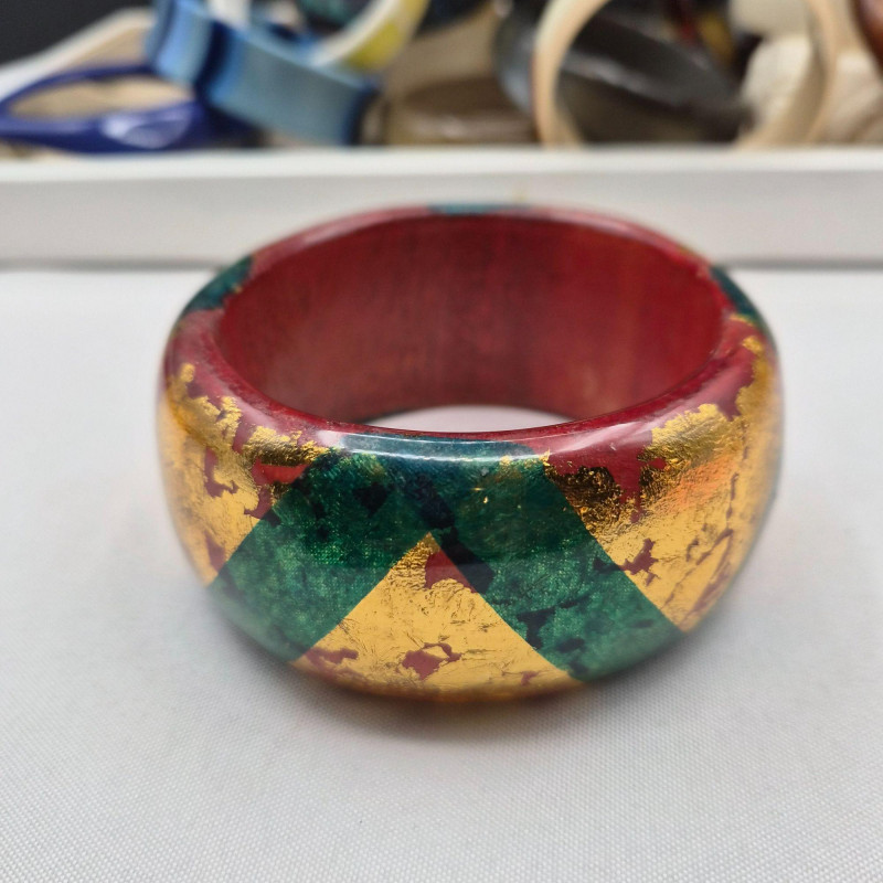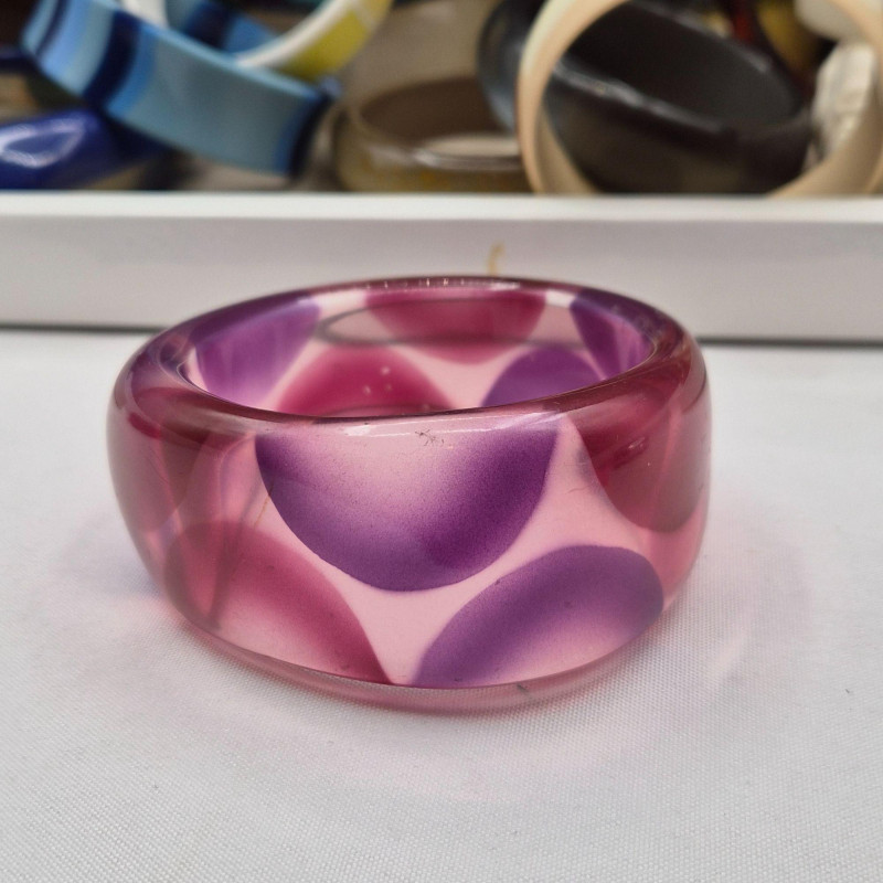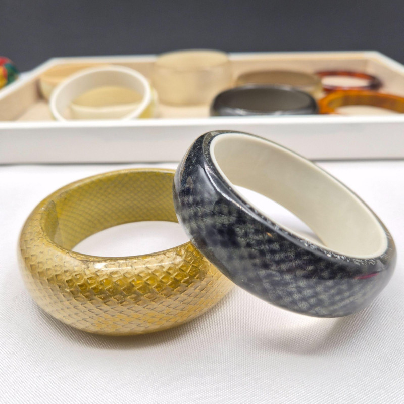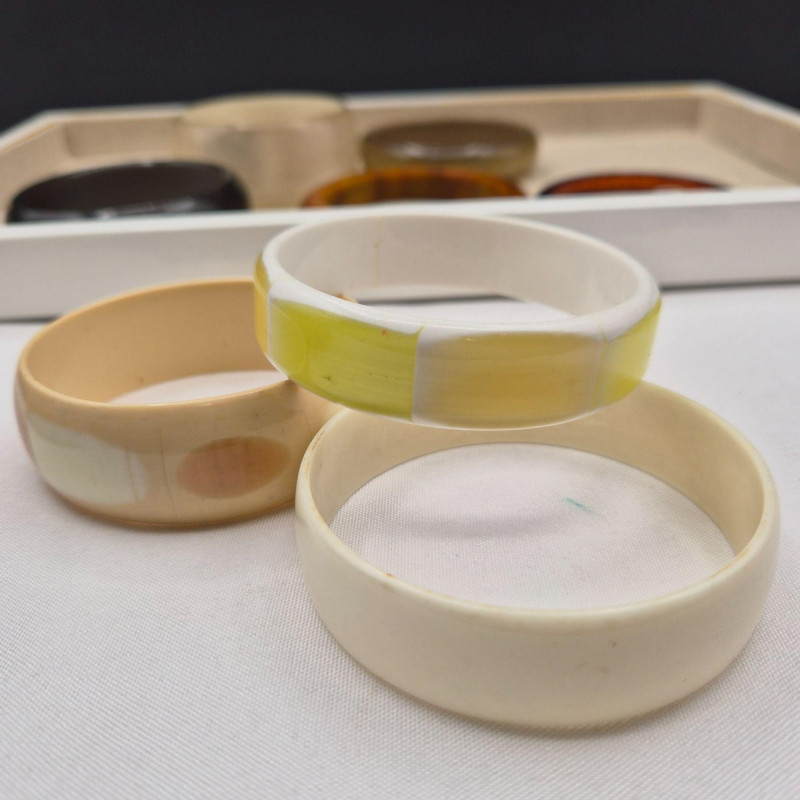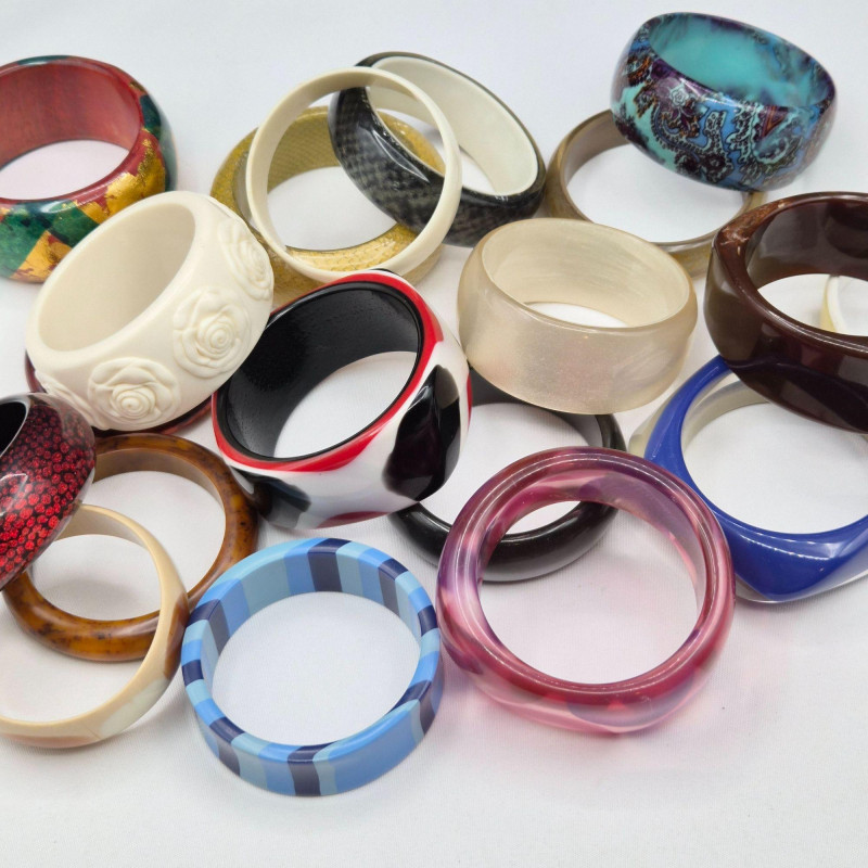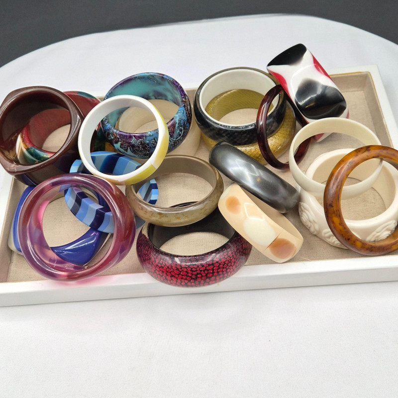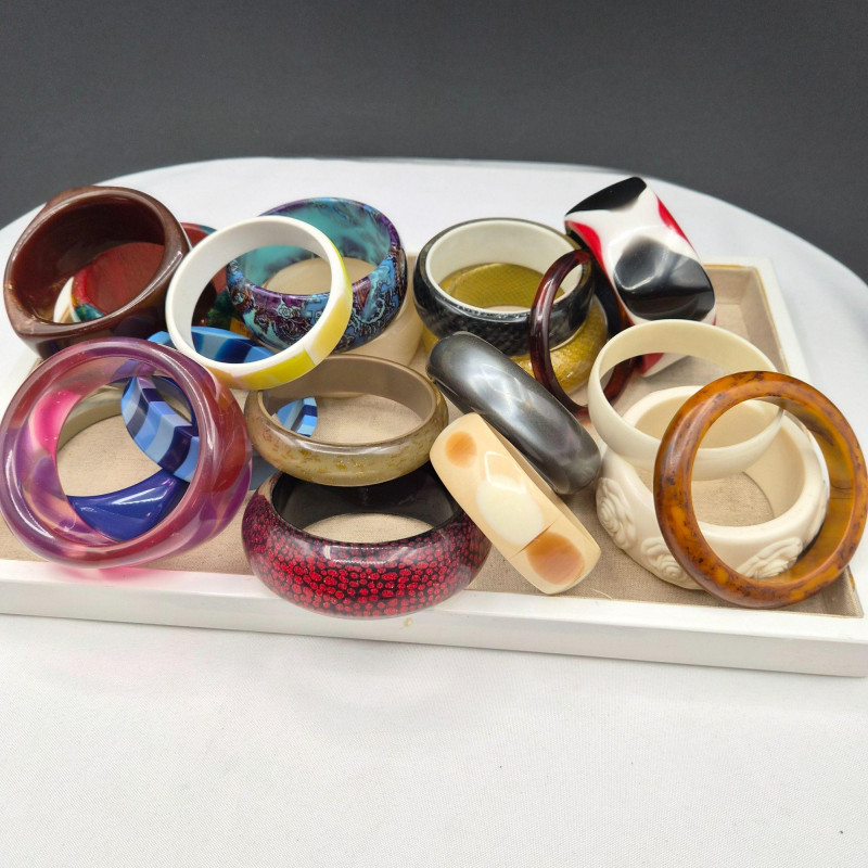 A vibrant assortment of nineteen retro plastic bangles, featuring mostly wide designs in an eye‑catching mix of colors, patterns, and styles. This playful collection channels classic mid‑century and ’70s–’80s fashion, perfect for stacking, styling, or adding a pop of vintage flair to any outfit. Great for costume jewelry lovers, retro fashion fans, or crafters looking for bold, colorful components. A fun, expressive lot with plenty of personality.