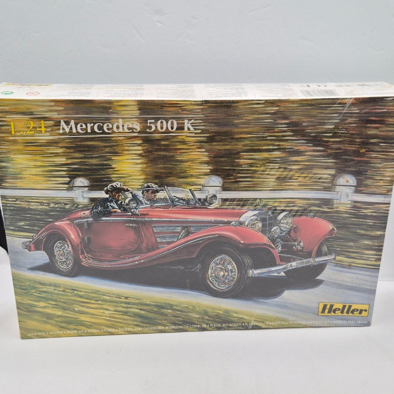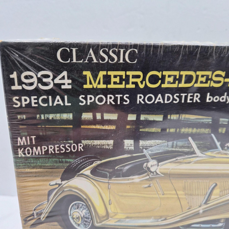 A striking pair of vintage model car kits, both featuring the legendary 1934 Mercedes-Benz 500K, celebrated for its luxury, power, and timeless design. These kits are factory sealed in original packaging, ideal for collectors of classic automotive models. Both kits offer vintage packaging appeal, historical automotive significance, and buildable beauty for model enthusiasts or display collectors.