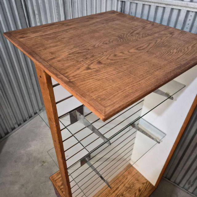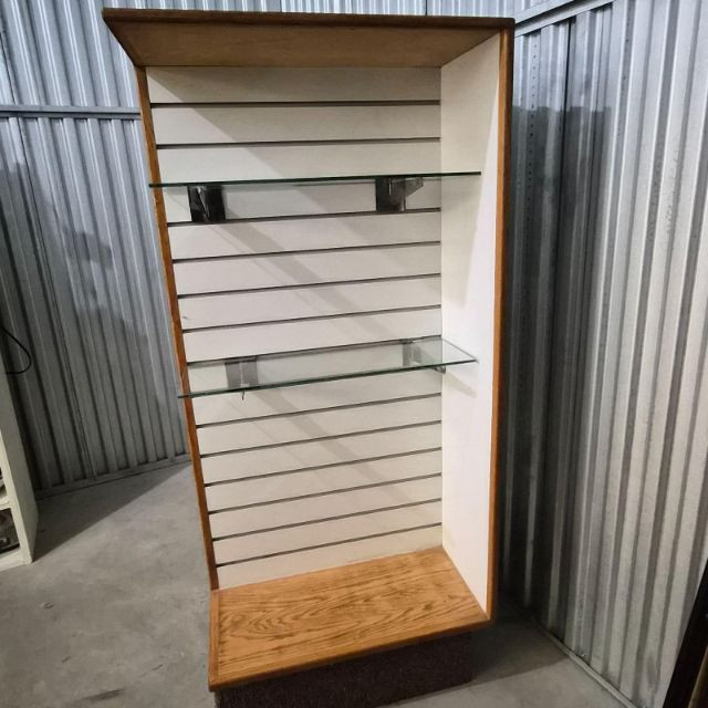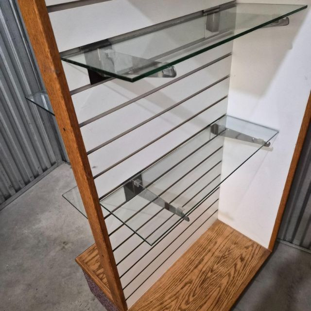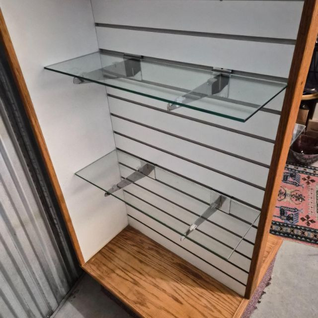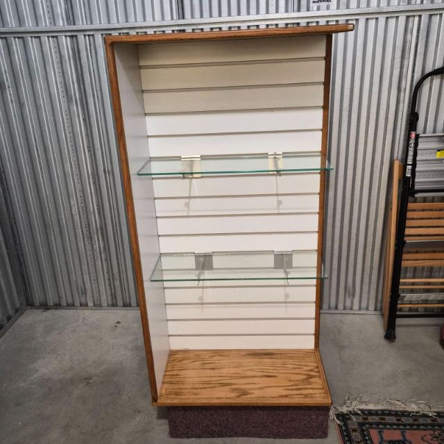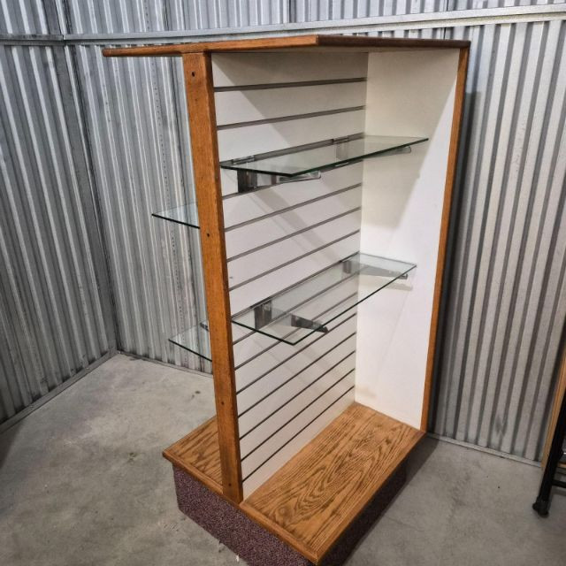 A versatile three‑sided retail display unit designed for maximum visibility and a compact footprint. Each side offers clear presentation space for merchandise, collectibles, or boutique displays. The adjustable glass shelves allow flexible arrangement, and extra pegs are included for easy customization. Features: ***Note*** This item is at a different pick up location (Bothell).
