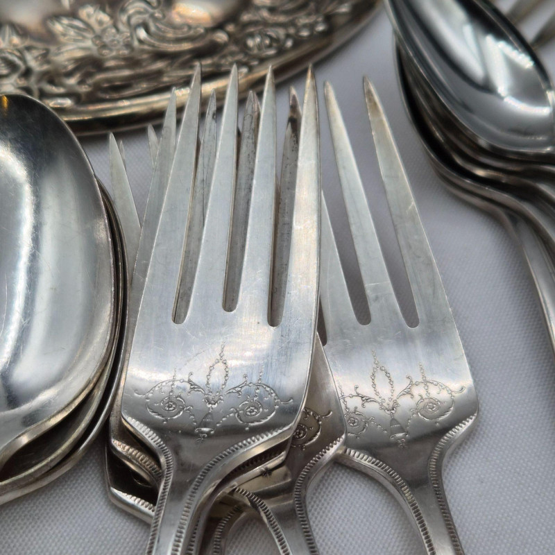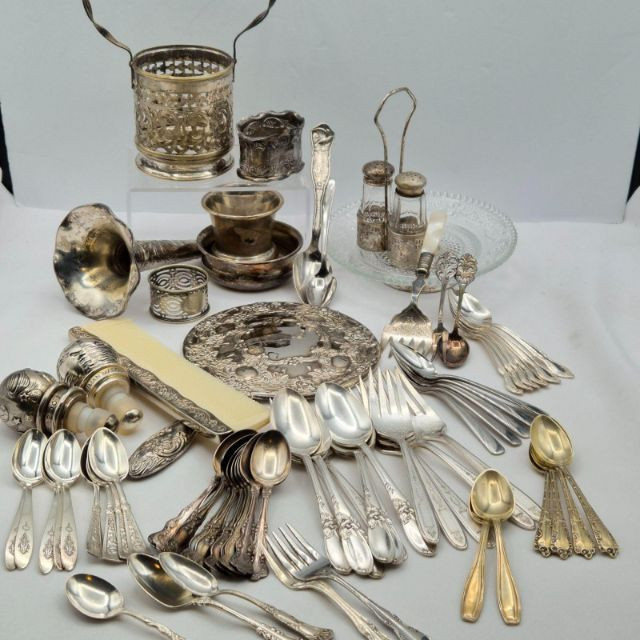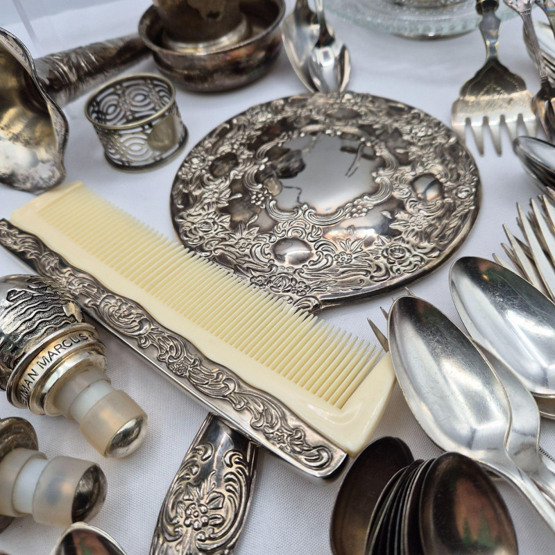 A varied selection of silverplate items ideal for collectors, decorators, jewelry makers, and repurpose crafters. This lot blends functional tabletop pieces with charming vanity accents. Includes: A versatile, creativity‑ready lot with plenty of shine and character.