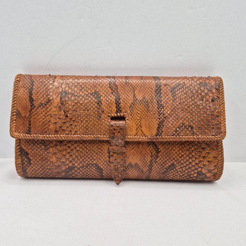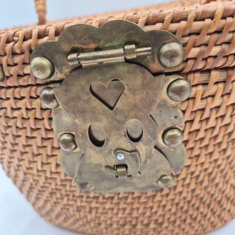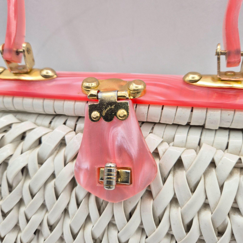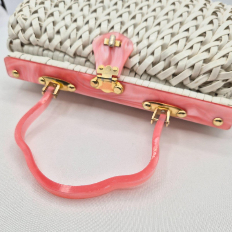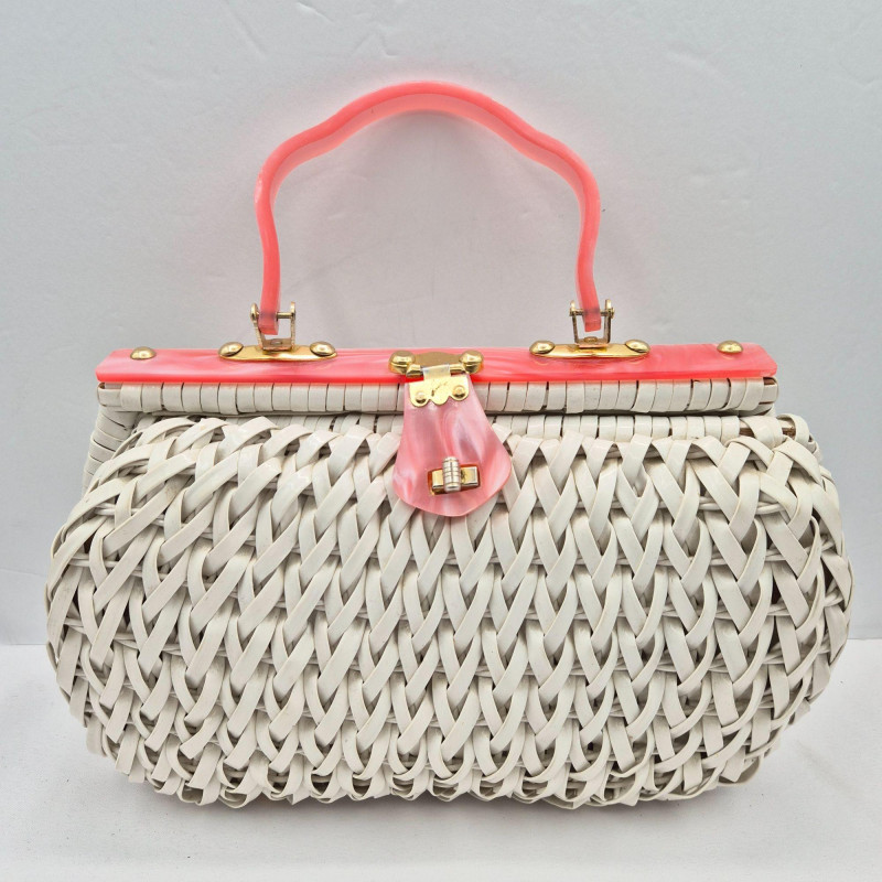 Assortment of vintage wicker and snakeskin purses, featuring a mix of natural and white lacquered finishes. These clutch and handbag styles span various eras, offering a tactile blend of woven texture and exotic flair. The white finished purse with pink Lucite accents and handle, has makers tag inside, Hollywood Shaggee of California (made in Hong Kong). Perfect for collectors, stylists, or anyone drawn to retro accessories with bold materials and timeless silhouettes.