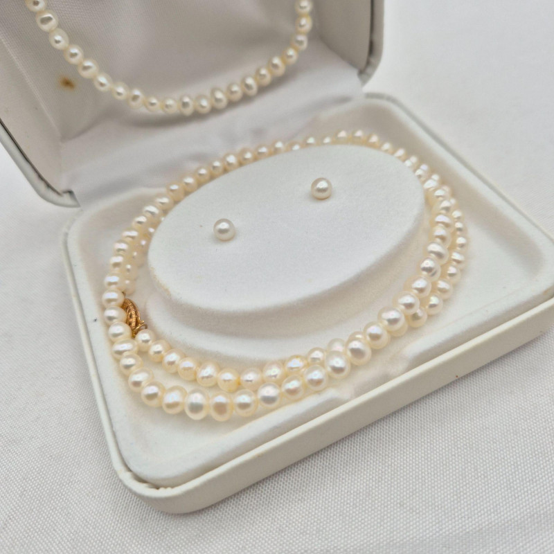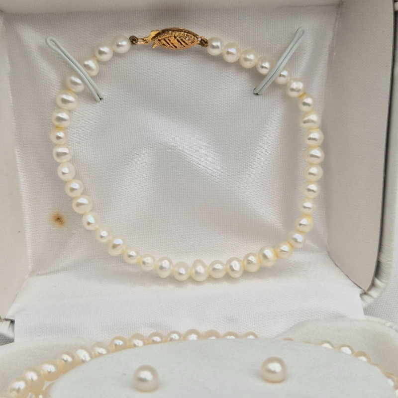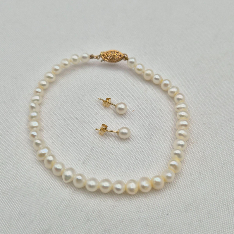 A timeless trio of genuine petite white pearls, each piece finished with 14k gold clasps and earring backs for a refined touch. This elegant set includes: The pearls measure approximately 4mm, offering a delicate silhouette that’s perfect for layering or gifting. A classic ensemble for bridal, heirloom, or everyday sophistication.