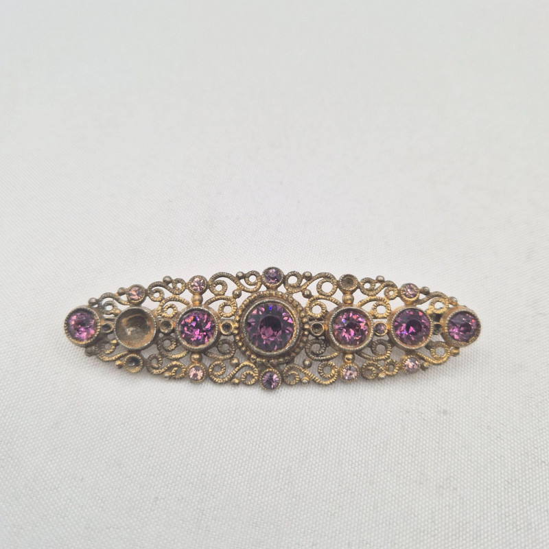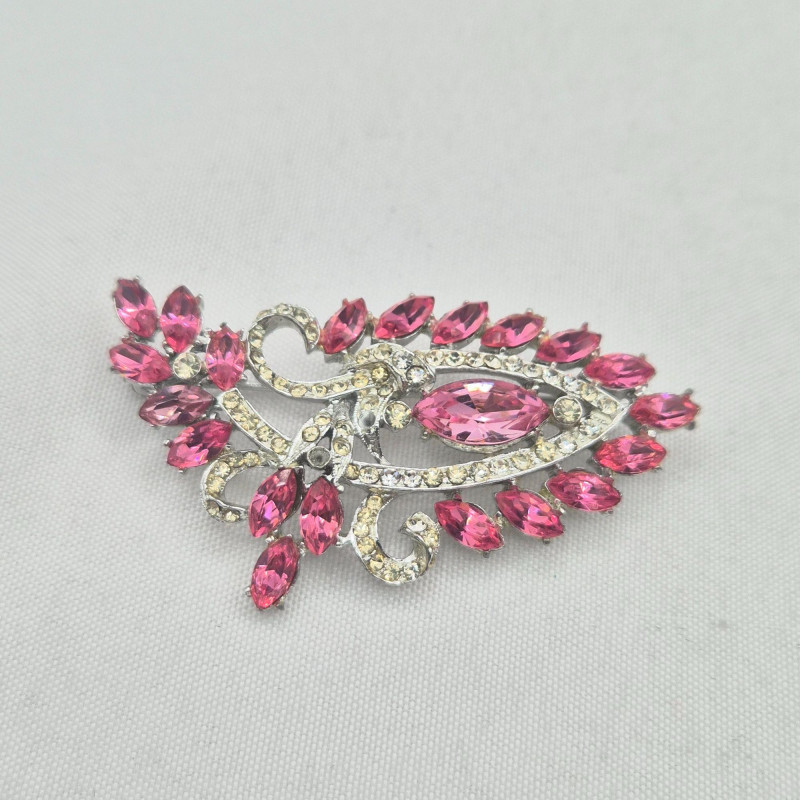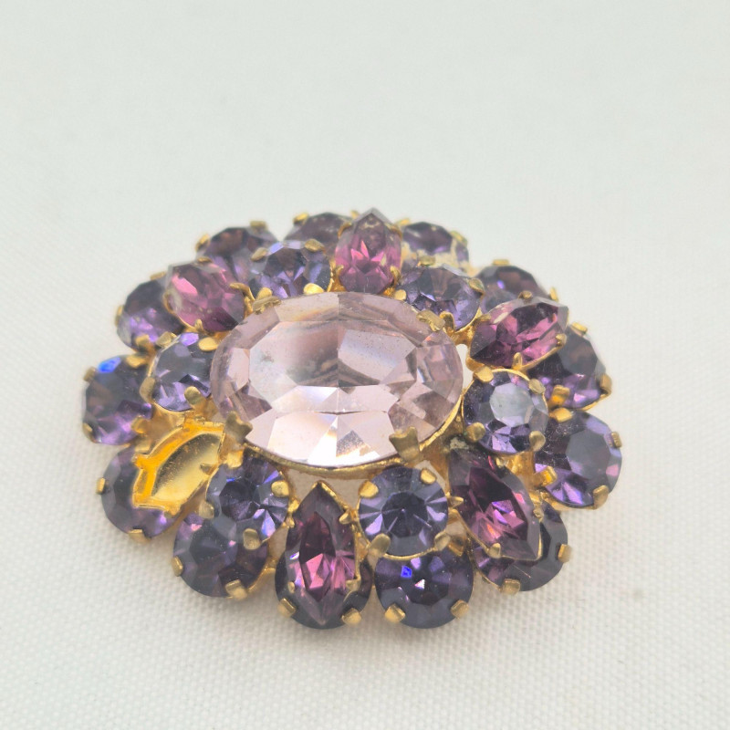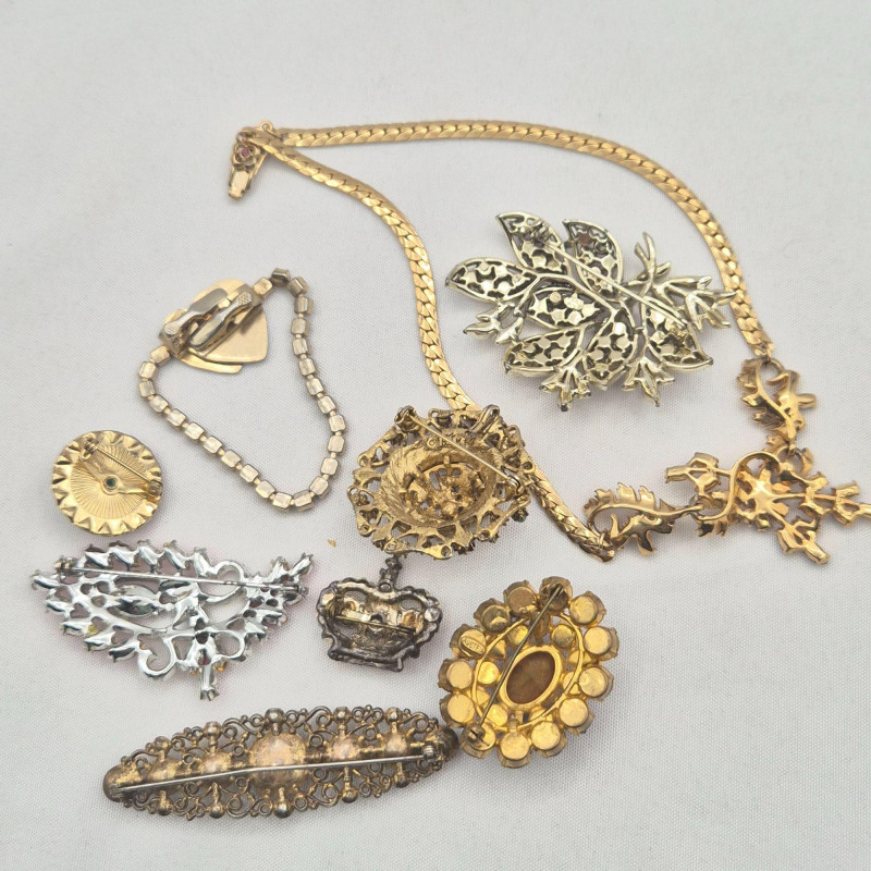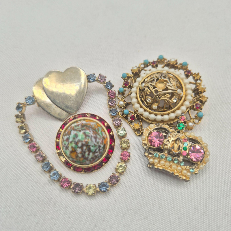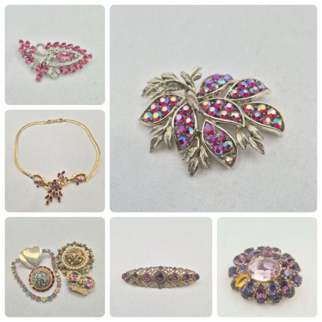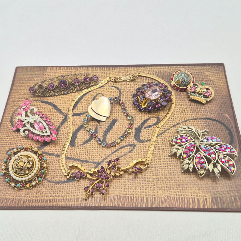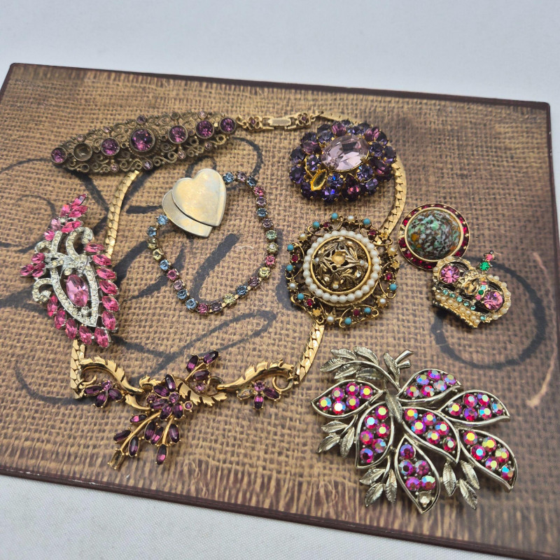 A treasure trove for rhinestone lovers and creative fixers. This sparkling assortment features fabulous vintage pieces in pinks, purples, and rich reds, many marked by classic makers including Austria, BSK, Coro, and more. Most pieces are only missing a single stone, making them perfect candidates for easy restoration—or ideal for harvesting vibrant vintage rhinestones for your next project.