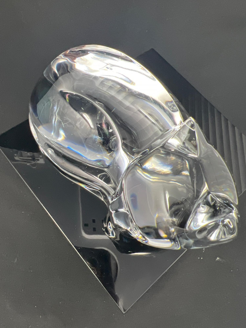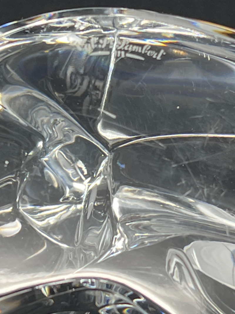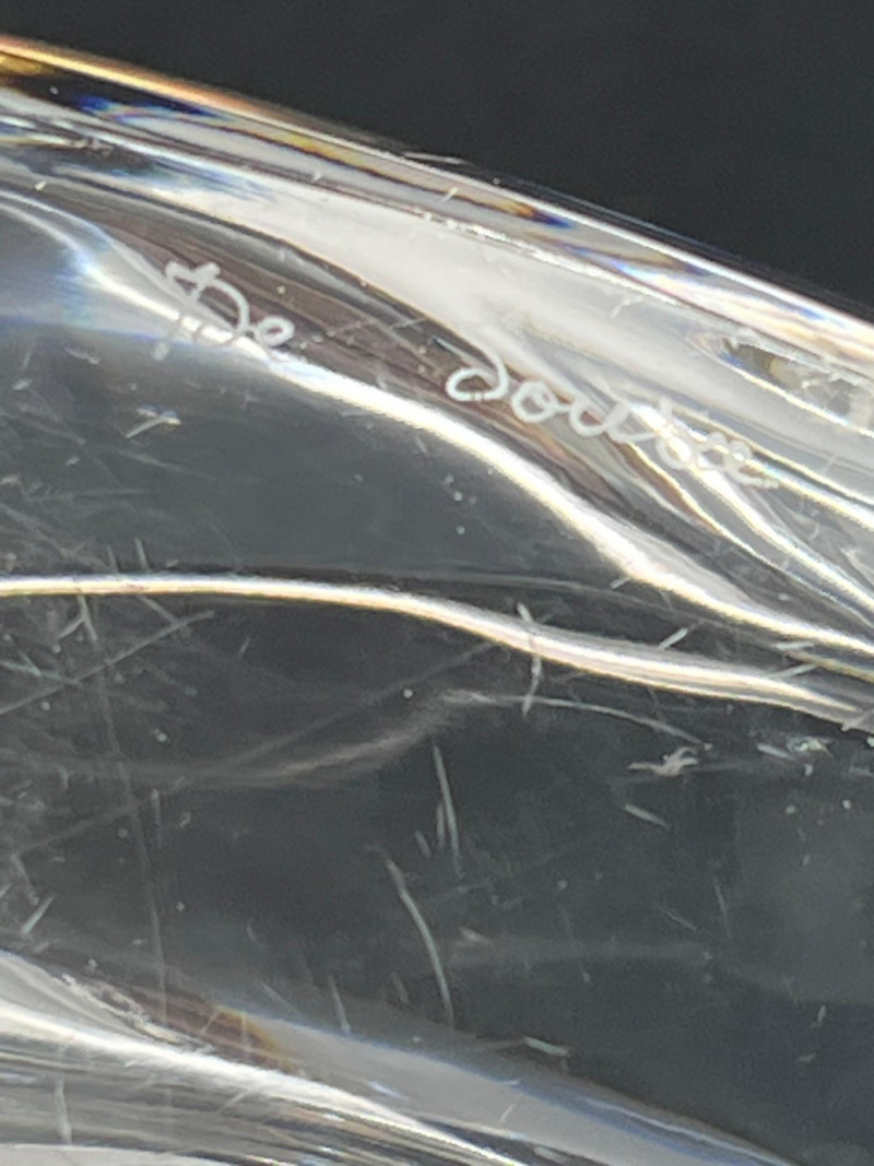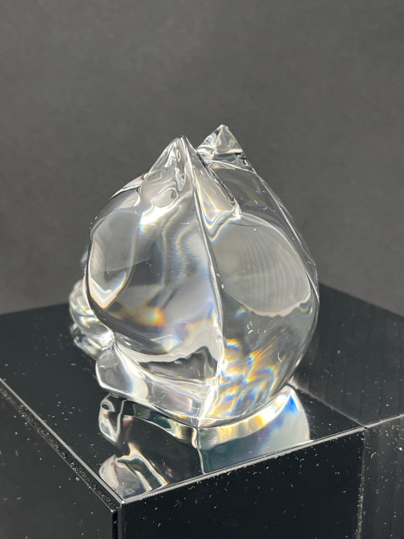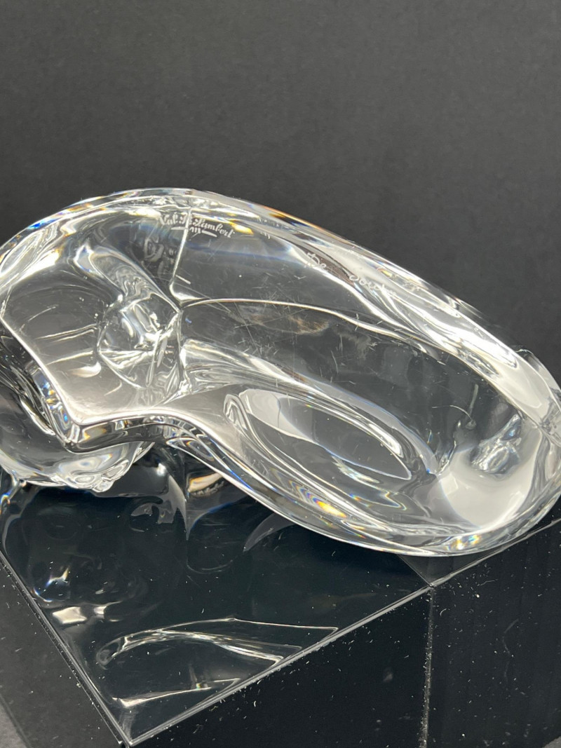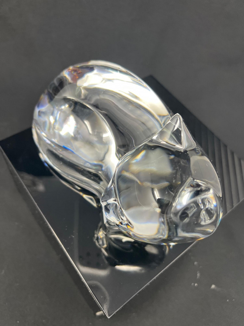 A clear crystal cat sculpture by Val Saint‑Lambert, Belgium’s premier royal crystal house. This hand‑finished piece features a curled, resting cat rendered in smooth, modernist form with excellent clarity and polish. The base is etched with the Val Saint‑Lambert signature along with the model designation “Des Sousa”, used by the studio to identify specific designs and production runs. A refined example of mid‑century to late‑20th‑century European crystal craftsmanship, ideal for collectors of animal sculptures, Belgian crystal, or Val Saint‑Lambert decorative art.