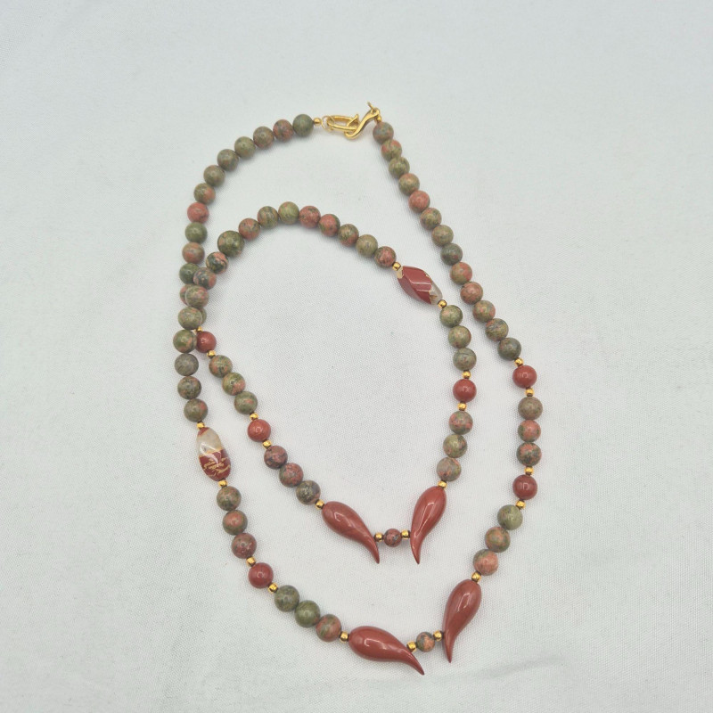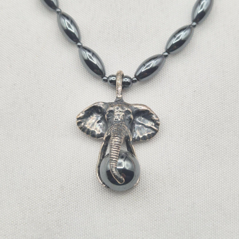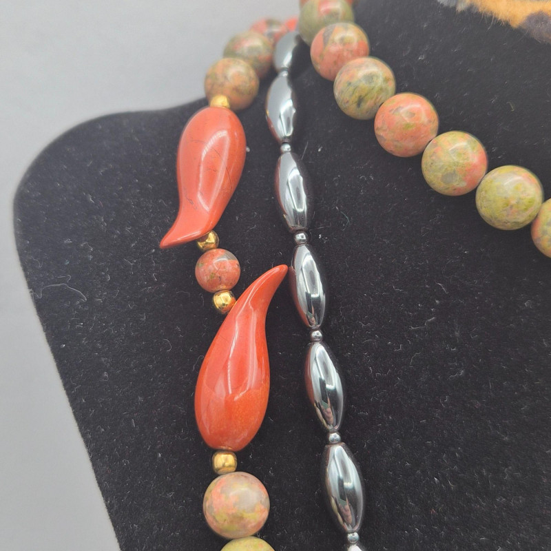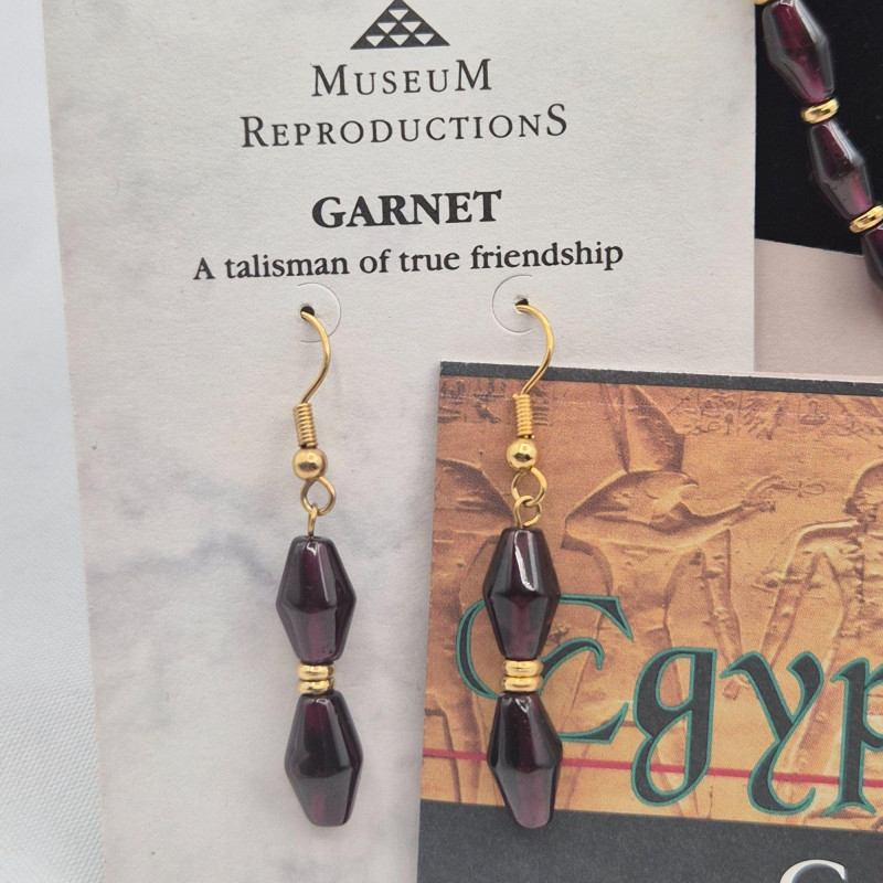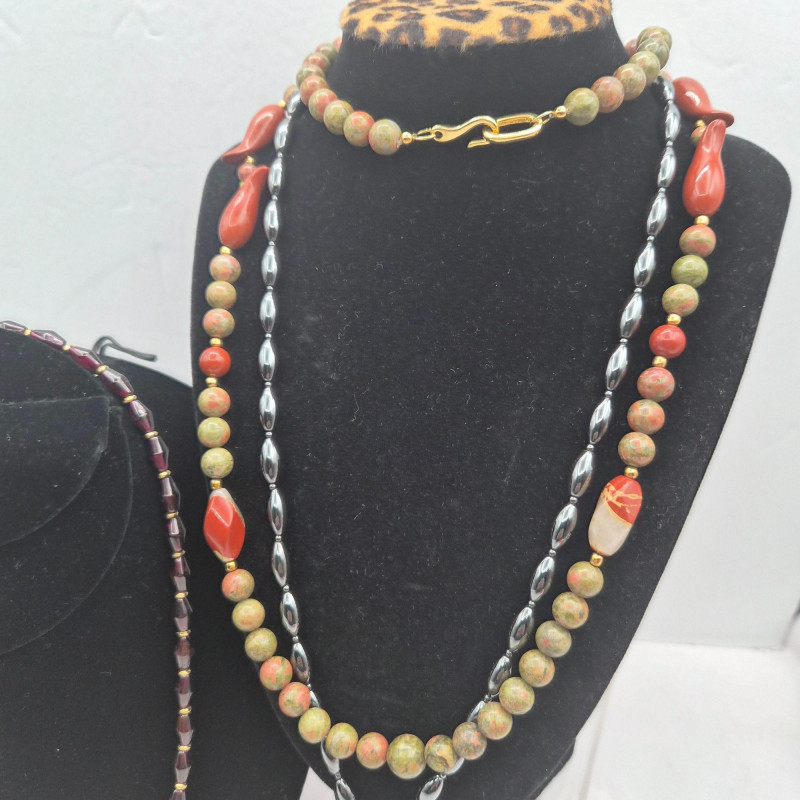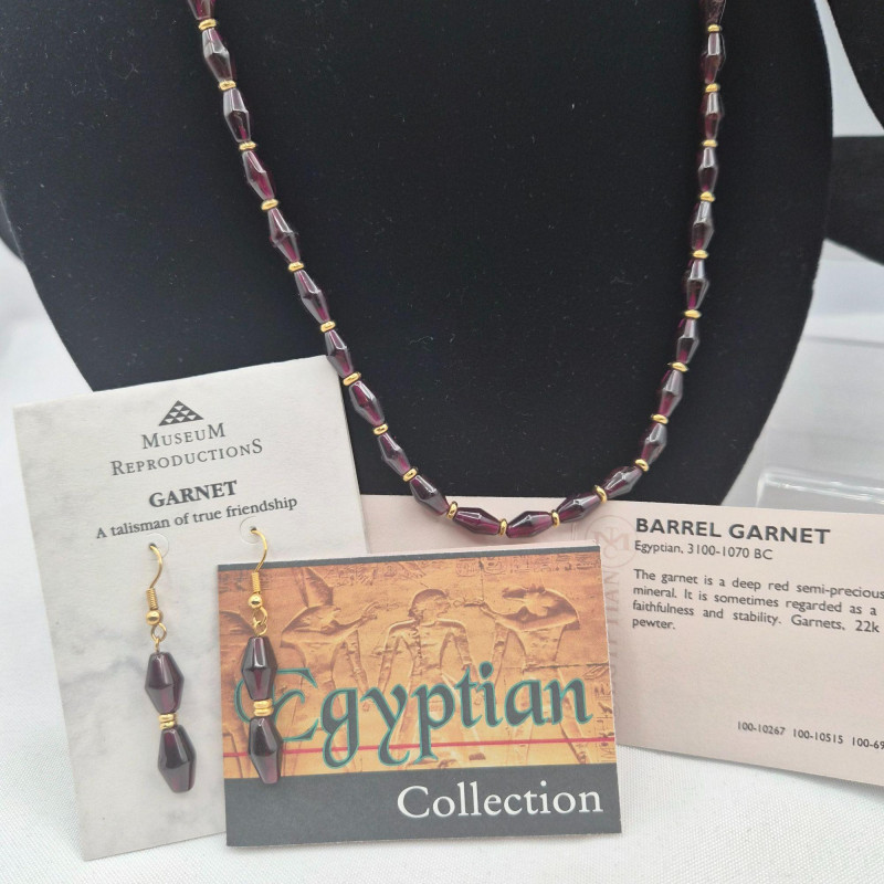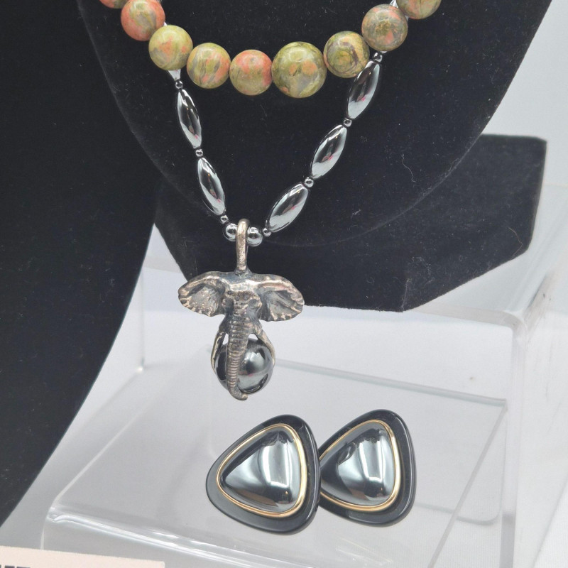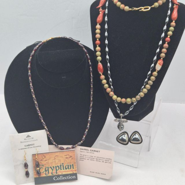 A richly toned collection featuring three distinctive gemstone looks. The 21" Hematite bead necklace showcases an artisan‑crafted elephant pendant, paired with sleek triangle Hematite pierced earrings. A 30" Jasper‑Agate necklace brings earthy warmth and natural patterning. Completing the set is an 18" Garnet bead necklace with matching earrings from the Museum Reproductions Egyptian Collection, featuring deep red barrel‑cut Garnets accented with 22k gold over pewter. A beautiful blend of bold, grounding stones and handcrafted charm.