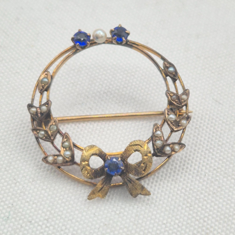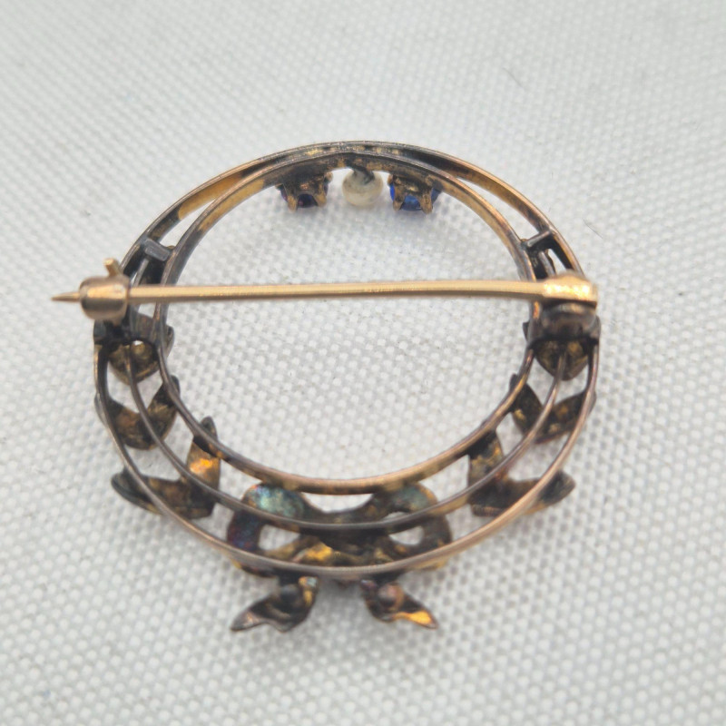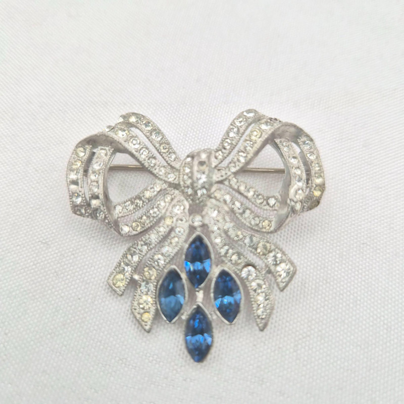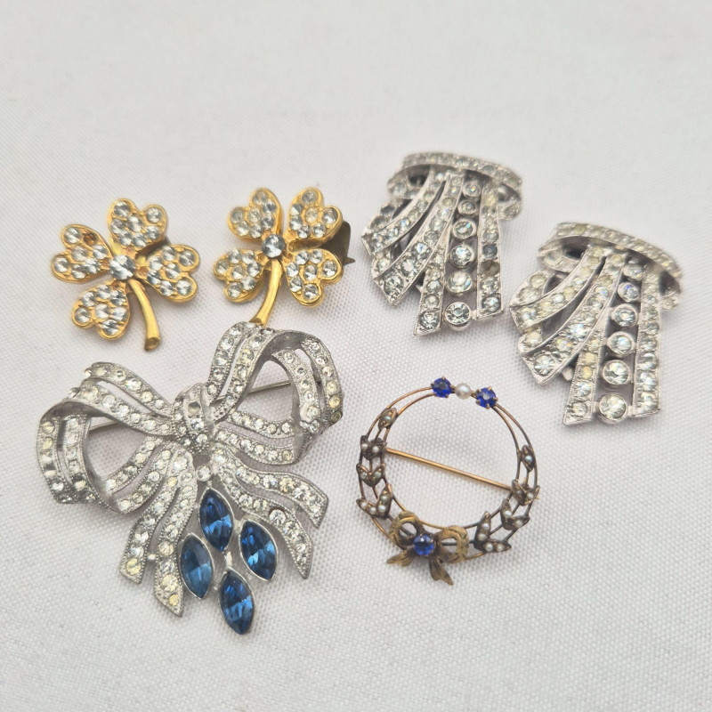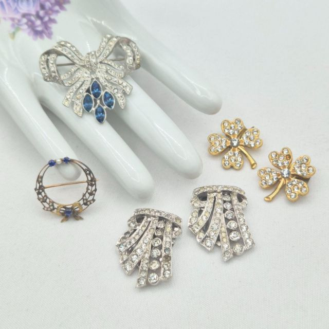 A graceful mix of antique and vintage sparkle, ideal for restoration or creative reuse. This lot includes elegant rhinestone shoe clips, a pot‑metal bow brooch, and classic dress clips—each with timeless style and only a few missing stones. The standout piece is a small 1" x 1" antique circle pin featuring a delicate bow design, blue stones, and seed pearls. It is complete and possibly gold‑filled, adding a touch of true period charm. A lovely assortment for collectors, designers, and anyone who enjoys bringing vintage beauties back to life.