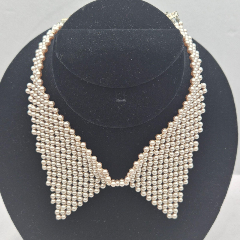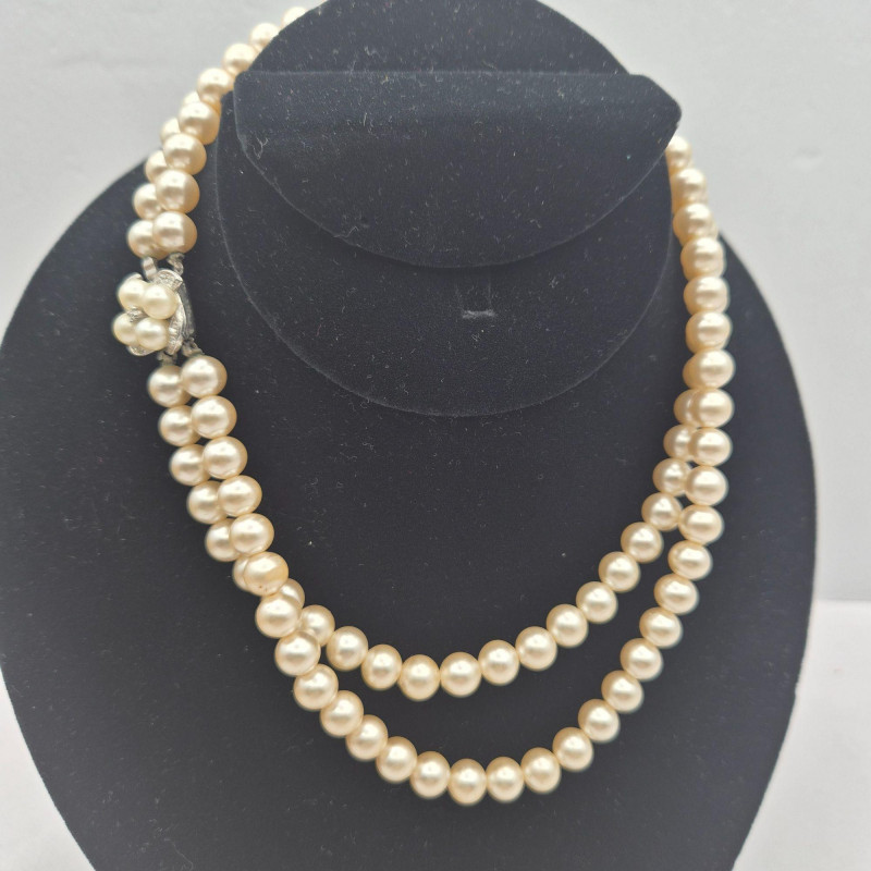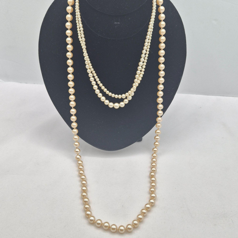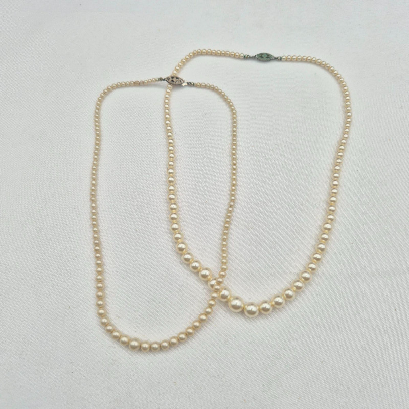 A timeless collection of classic fashion pearls in a range of elegant styles. This lot includes a pair of older graduated faux pearl necklaces, each 14" with silver clasps, offering that traditional vintage glow. A double‑strand 13–14" choker with a decorative push clasp adds a touch of sophistication, while a 30" faux pearl strand marked Japan brings graceful length and movement. Rounding out the set is a 13" faux pearl collar choker accented with sparkling rhinestones—perfect for adding a hint of glamour.