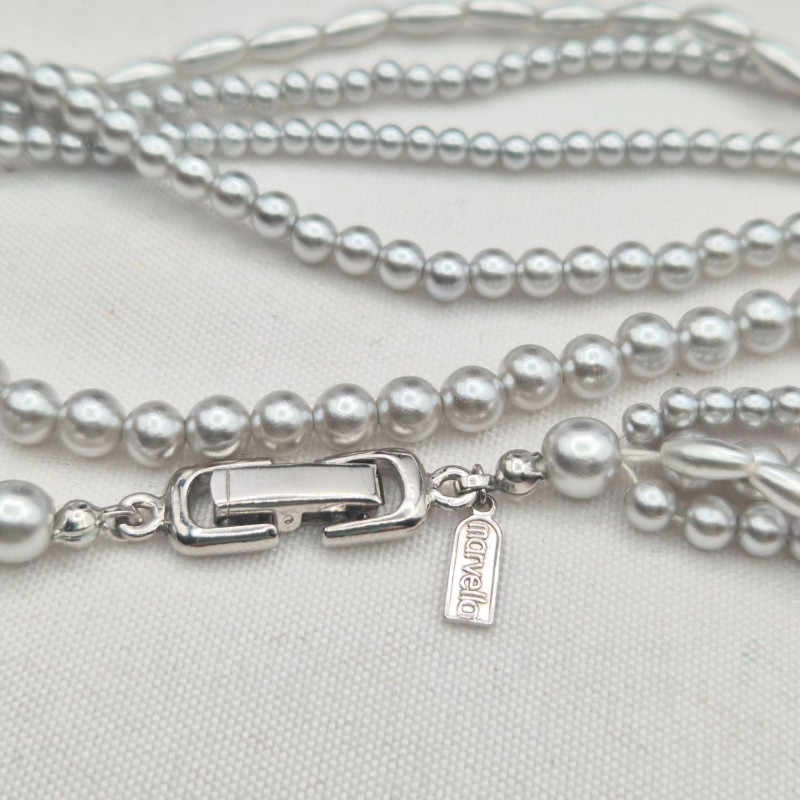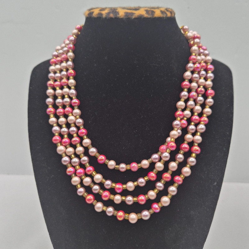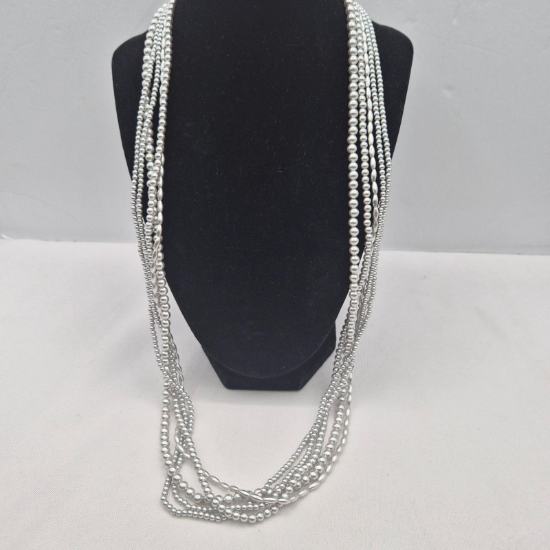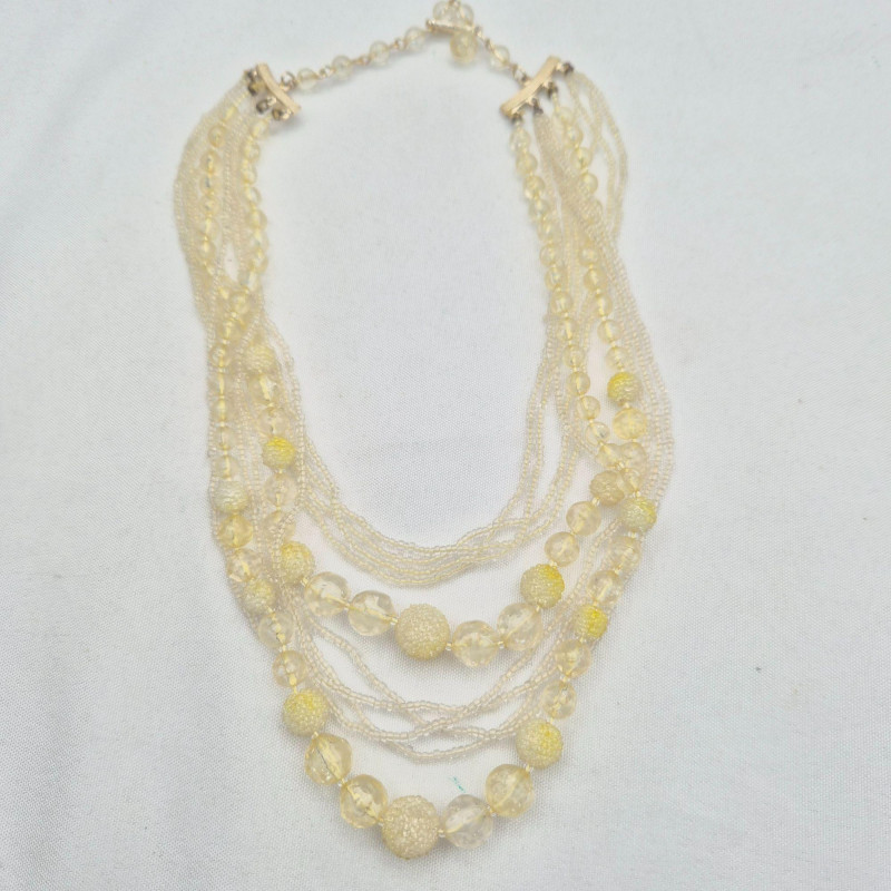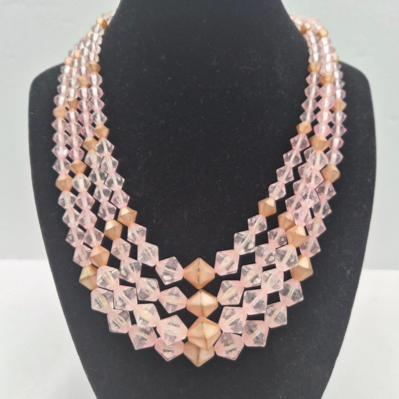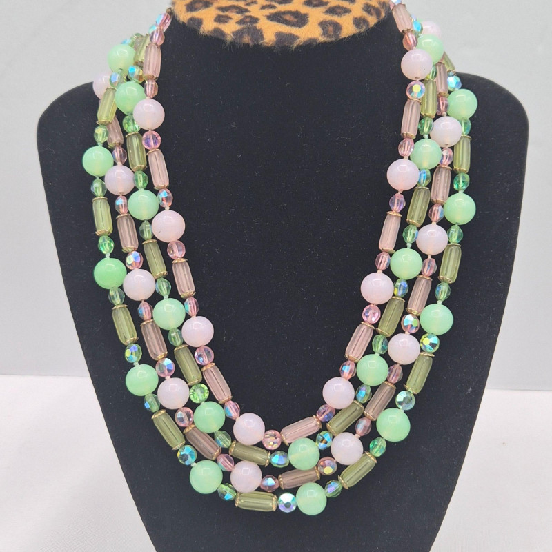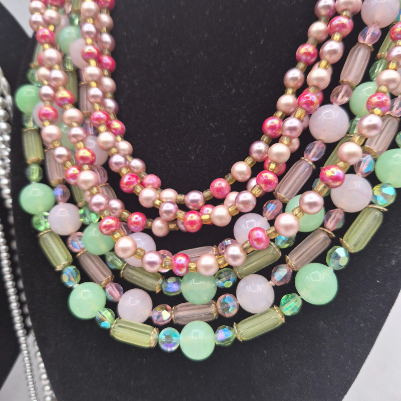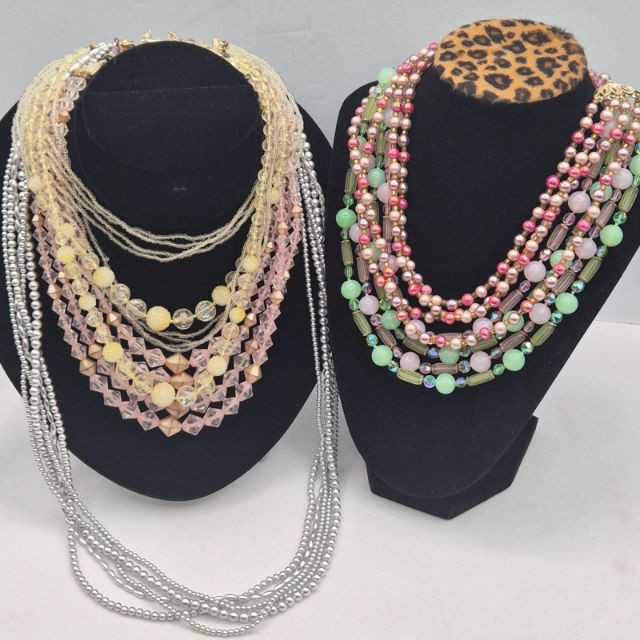 A soft, feminine mix of vintage beads in gentle pastels and shimmering neutrals. This lot features 14" Japan glass pastel bead multi‑strand necklaces, each offering that classic mid‑century charm and delicate color palette. Adding contrast is a 28" grey shimmer plastic bead necklace by Marvella, known for its elegant costume jewelry designs. A sweet, wearable mix perfect for collectors, stylists, or anyone who loves vintage beads with a graceful glow.