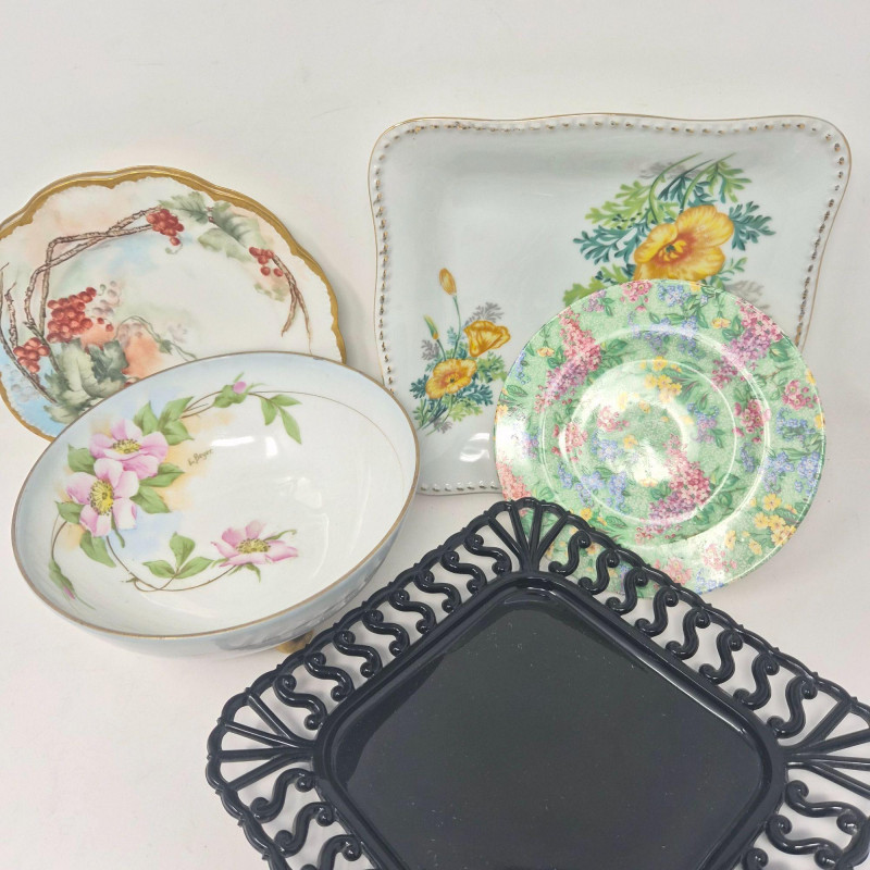 A charming assortment of vintage and antique floral plates & footed bowl from various makers, offering a lovely blend of patterns, colors, and eras. Plate sizes range from 8 inches to 10 inches, creating a visually pleasing mix for display, wall arrangements, or eclectic table settings. This curated grouping is ideal for collectors, decorators, or anyone who enjoys the romance of classic floral china.