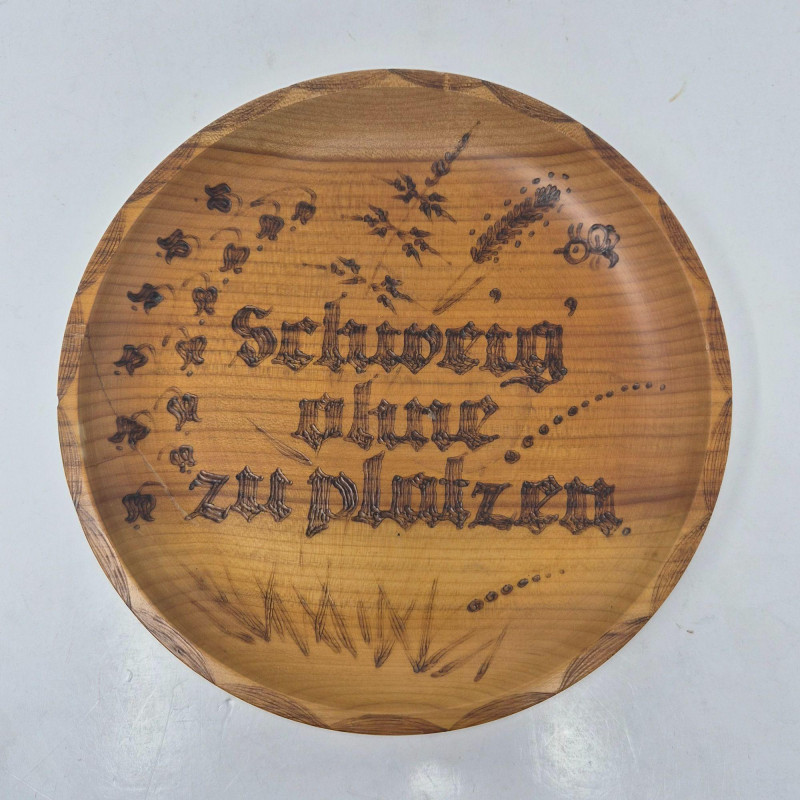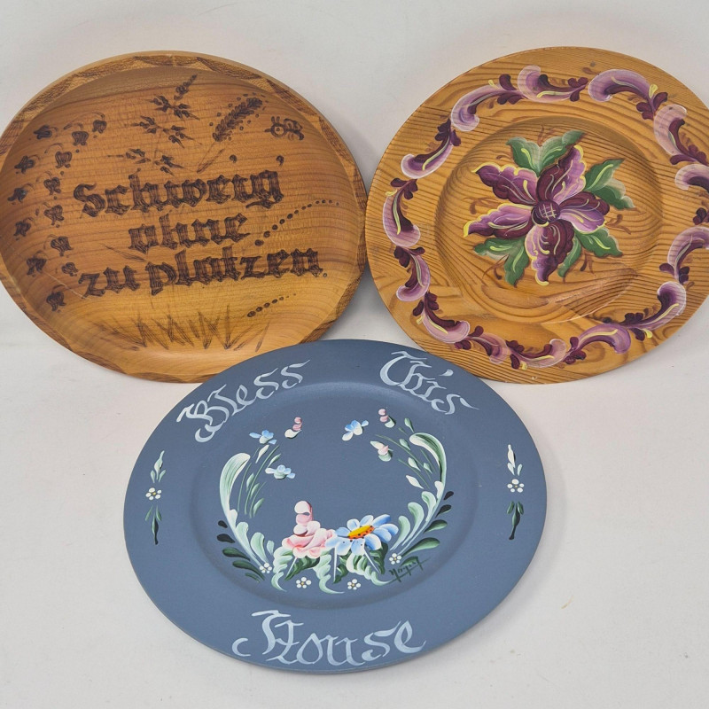 A charming trio of vintage handmade wood wall plaques from Germany, each measuring approximately 7.5 inches round. These pieces feature classic craftsmanship, warm wood tones, and the distinctive hand‑finished character associated with mid‑century German folk art. A lovely set for adding rustic European charm to a gallery wall, kitchen, or cozy cottage display.