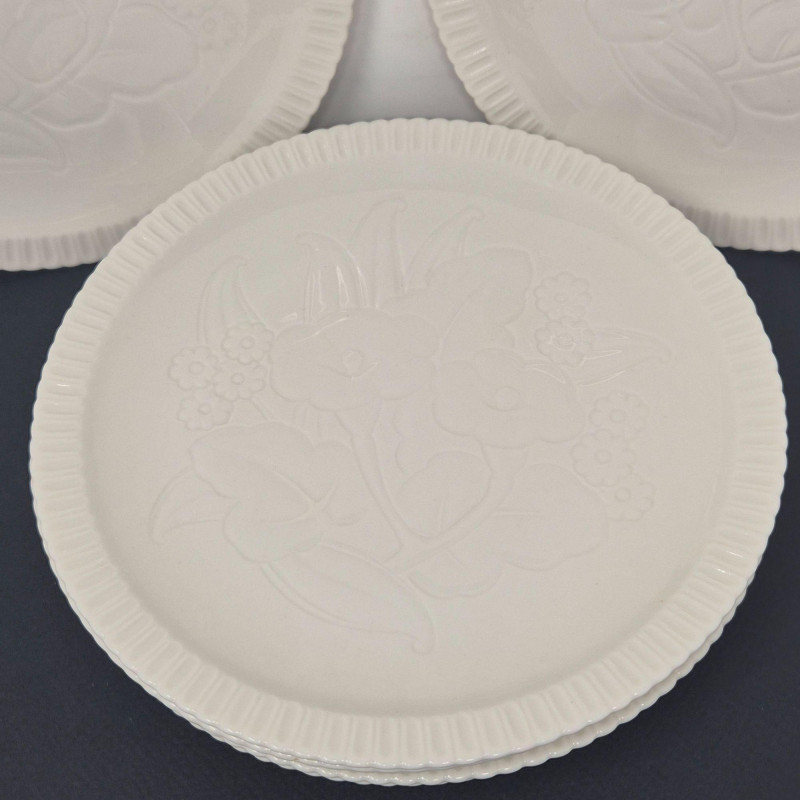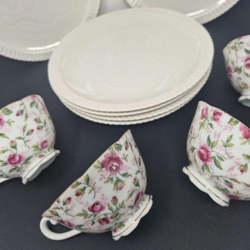 A charming, mix‑and‑match luncheon tea ensemble with classic vintage appeal. This lot includes six 8" Shelledge floral‑embossed luncheon/dessert plates by Syracuse China, each with elegant raised detailing perfect for a refined table setting. Complementing them are four Lefton China 637R‑N tea cups, beautifully hand‑painted with delicate florals and finished with gold trim.