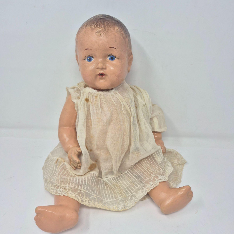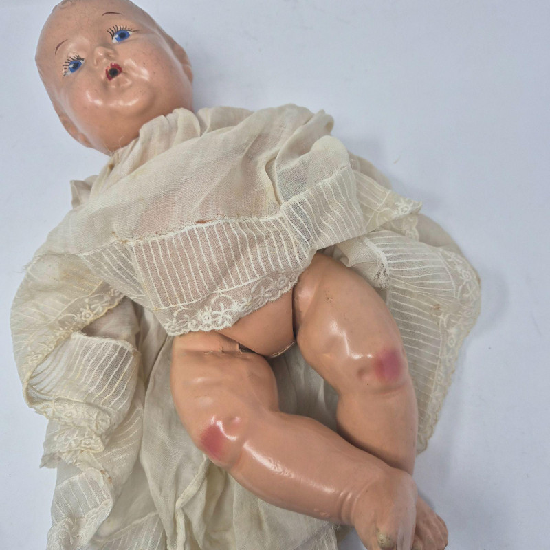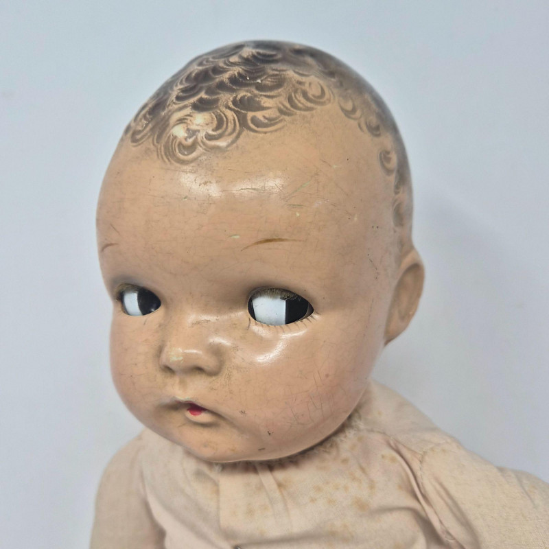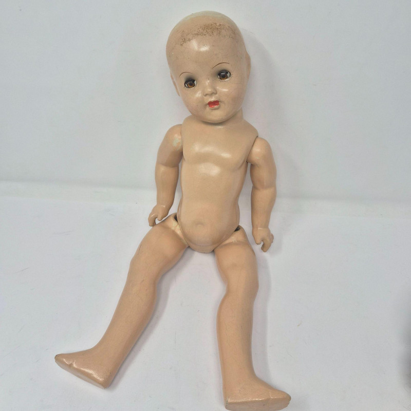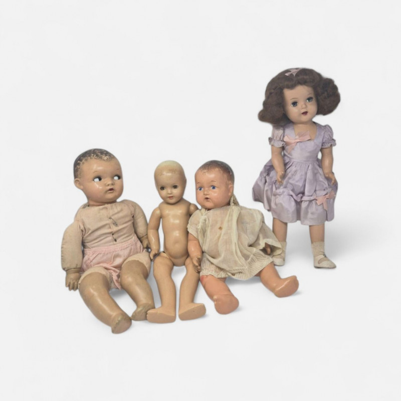 A nostalgic mix of 1930s–1950s composite dolls, ideal for restoration, repurposing, or creative craft projects. The lot includes a side‑looking baby doll with a composite head, arms, and legs paired with a soft fabric body, full of that classic early‑mid‑century charm. Dolls in this group range from 16" to 22", offering a variety of sizes and styles for doll artists, vintage enthusiasts, and makers who love giving old treasures new life.
